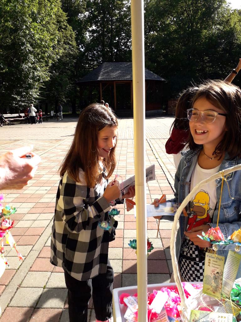 孩子们也被法轮功的美好所吸引。一个十二岁左右的男孩克里斯蒂(Cristi)学功后表示,他感受到能量。他要了两朵莲花,一朵给自己,一朵带给他的祖母。离开前,他拥抱了教他功法的法轮功学员。
