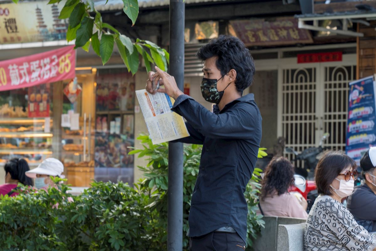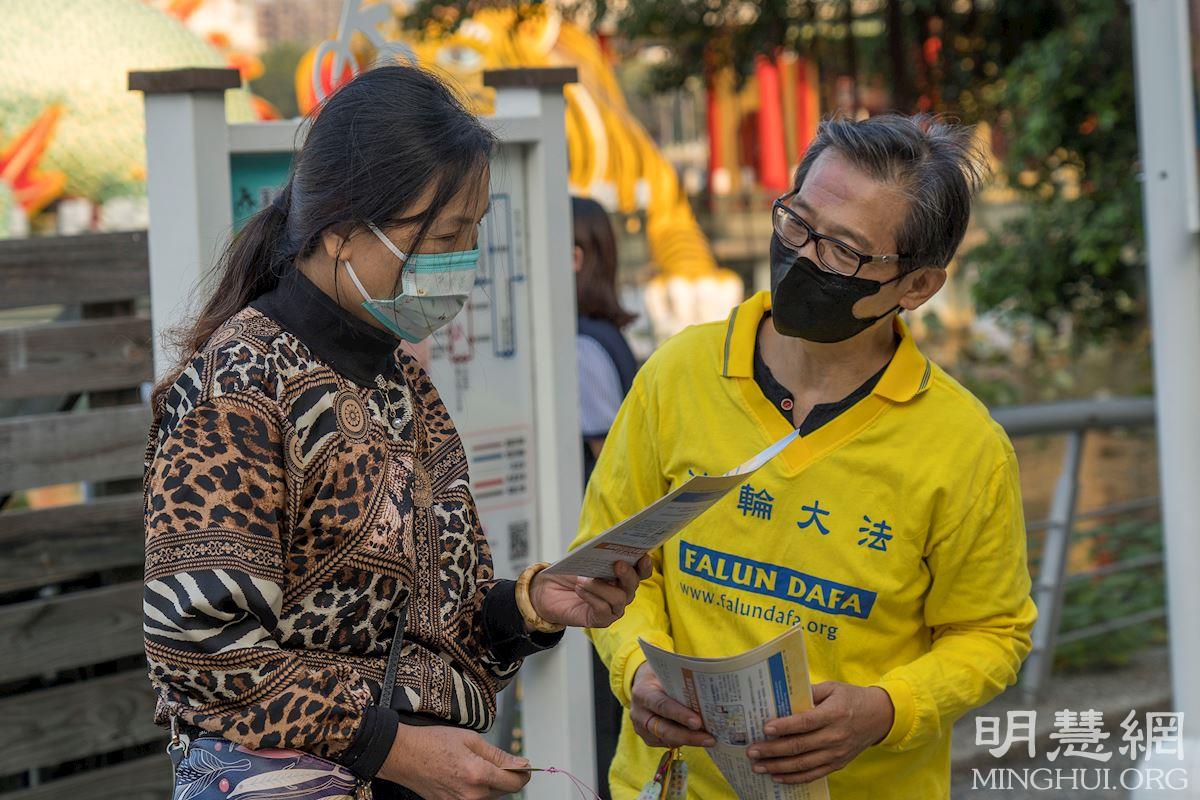 殷先生是一位工程师,手拿着法轮功真相资料观看功法演示许久,不知不觉中就跟学员一起比划起动作学炼。殷先生是因腿伤请休假,顺道来莲池潭看风景,在此巧遇法轮功弘法。