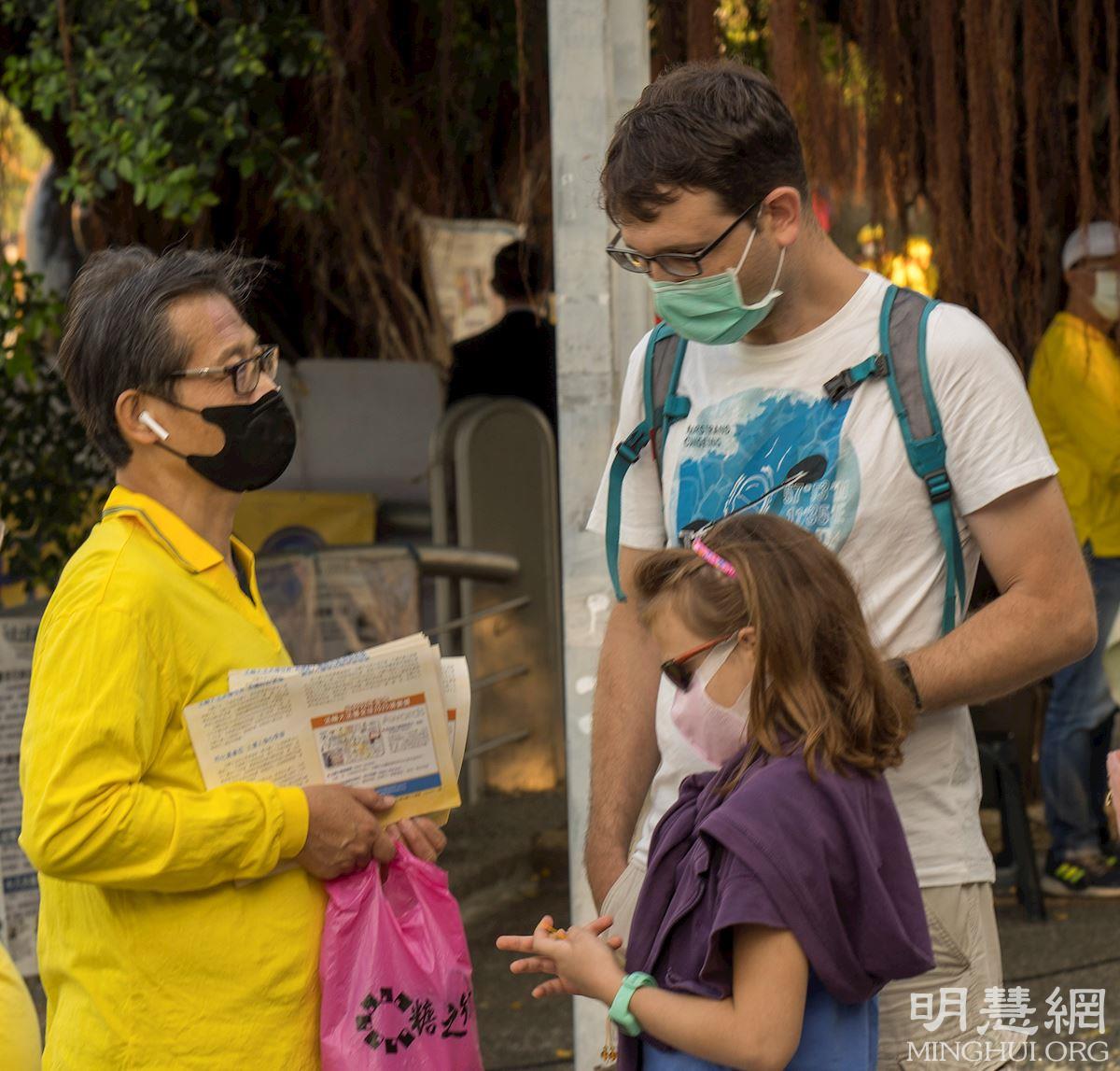 一位学员过去为他做简介,他听完后表示,对法轮功学员以这种方式展现法轮功的美好,他很认同学员的做法,认为可以破除中共对法轮功的污蔑宣传。