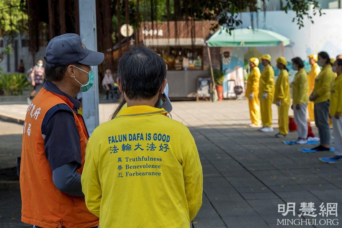 ![]() 图10:莲池潭风景区新任管理员吴先生(左)前来龙虎宝塔前广场了解法轮功 |