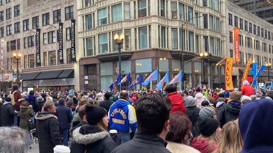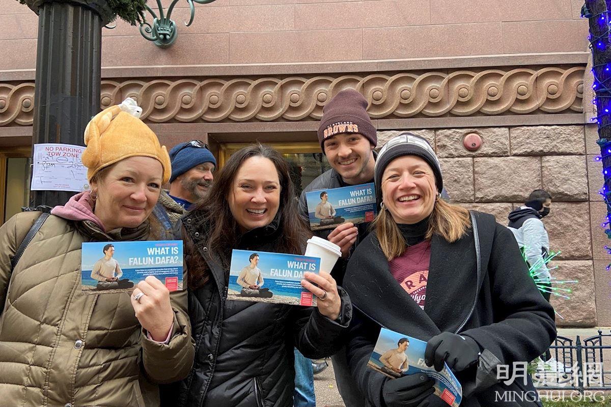 ![]() 图9:二零二一年十一月二十五日,一群来自俄亥俄州的游客观看芝加哥感恩节游行时,被法轮功游行队伍所吸引。 |