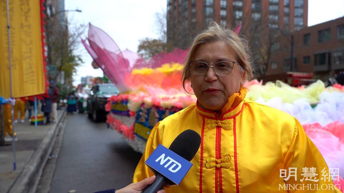法轮功学员丽萨·卢德克(Lisa Rudek)表示,她很荣幸有机会参与芝加哥感恩节游行。“我们法轮功学员修炼的是真、善、忍,我们都在修炼中身心受益,所以我们也想把这份美好分享给更多的人。”