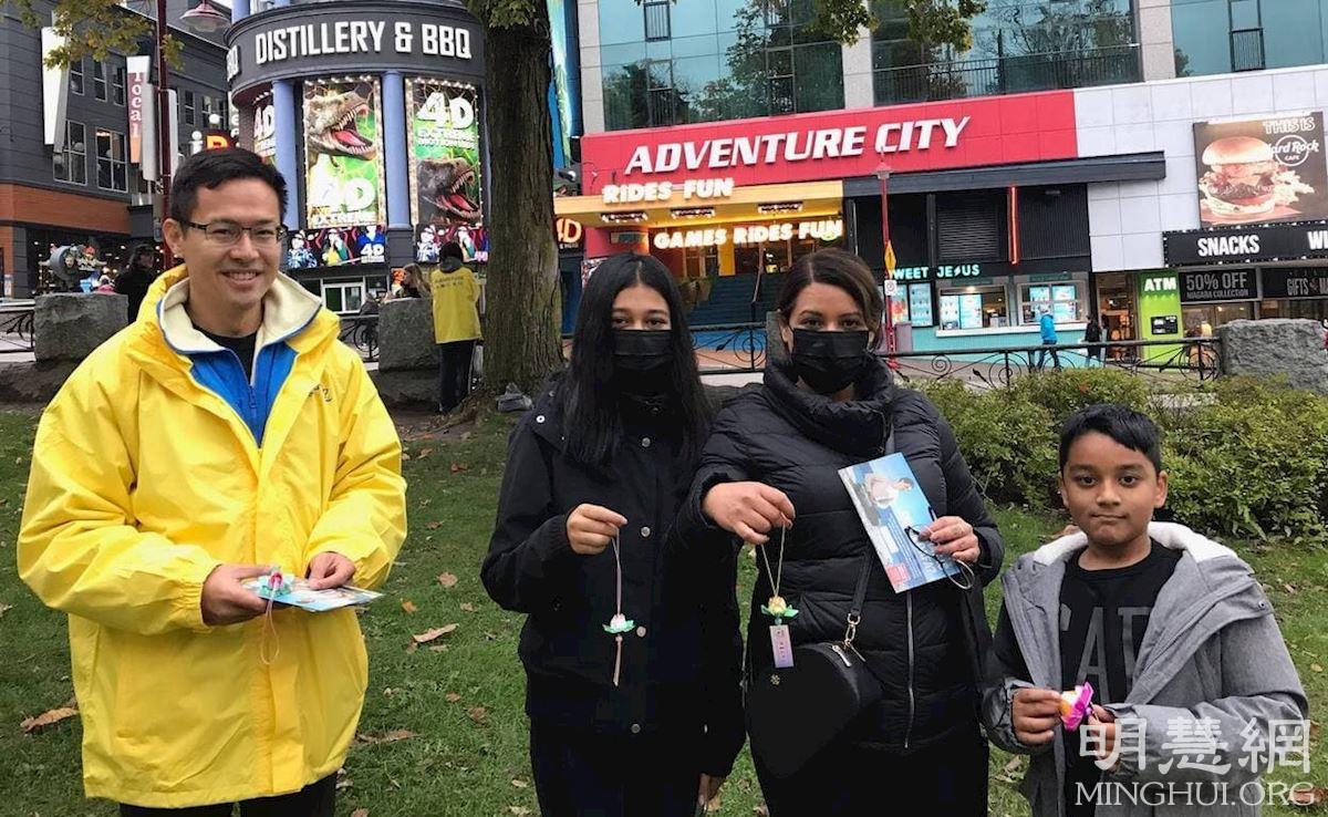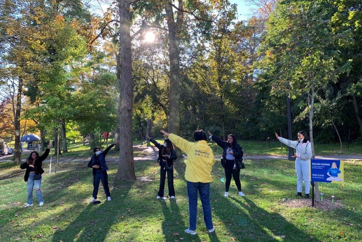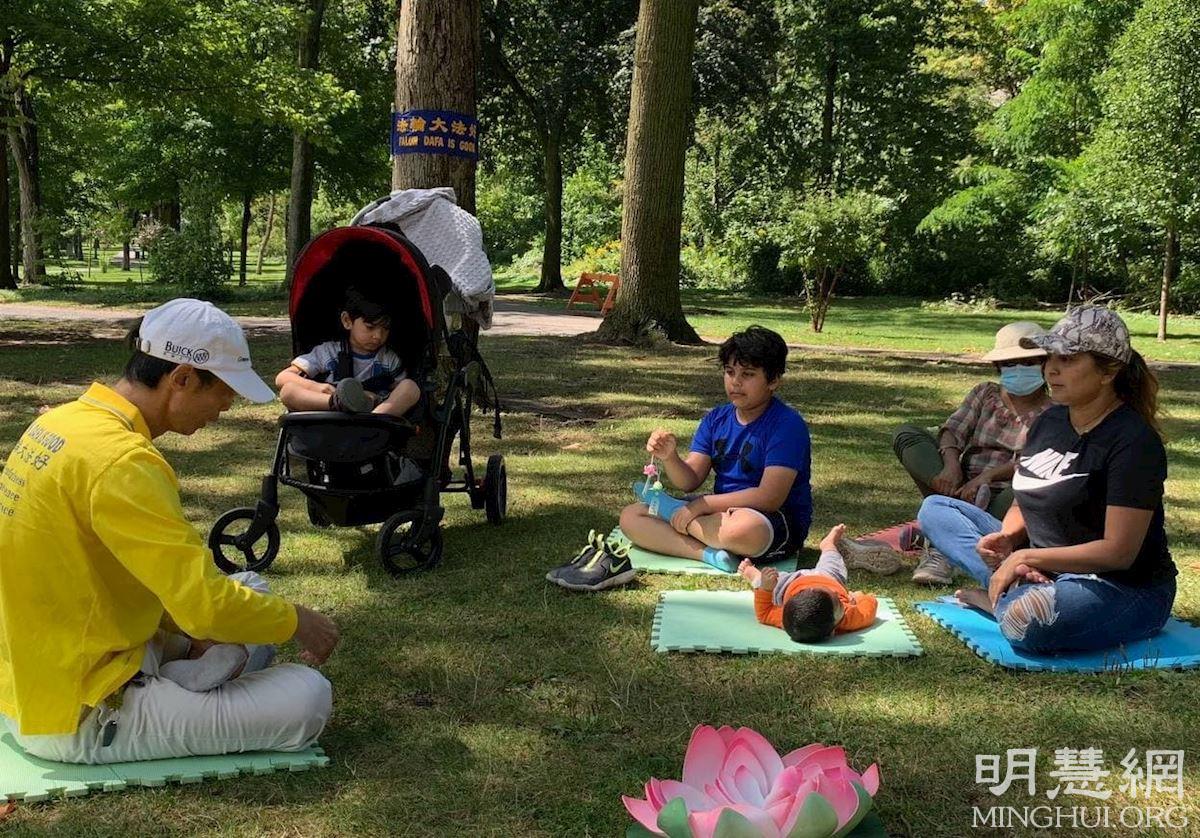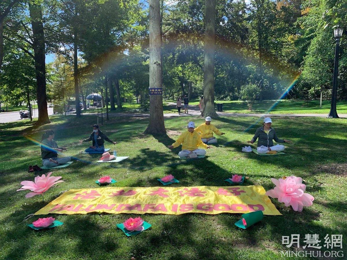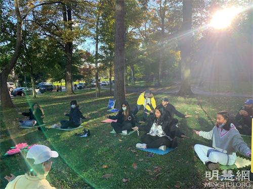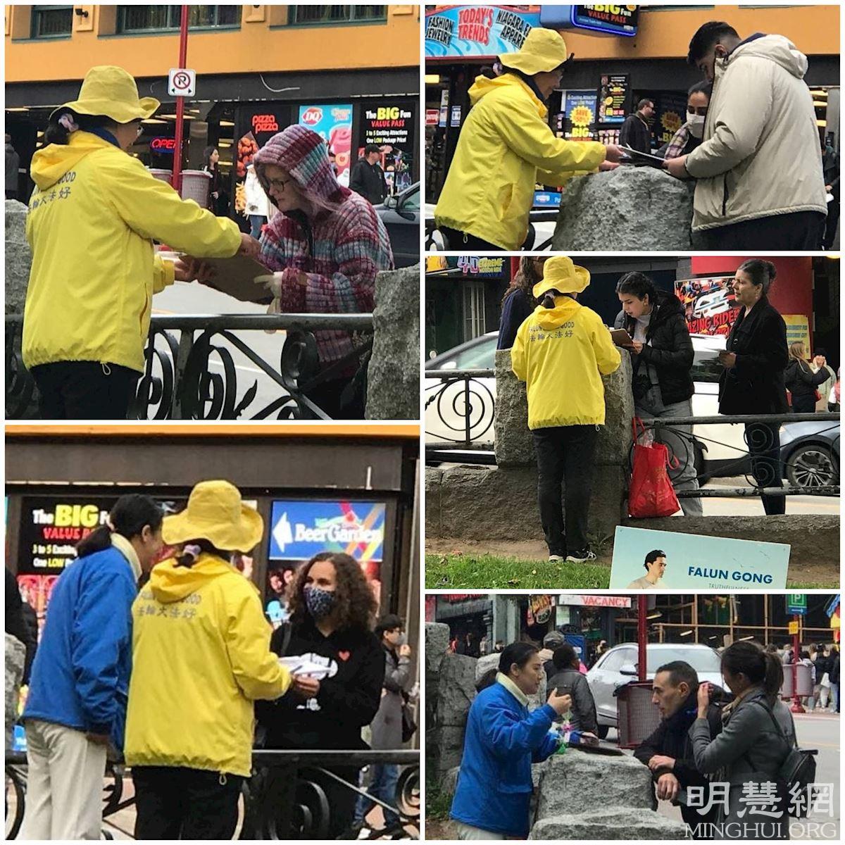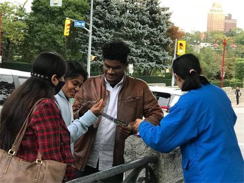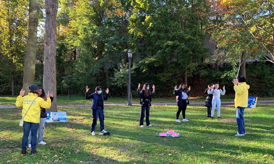 【明慧网二零二一年十一月三日】(明慧记者章韵报道)由加拿大多伦多法轮功学员坚守的尼亚加拉瀑布炼功点,每天都吸引很多游客到此学炼功法和了解真相,他们都非常庆幸在如今人心惶惶的世界中,能找到这么祥和平静的地方学炼这么神奇的功法,有的游客学完功法后感动到流泪;有的赞叹法轮大法太棒了;有的表示一定继续认真炼下去;还有不少游客纷纷签名支持法轮功反迫害