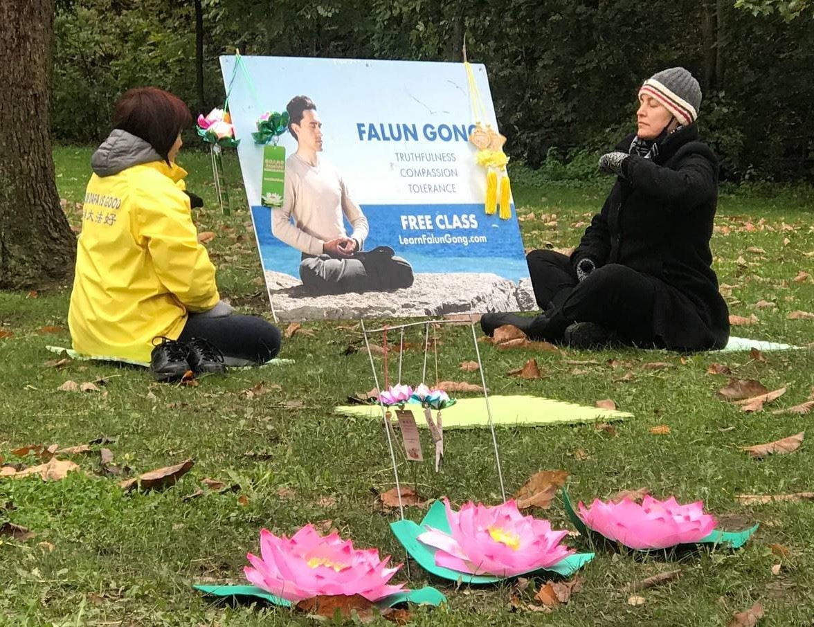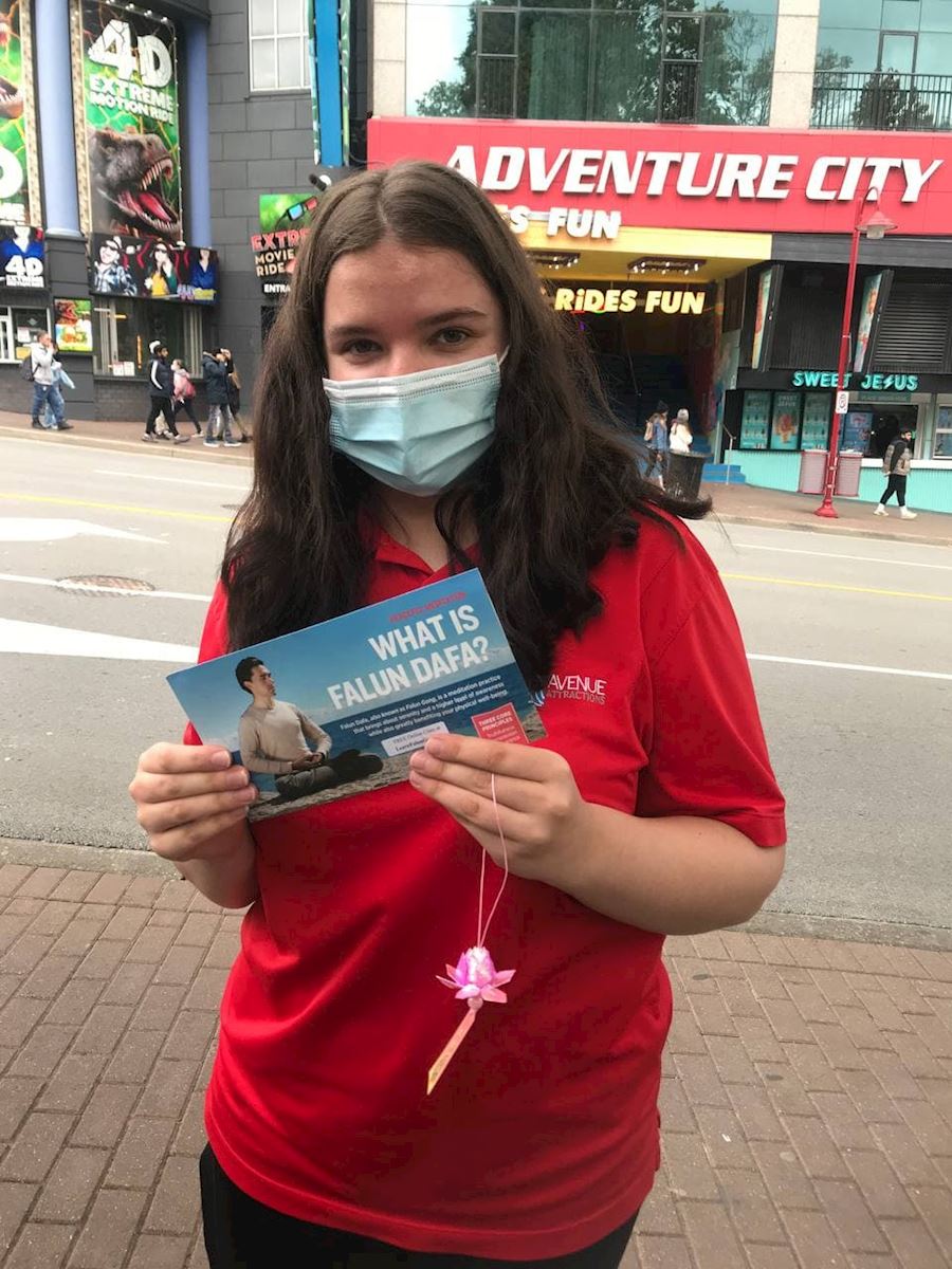 西人女士阿曼达(Amanda)居住在尼亚加拉瀑布市,在瀑布旁的赌场工作。学员十月十四日在真相点做功法演示打坐时,她静静地在学员身边的一个坐垫上坐了下来,学员于是就给她介绍法轮大法。她说:“一直看见你们在这里炼功,非常平和、美好,总想过来尝试,今天终于有机会了。”她说自己一只胳膊摔伤过,现在还经常疼痛。