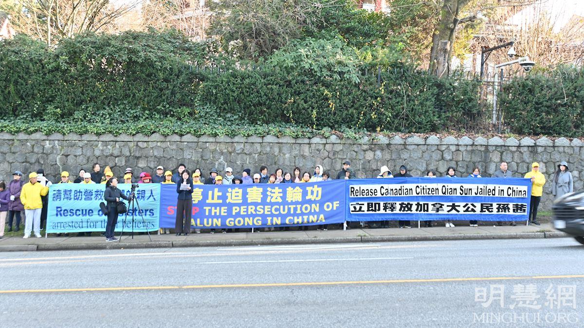 '图1~2:二零二一年十二月八日,温哥华部份法轮功学员在中领馆前集会,要求中共释放被关押的加拿大公民,并制裁迫害人权的中共官员。(明慧网)'
