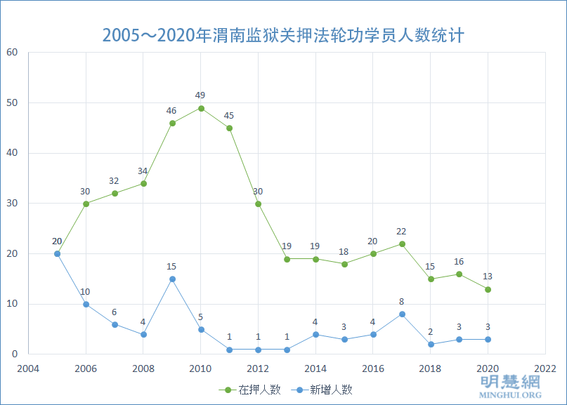 ![]() 图:2005~2020年渭南监狱关押法轮功学员人数统计 |