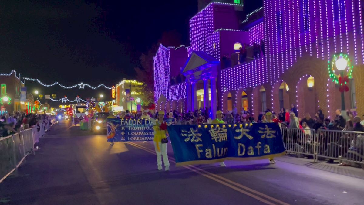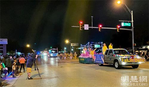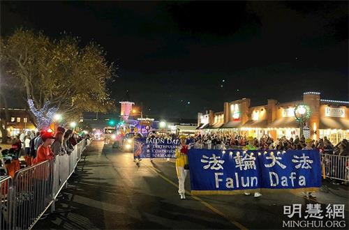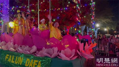 法轮功学员的队伍由横幅队伍和花车组成,是百个团体中唯一的亚裔团队。学员们举着“法轮大法”、“真、善、忍”、“法轮大法好”等色彩鲜艳的横幅,花车上还有学员在展示优美、舒展的法轮功功法,整个队伍散发着祥和的能量。很多观众对着法轮功学员队伍挥手致意,大声的喊着:“法轮大法”、“太漂亮了”,“圣诞快乐”。
