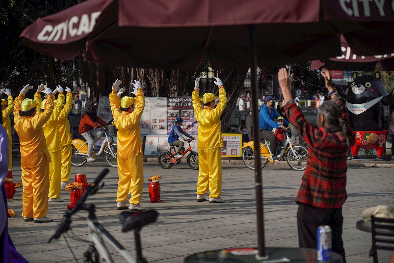 【明慧网二零二一年二月三日】(明慧记者孙柏、苏容台湾高雄采访报道)庚子年接近尾声,在全球武汉肺炎疫情仍然肆虐下,幸运的台湾不受疫情之害。二零二一年一月三十一日周日下午,高雄部份法轮功学员于著名旅游景点“莲池潭龙虎塔”边广场炼功弘法,仙女队和腰鼓队以真相传单和有“法轮大法好,真善忍好”九字真言的小卡片莲花迎接游客。经过的人们感受到一股祥和的能量,驻足了解详情并拍照留念。多位游客和居民现场学功并询问炼功点资讯,有的表示马上要去参加九天班学法轮功。