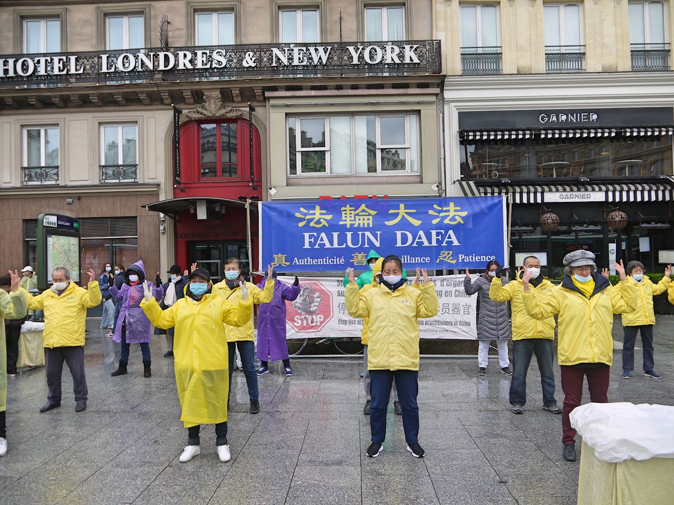 ![]() 图1:法轮功学员在巴黎第九区的哈佛广场演示功法。 |