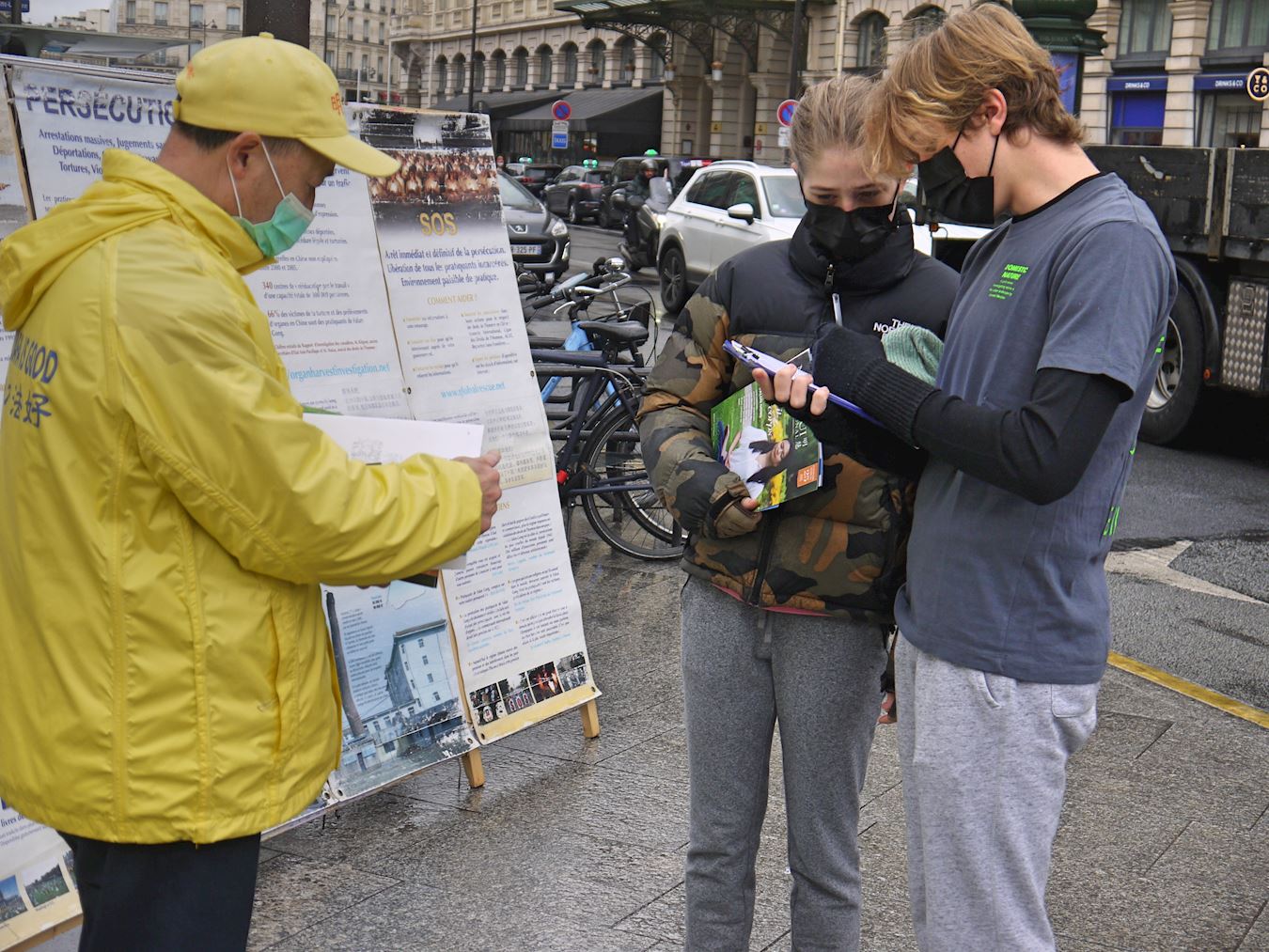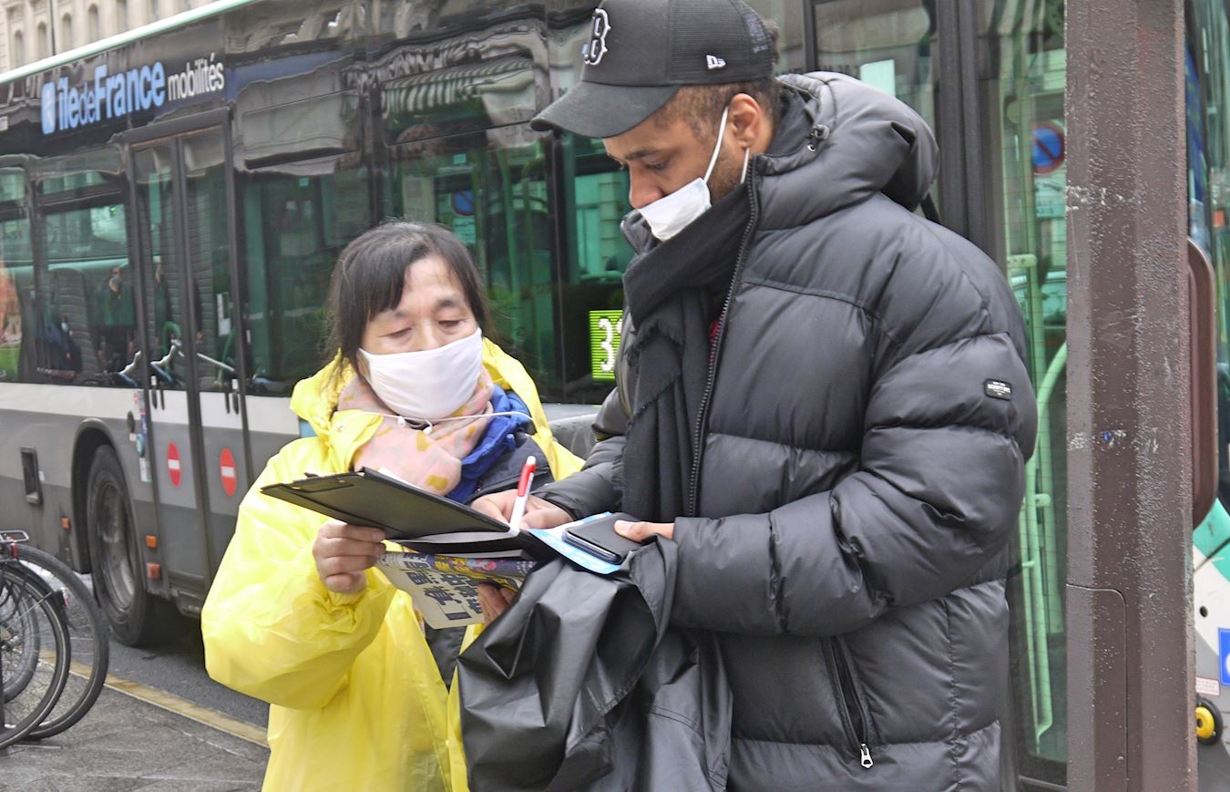得知中共迫害修炼真、善、忍的法轮功的学员,对他们进行酷刑折磨,甚至活体摘取器官,人们感到震惊、气愤,纷纷在征签表上签字。有的说:“中共是恶魔!”有的称赞法轮功学员:“你们的行动很棒,祝贺你们!”有的人了解真相后,现场学炼法轮功的五套功法。还有的索要巴黎炼功点的信息。