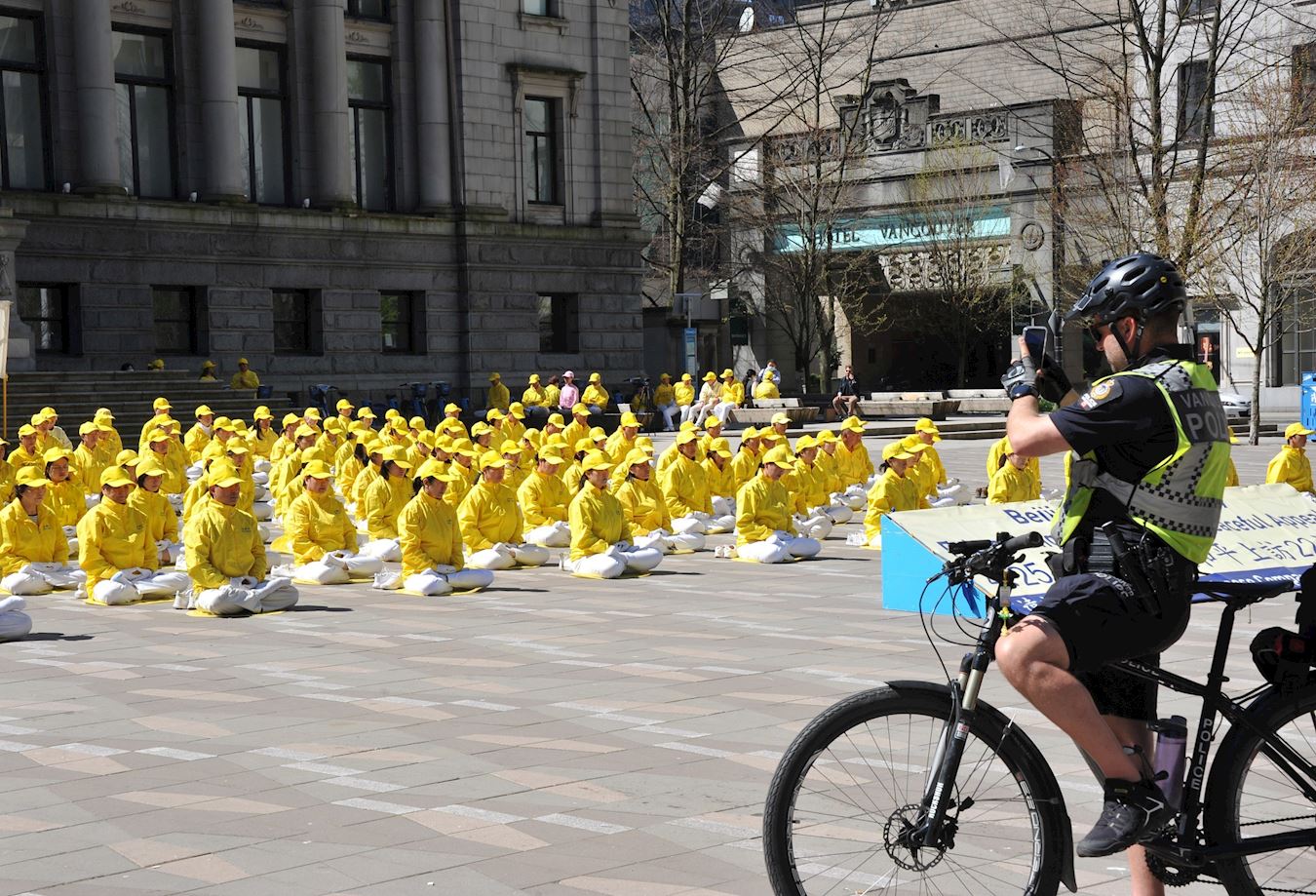当天的温哥华,天气晴朗,气候宜人。法轮功学员集体炼功的祥和场面吸引着人们的注意,过往车辆也频频鸣笛致意。