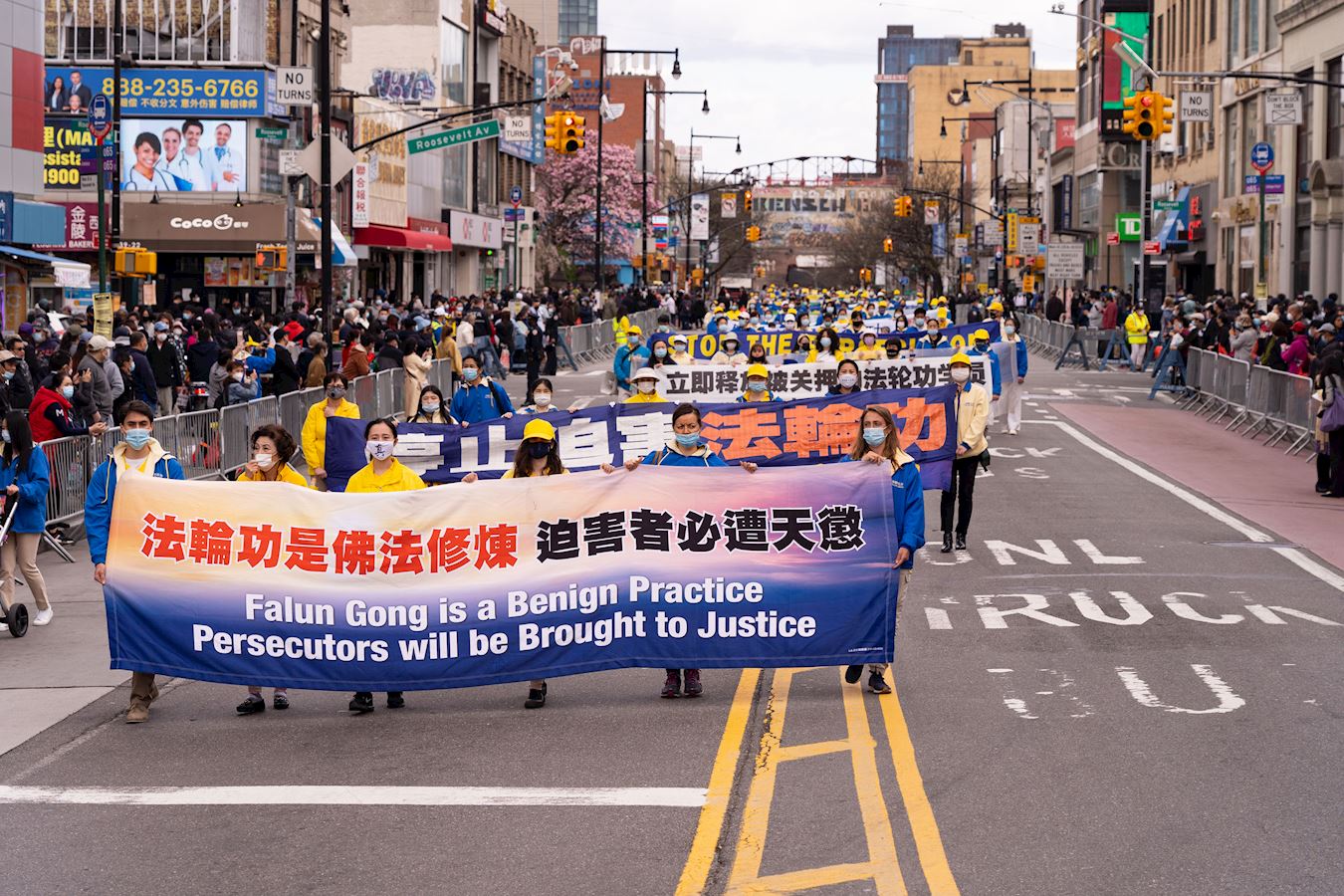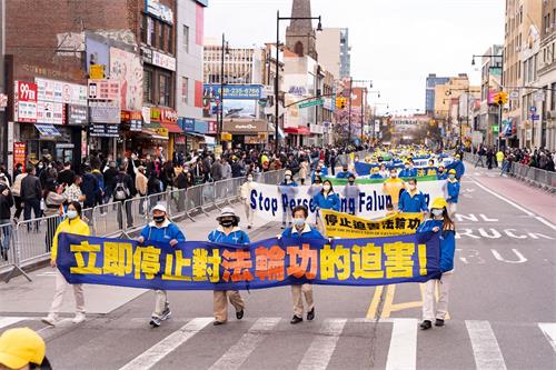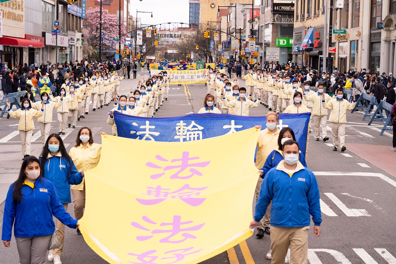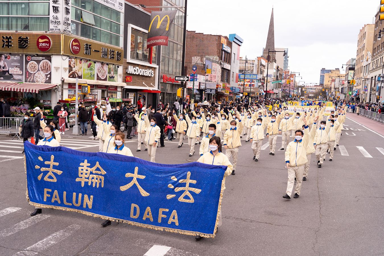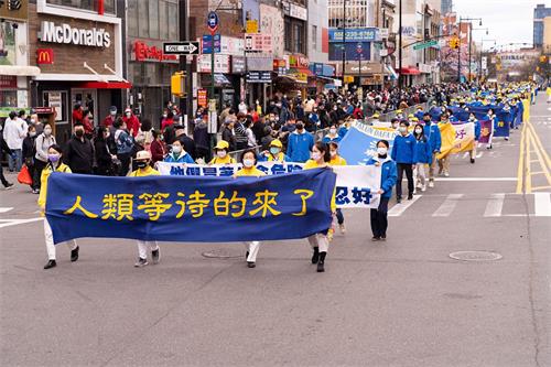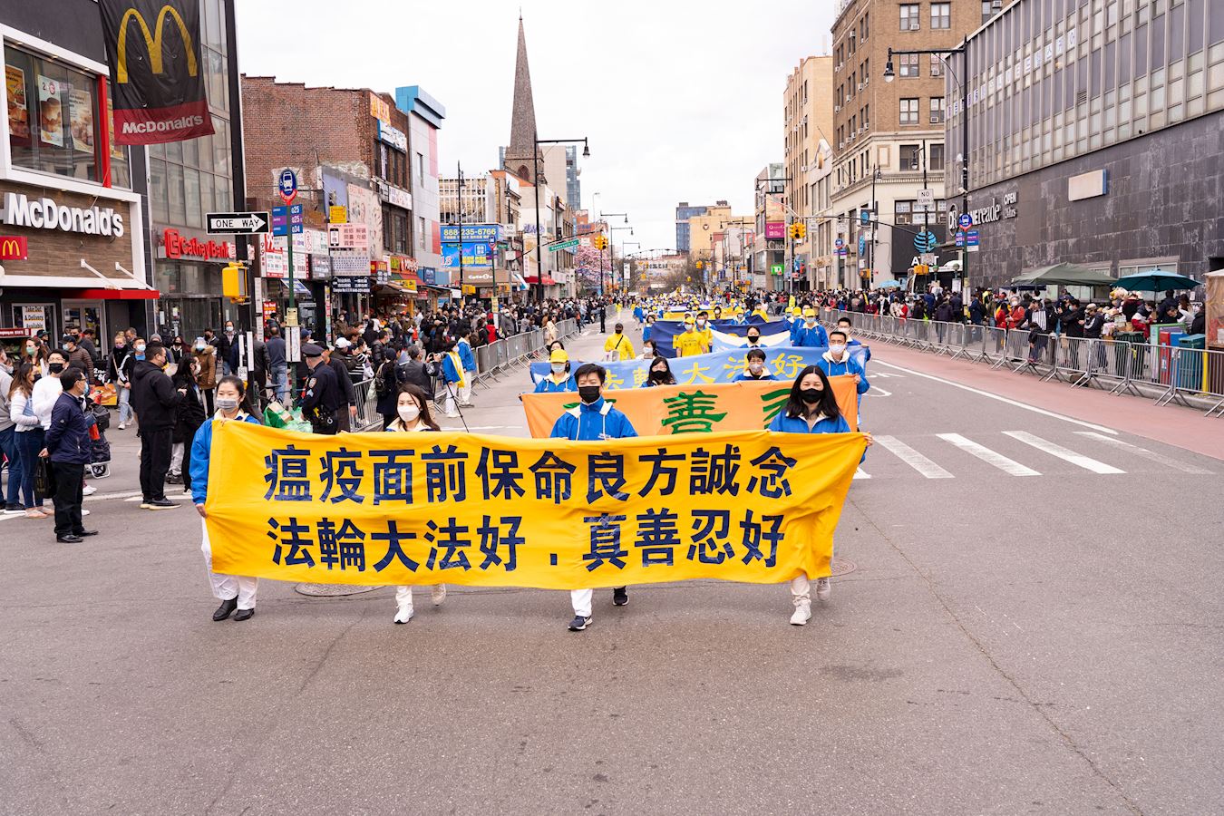 游行队伍分三大方阵:“法轮大法好”,“停止迫害法轮功”,“声援3.75亿勇士退出中共党团队”。游行当中法轮大法的音乐《普度》响彻在法拉盛的缅街上空。上千名法轮功学员举着各式横幅,向世人讲述着大法的美好,中共的邪恶迫害和3.75亿中国人退出中共党团队为自己选择美好未来的壮举。在瘟疫仍在肆虐的今天,法轮功学员再次为民众送去福音,期盼世人牢记“法轮大法好,真善忍好”,拒绝中共,远离瘟疫,获得平安。