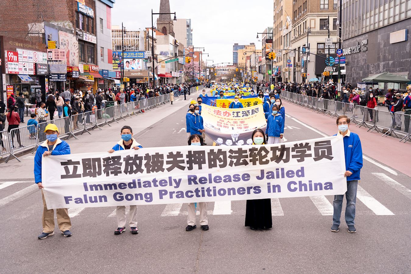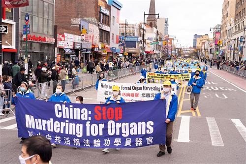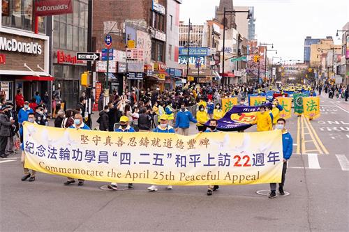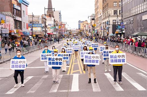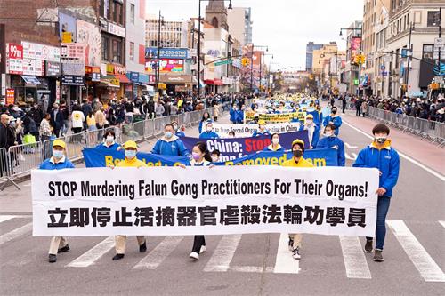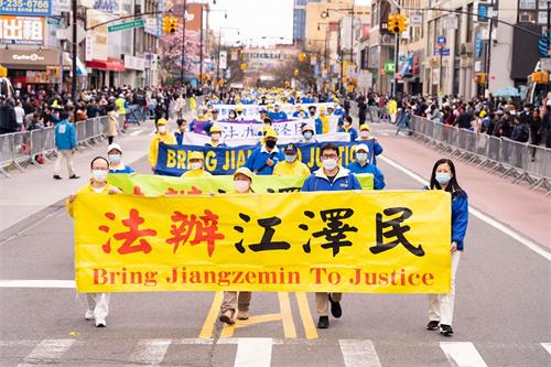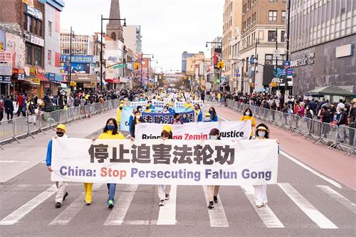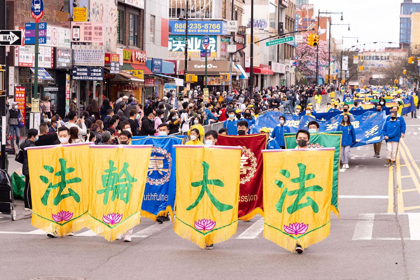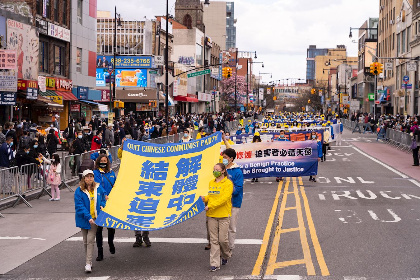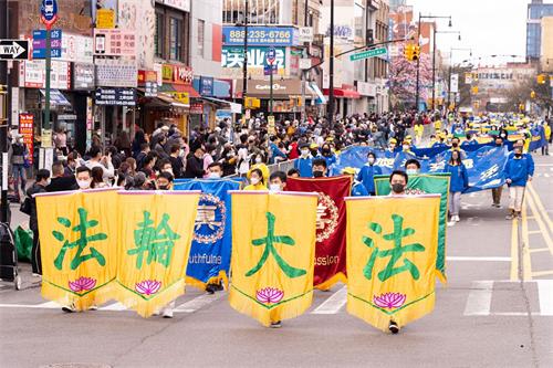 游行队伍分三大方阵:“法轮大法好”,“停止迫害法轮功”,“声援3.75亿勇士退出中共党团队”。游行当中法轮大法的音乐《普度》响彻在法拉盛的缅街上空。上千名法轮功学员举着各式横幅,向世人讲述着大法的美好,中共的邪恶迫害和3.75亿中国人退出中共党团队为自己选择美好未来的壮举。在瘟疫仍在肆虐的今天,法轮功学员再次为民众送去福音,期盼世人牢记“法轮大法好,真善忍好”,拒绝中共,远离瘟疫,获得平安。