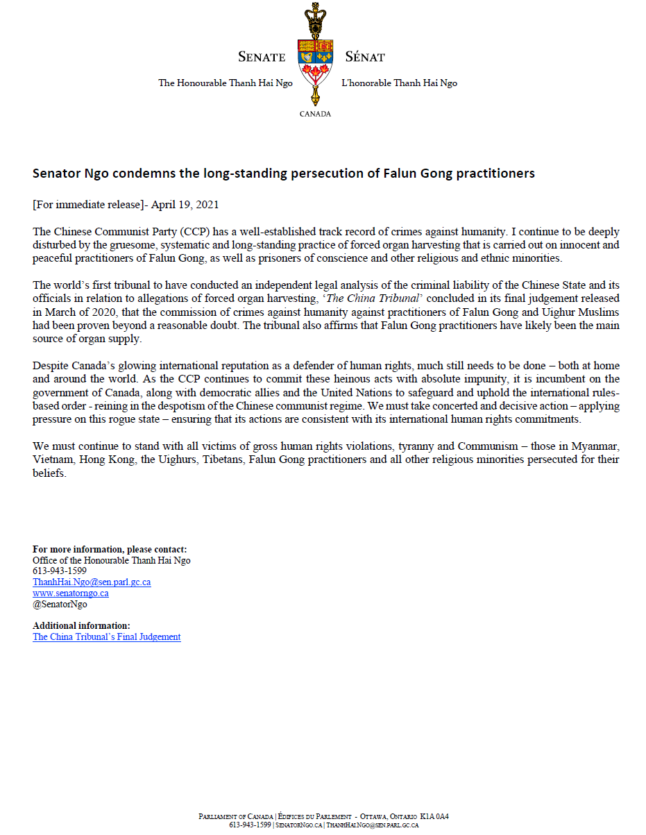 ![]() 图:加拿大参议员吴蓝海(Thanh Hai Ngo)在二零二一年的“四二五”前夕发表声明,支持法轮功学员,谴责中共迫害 |