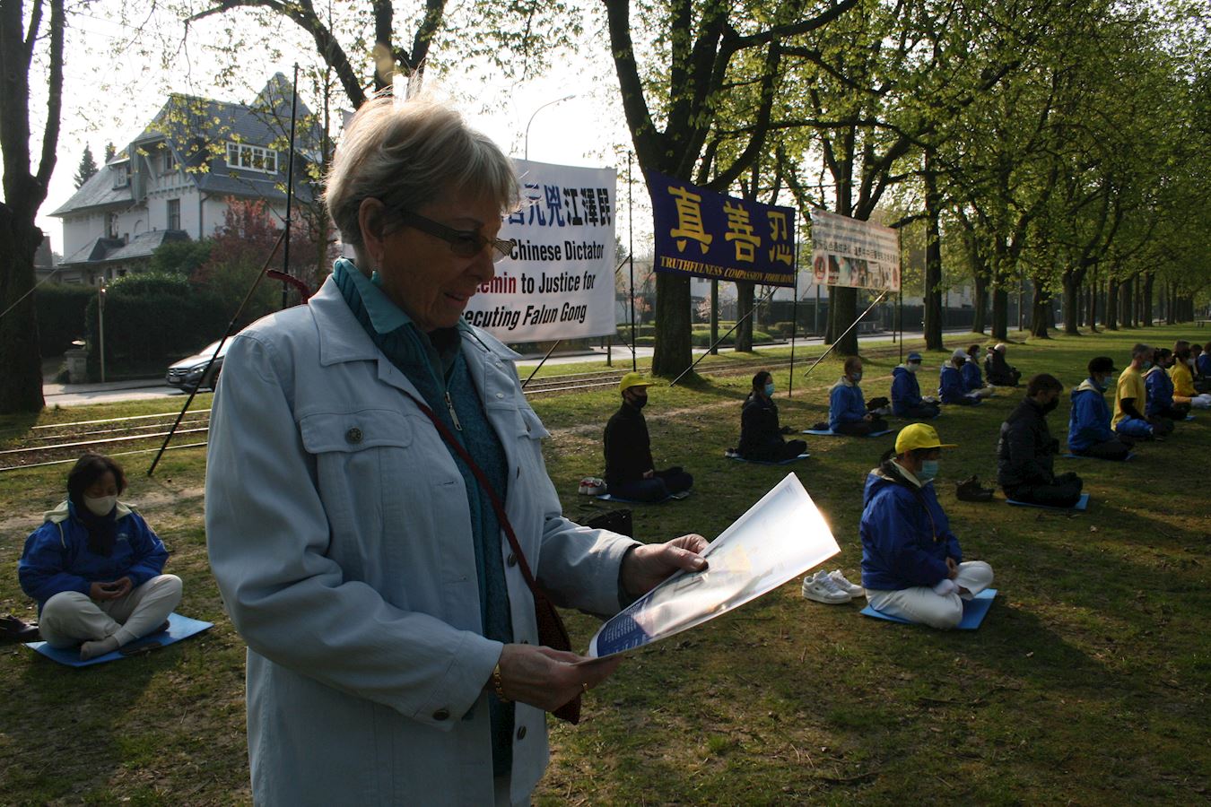 马滕斯太太(Martens)说:她住在中使馆后面的街区,已经知道中共迫害法轮功的真相,迫害太邪恶了。她说自己和丈夫都支持法轮功学员反迫害。