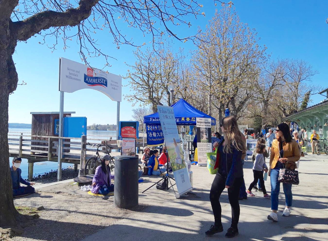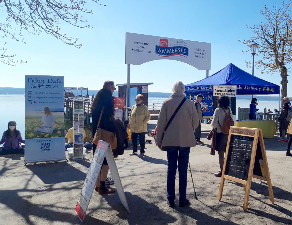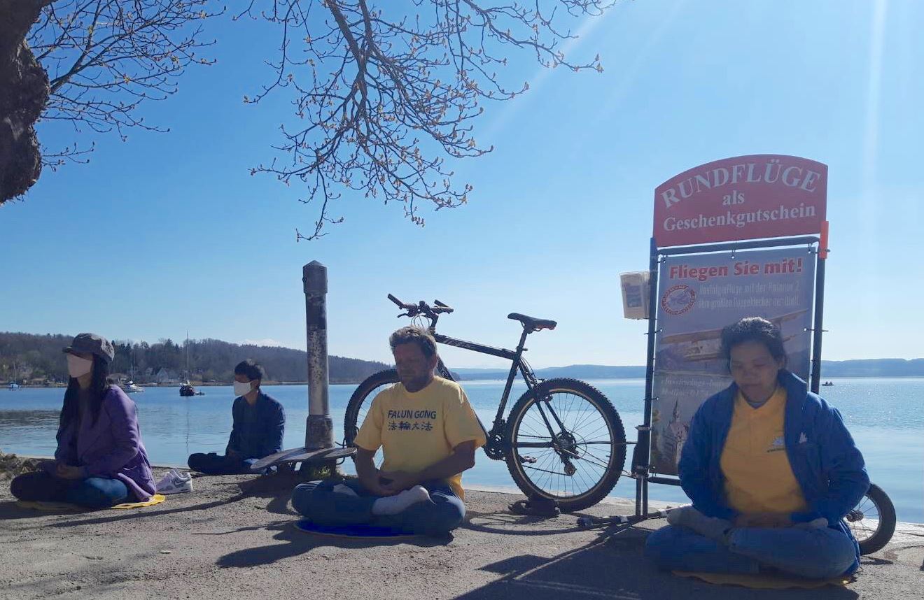 【明慧网二零二一年四月二十四日】(明慧德国记者站报道)阿莫湖(Ammersee)是德国第六大湖,位于慕尼黑以西,湖光清秀,是旅游和散步的好去处。二零二一年四月二十三日的阿莫湖畔小镇赫尔兴,春风和煦、阳光灿烂,伴随着祥和的音乐,一组静静炼功的人吸引着湖边散步人的目光。