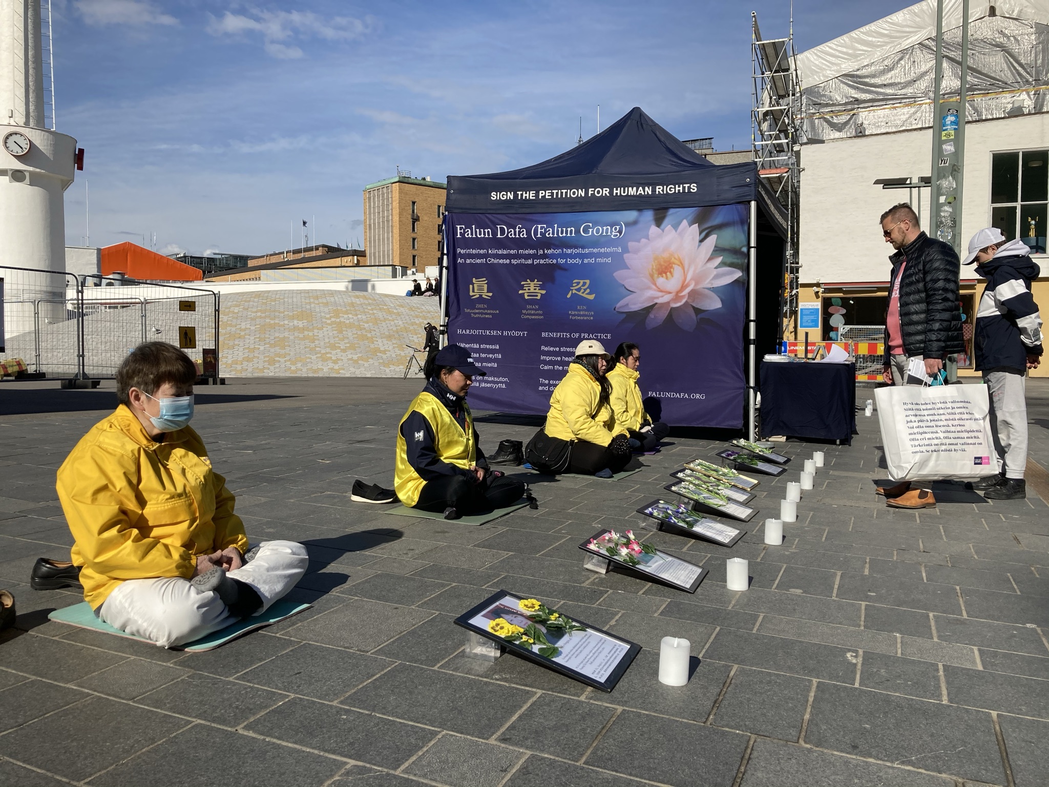 ![]() 图2:芬兰法轮功学员在市中心進行烛光纪念活动 |