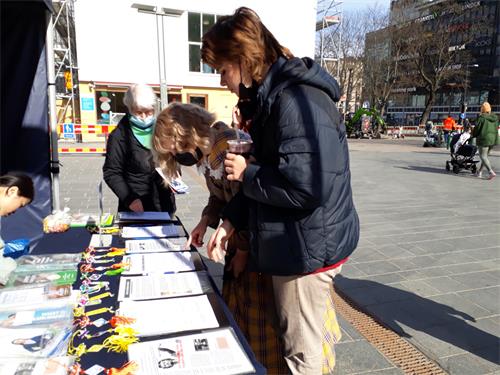 大使馆前和平抗议活动结束后,一位女士跟她的母亲出来晒太阳。学员递给她们一份资料说:“我们今天的活动,是为了纪念‘四·二五’活动,制止中共迫害法轮功。”女士说:“法轮功的事情我知道。”她打开传单,很仔细地跟年迈的母亲讲述法轮功的真相。