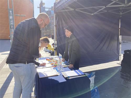 在医院工作的爱沙尼亚人弗雷德(Fred)和他的朋友科特(Keit)跟学员聊了起来。“中共就是一个独裁统治国家,做了非常多的坏事。”科特问:“你们需要多少的签名?”学员回答道:“我们已经征签了20多年,希望越多越好,直到迫害结束。”他恍然大悟道:“我知道了,就是让更多的人知道迫害。”