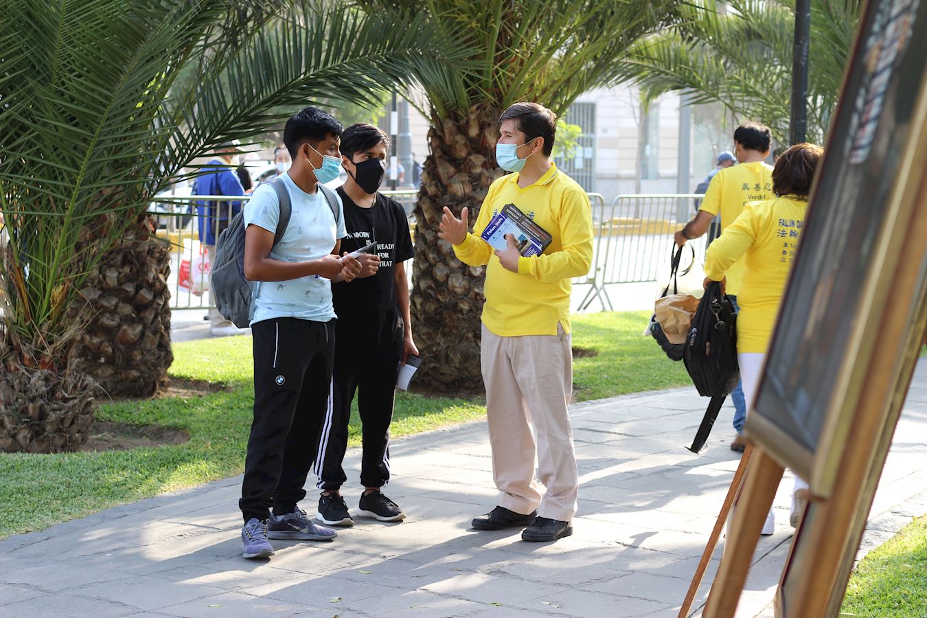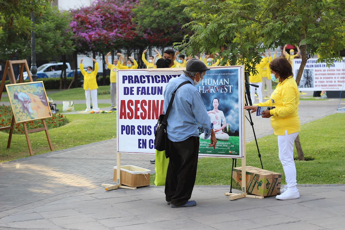 活动中,秘鲁学员通过扩音器向人们介绍什么是法轮功,为什么今天大家要聚在这里:一九九九年四月二十五日,逾万名法轮功学员到北京信访办上访请愿,二个月后,中共动用国家机器对法轮功展开铺天盖地的造谣、污蔑、残酷迫害,迫害至今二十二年,仍在继续。学员呼吁大家一起帮助制止迫害。