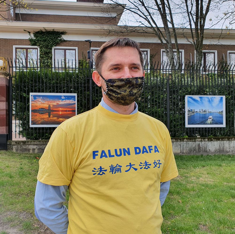 波兰法轮功学员Przemysław先生,一大早专程开车从波兰南部来到华沙,就是为了在“四·二五”二十二周年之际能够参加纪念活动,表达心声。他说:“我是在大学毕业那年在波兰获知法轮大法的,刚一接触我就感到这是难得的能让身体和心灵同时受益的好功法,可是这么好的功法在中国却是受到中共残酷镇压的。一九九九年四月,中国的杂志刊登污蔑法轮功的文章,警察还抓捕反映情况的法轮功学员,为此引发了万名法轮功学员前往北京国务院信访办公室和平上访。在整个上访过程中,学员们没有任何过激行为,却被中共诬陷为‘围攻中南海’,并在七月二十日后全面升级对法轮功的迫害。二十二年过去了,法轮功在反迫害中走向全世界,真善忍原则被越来越多的人认同,中共也一定会在迫害法轮功中走向灭亡。”