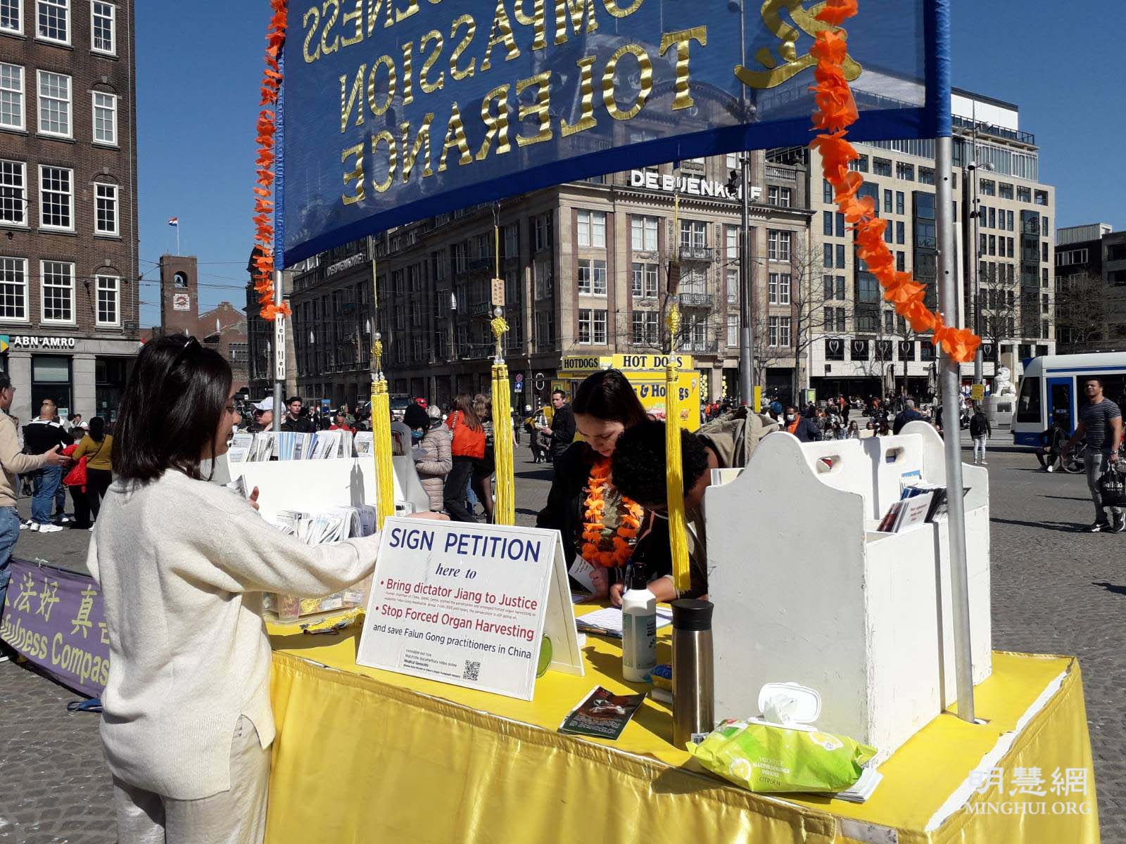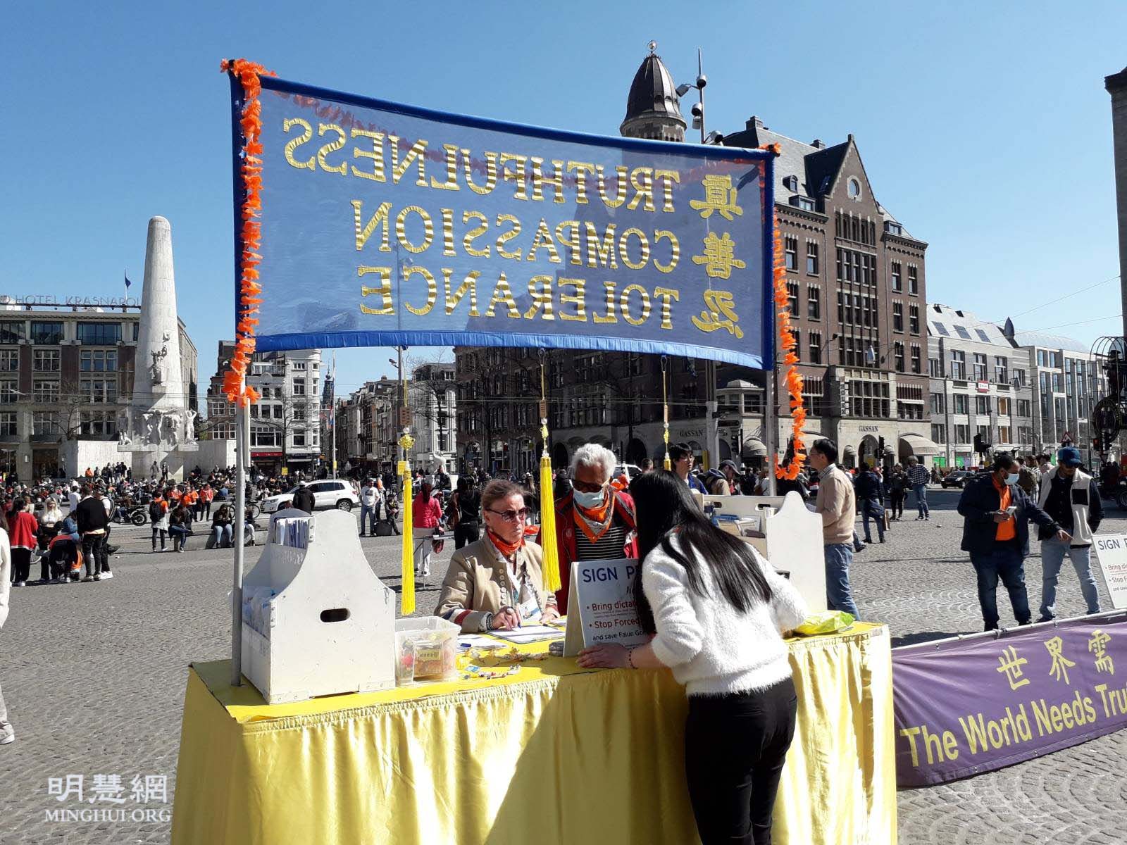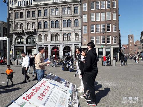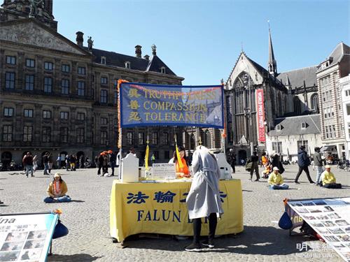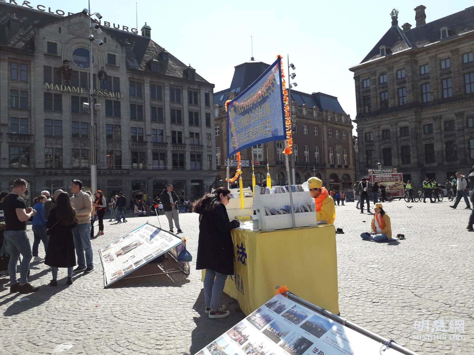 法轮功学员也在达姆广场举行弘法活动,活动得到阿姆斯特丹市政府的支持和批准。法轮功的弘法展位位于达姆广场中心位置,吸引了许多行人的目光。