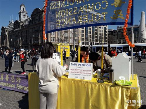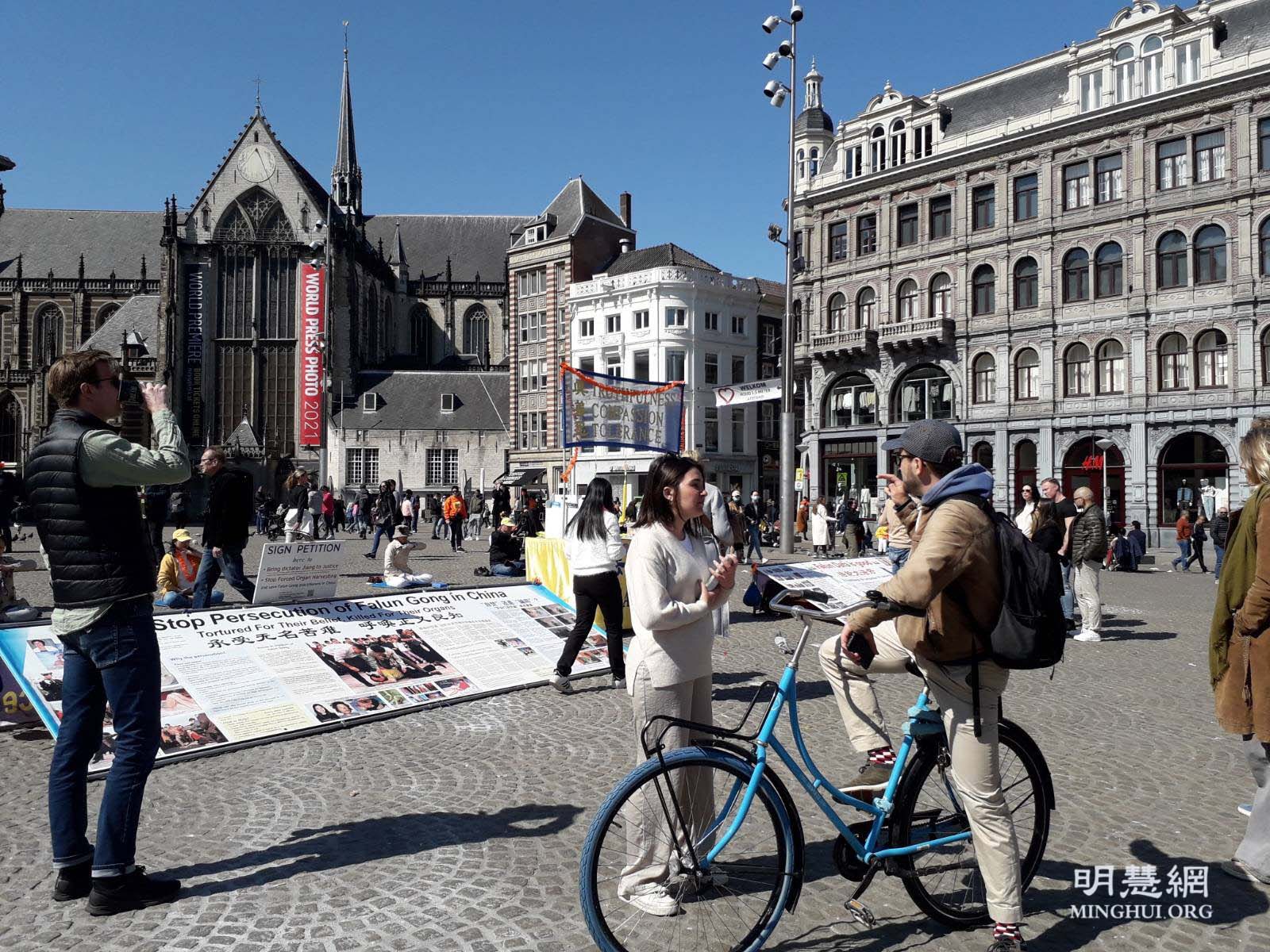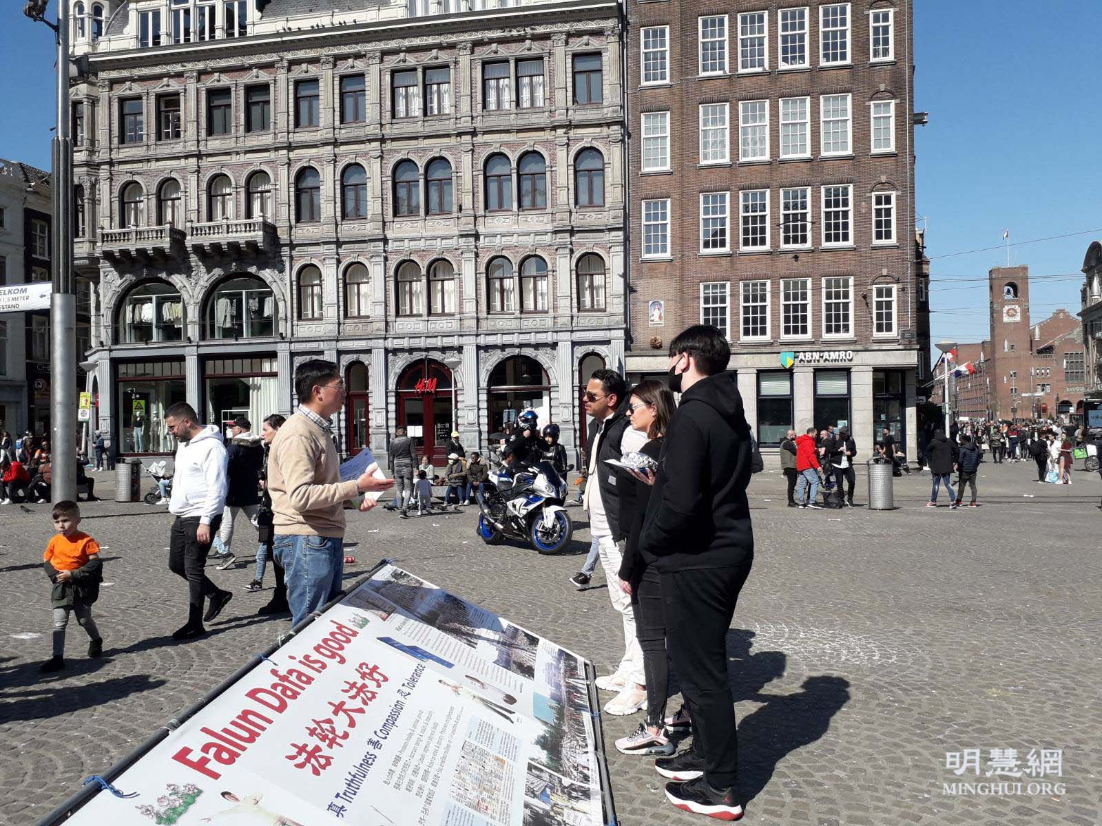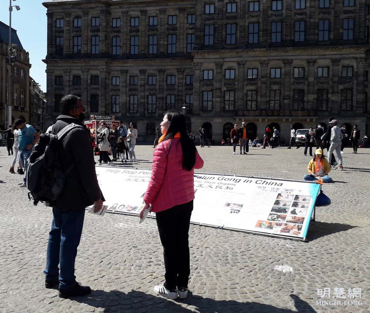 法轮功学员也在达姆广场举行弘法活动,活动得到阿姆斯特丹市政府的支持和批准。法轮功的弘法展位位于达姆广场中心位置,吸引了许多行人的目光。