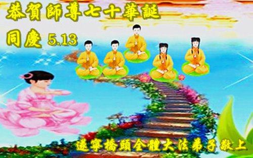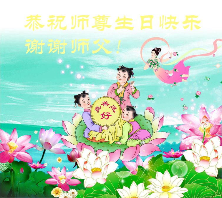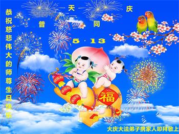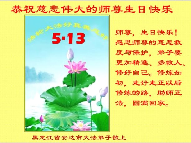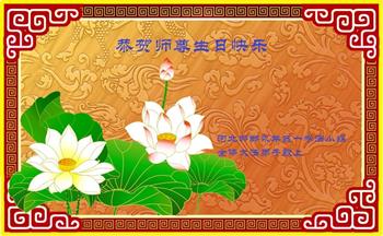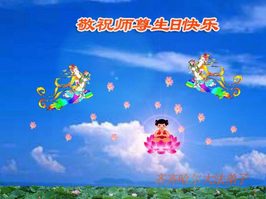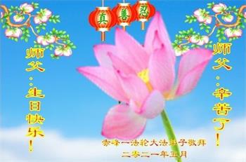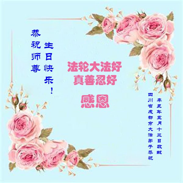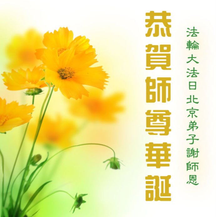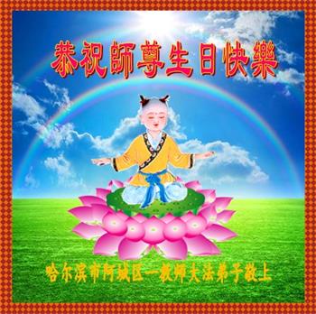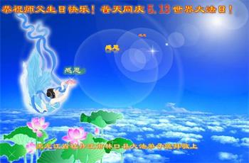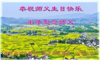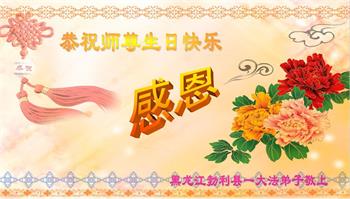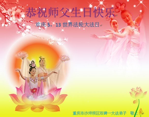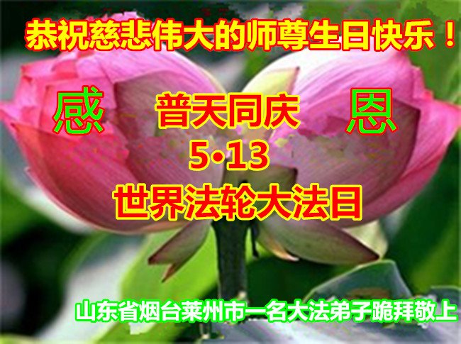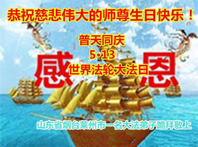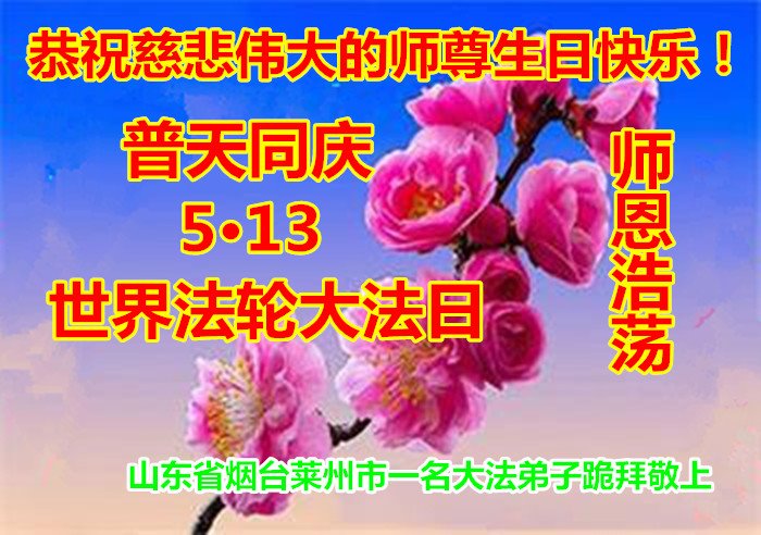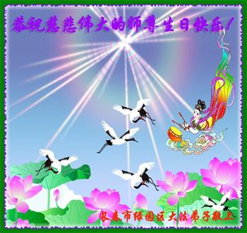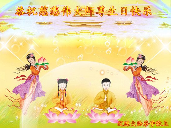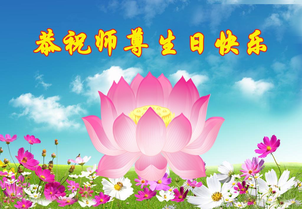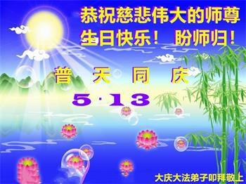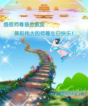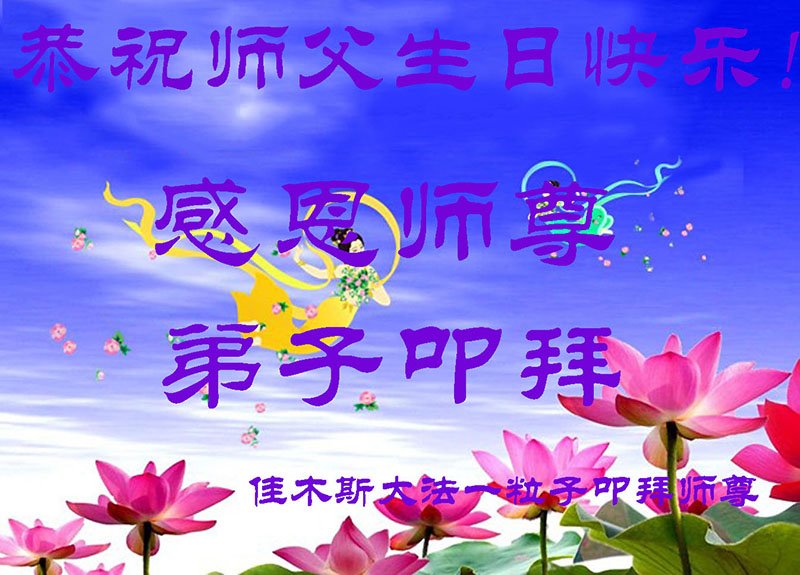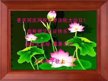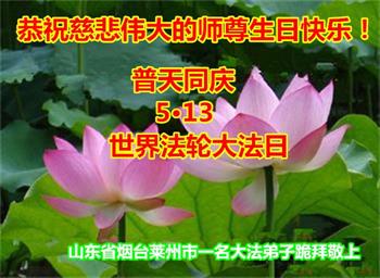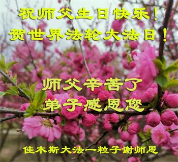 师尊您好!弟子恭祝师尊华诞!恭贺世界法轮大法日!在这普天同庆的日子里,弟子同歌同颂师尊之无量慈悲:感恩师尊把大法传给弟子,指引我们走上返本归真的大道;感恩师尊教导弟子做一个为他的生命,危难中不忘救度众生。弟子一定不忘使命,学好法,多救人,带领众生圆满随师还!弟子叩谢师恩!