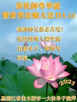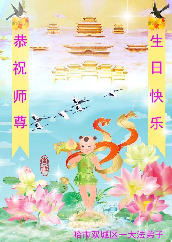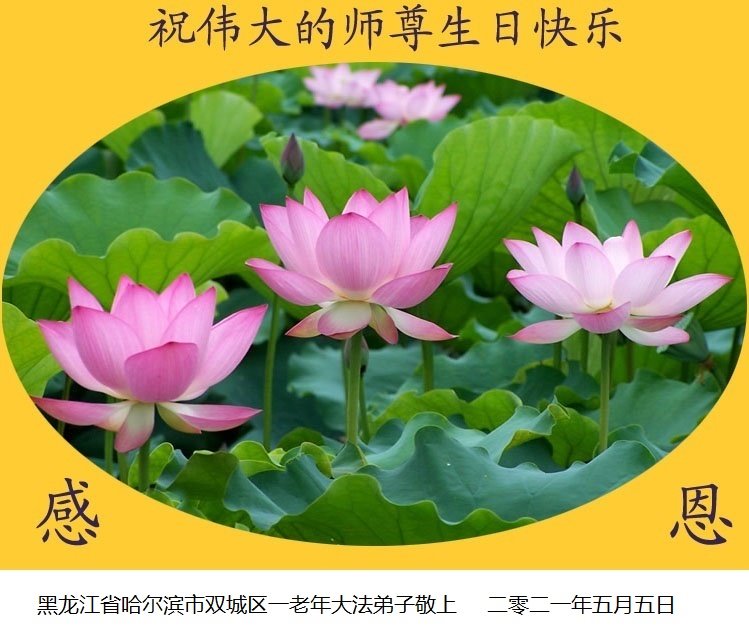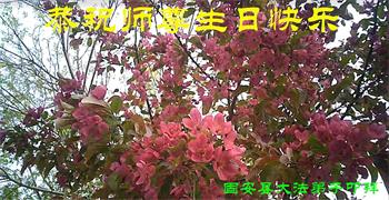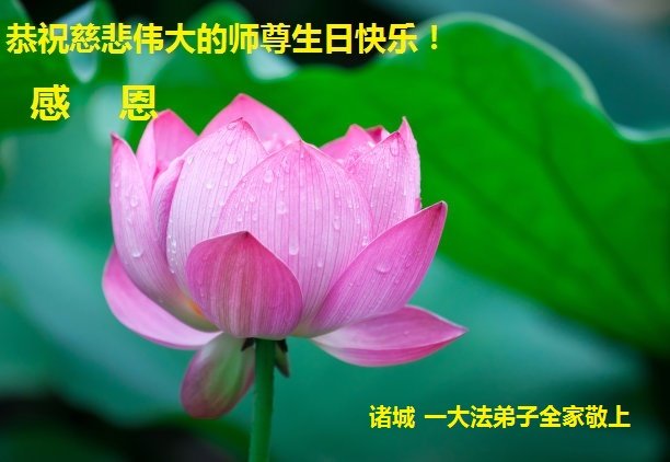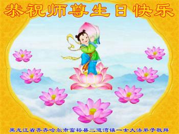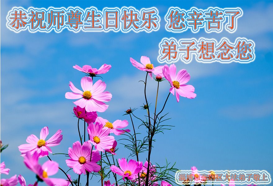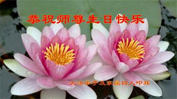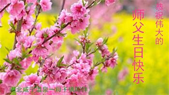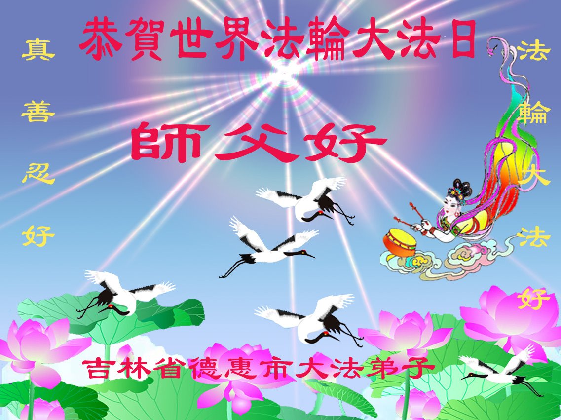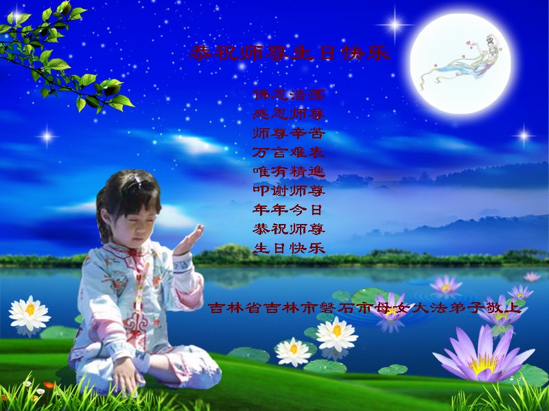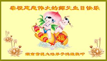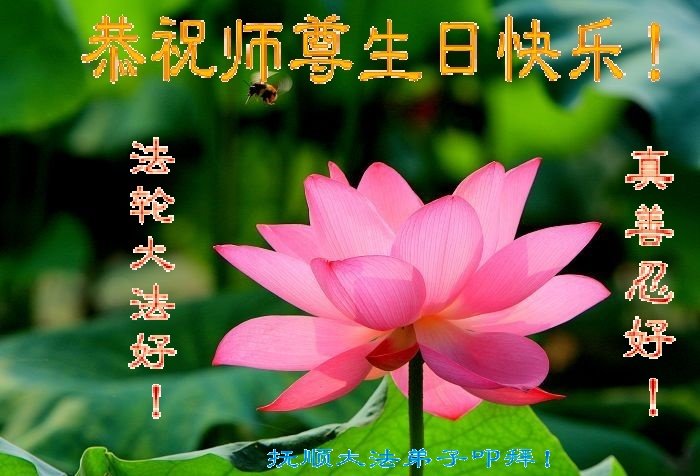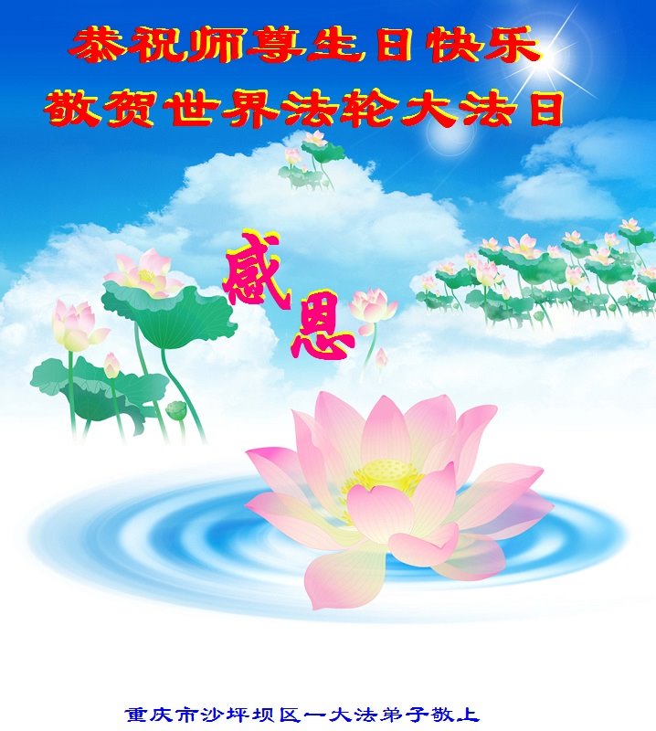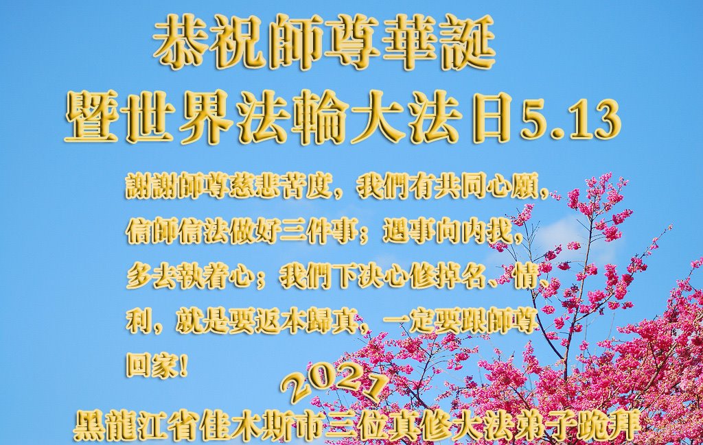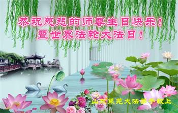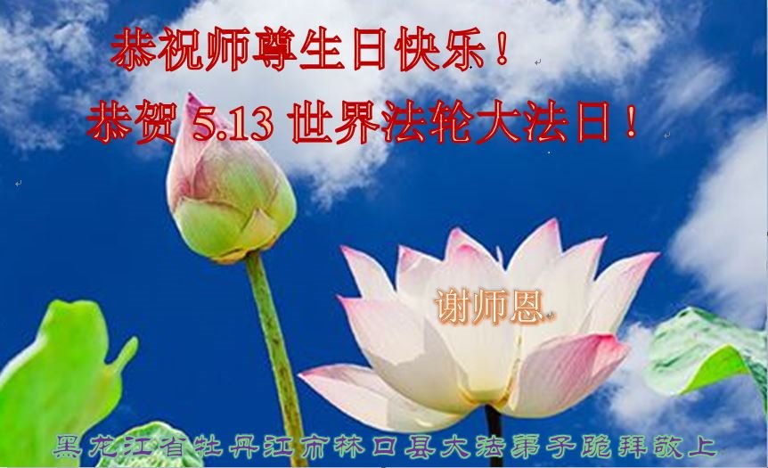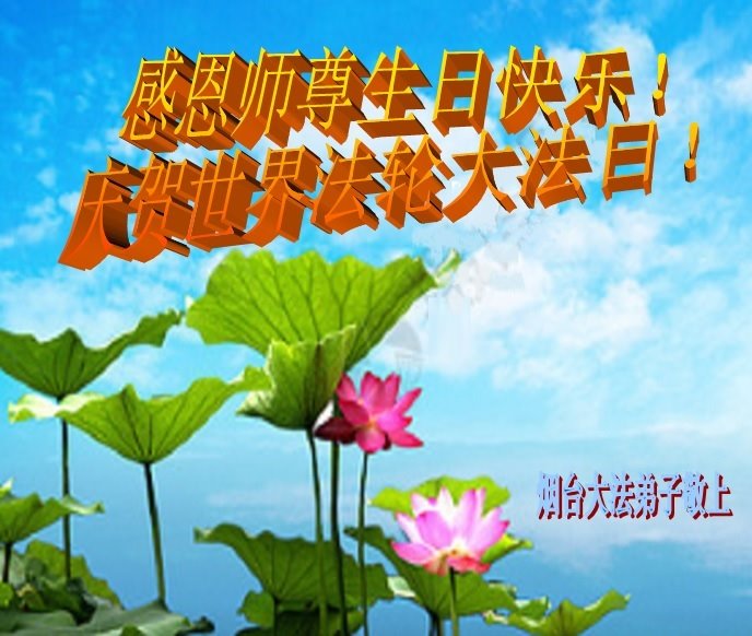 师尊您好!弟子恭祝师尊华诞!恭贺世界法轮大法日!在这普天同庆的日子里,弟子同歌同颂师尊之无量慈悲:感恩师尊把大法传给弟子,指引我们走上返本归真的大道;感恩师尊教导弟子做一个为他的生命,危难中不忘救度众生。弟子一定不忘使命,学好法,多救人,带领众生圆满随师还!弟子叩谢师恩!