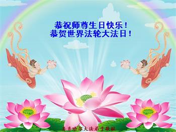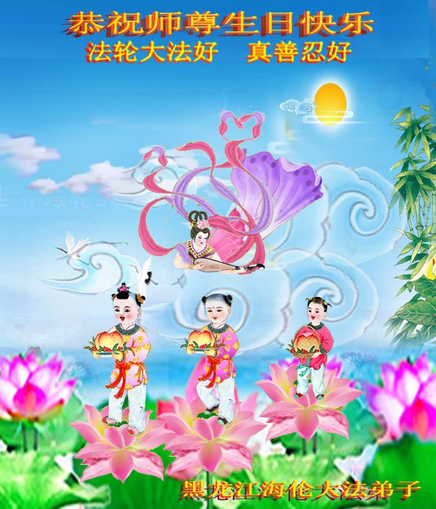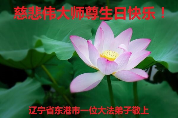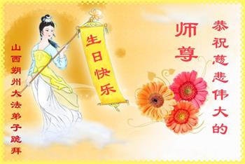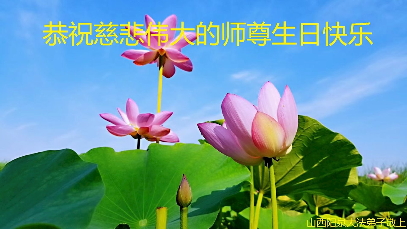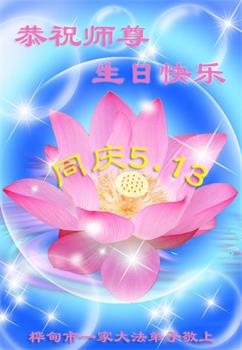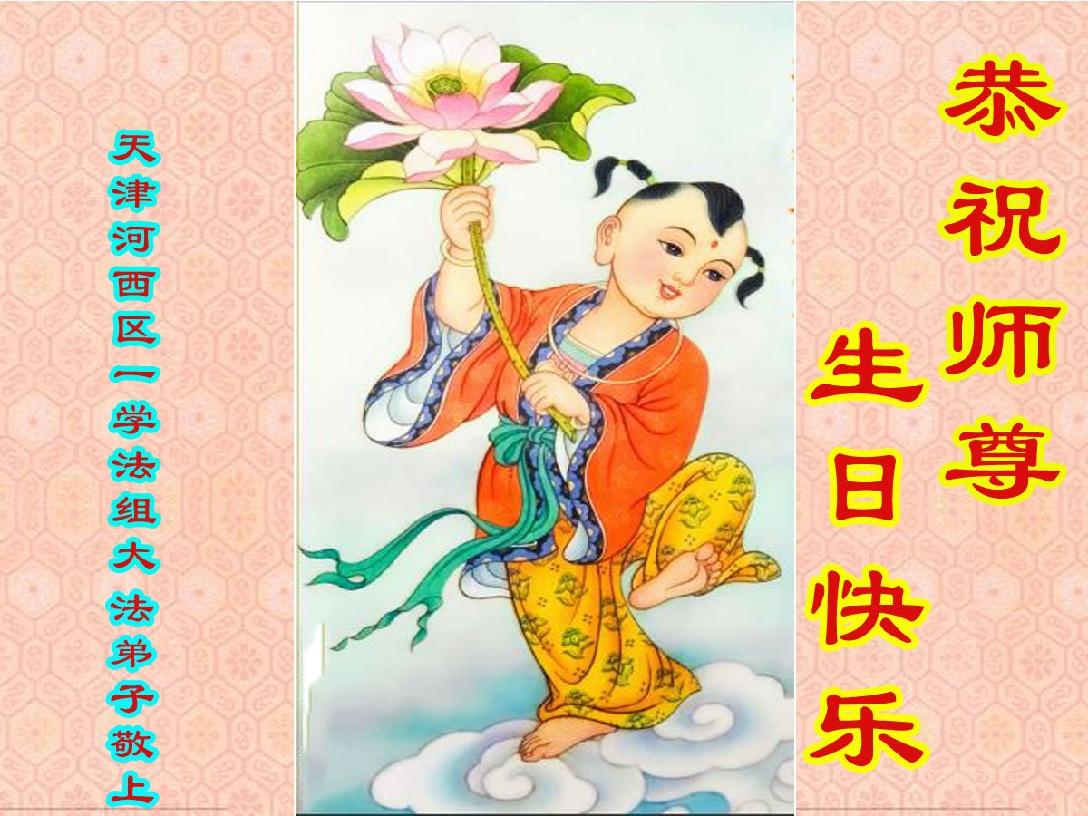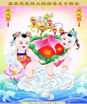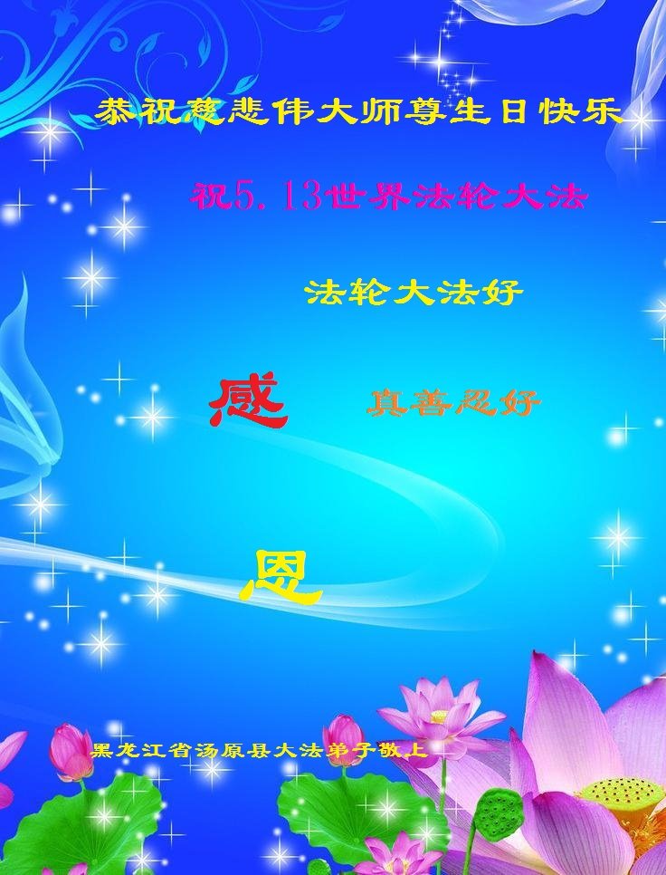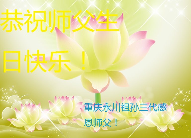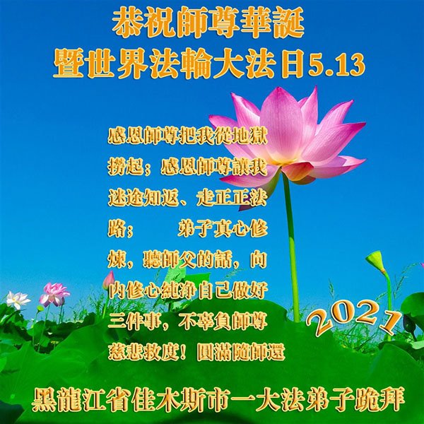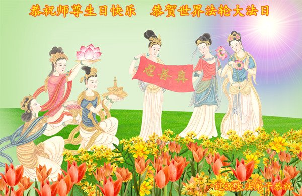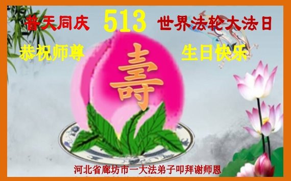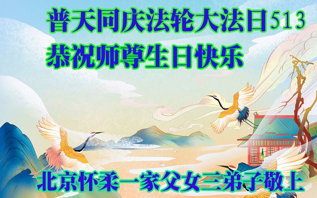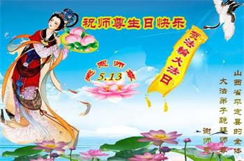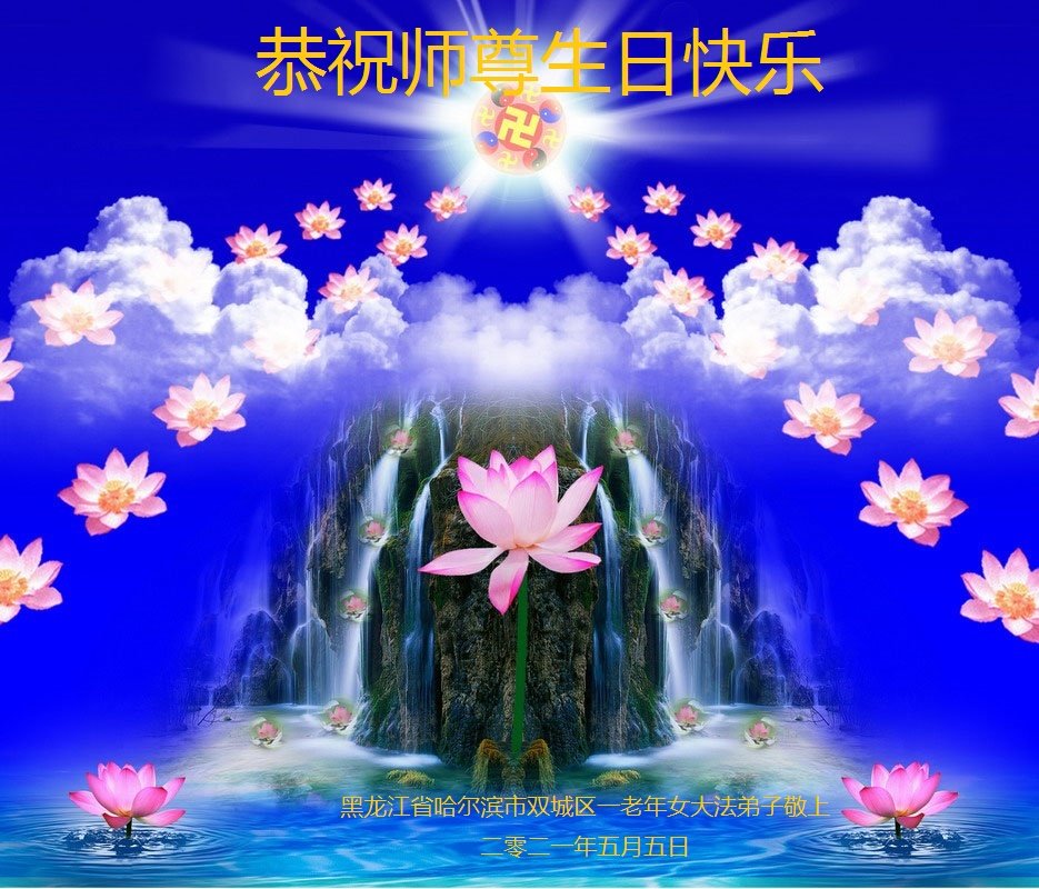 师尊您好!弟子恭祝师尊华诞!恭贺世界法轮大法日!在这普天同庆的日子里,弟子同歌同颂师尊之无量慈悲:感恩师尊把大法传给弟子,指引我们走上返本归真的大道;感恩师尊教导弟子做一个为他的生命,危难中不忘救度众生。弟子一定不忘使命,学好法,多救人,带领众生圆满随师还!弟子叩谢师恩!