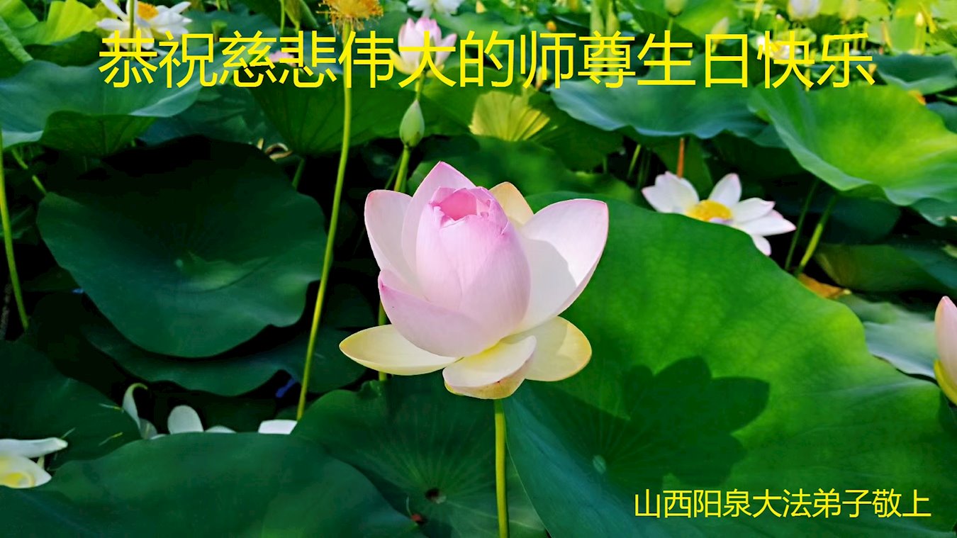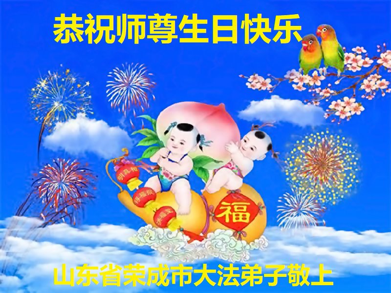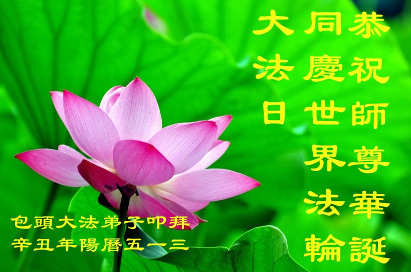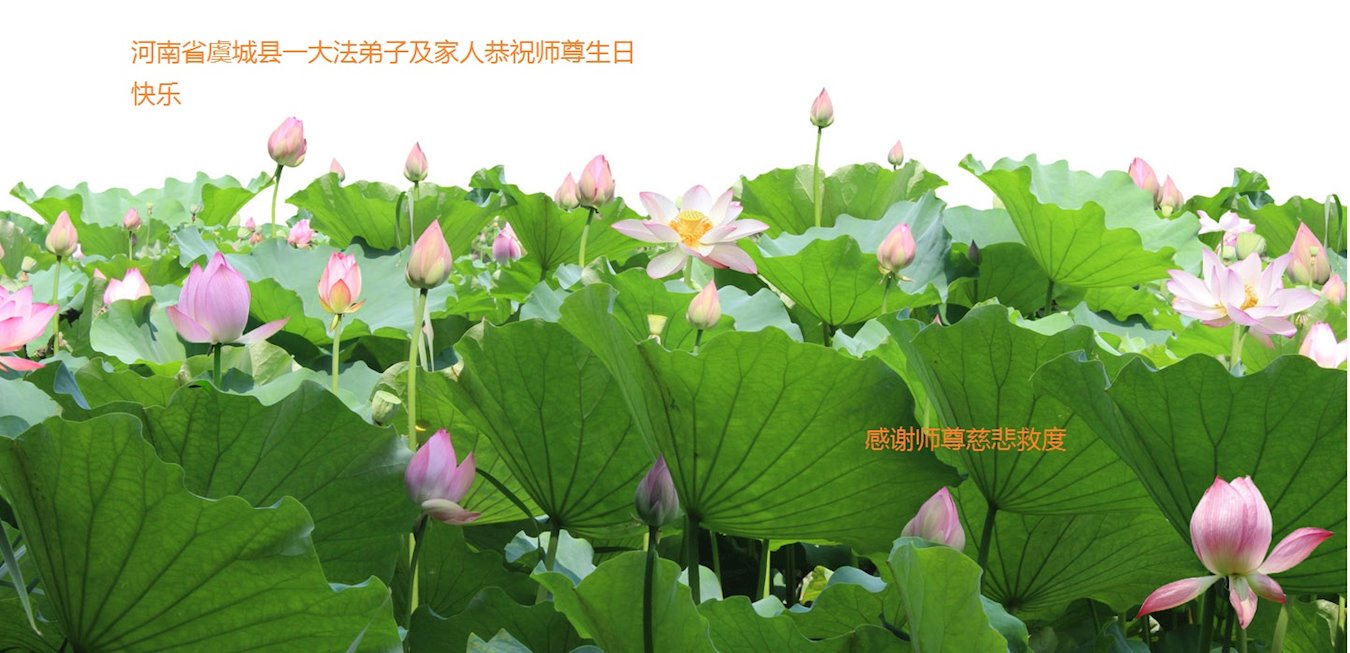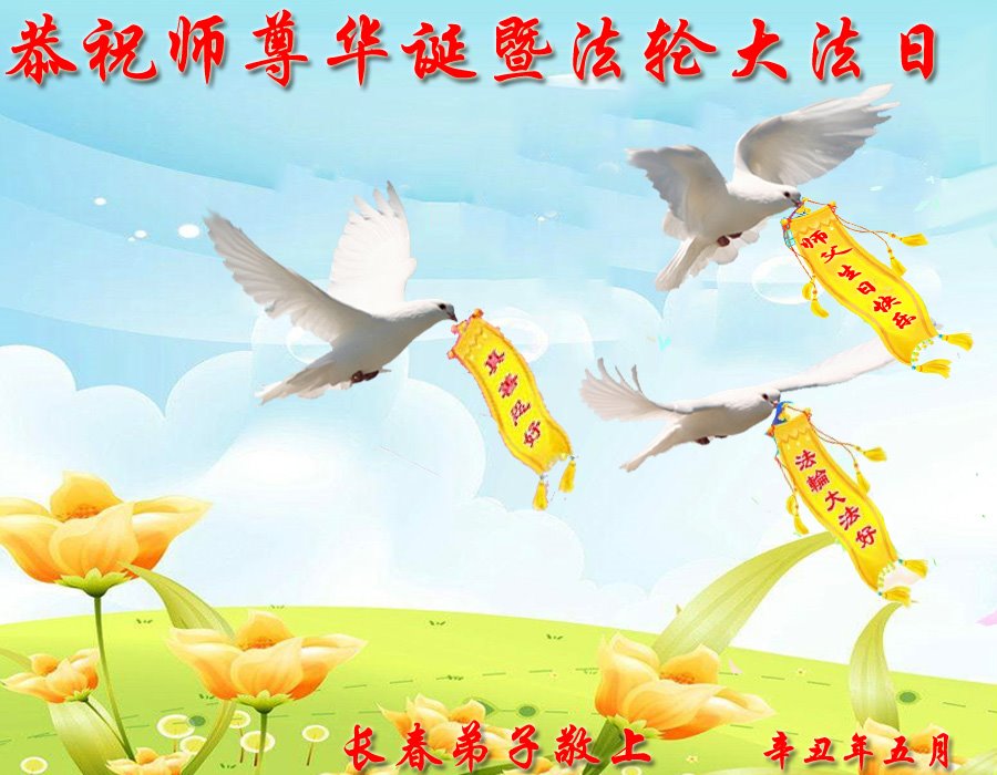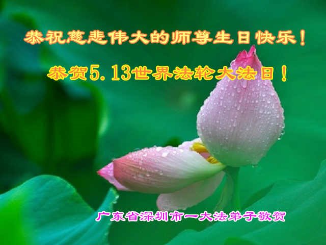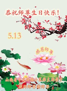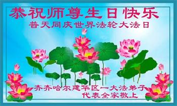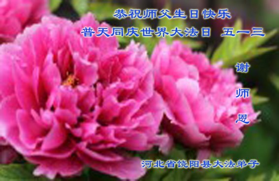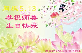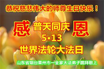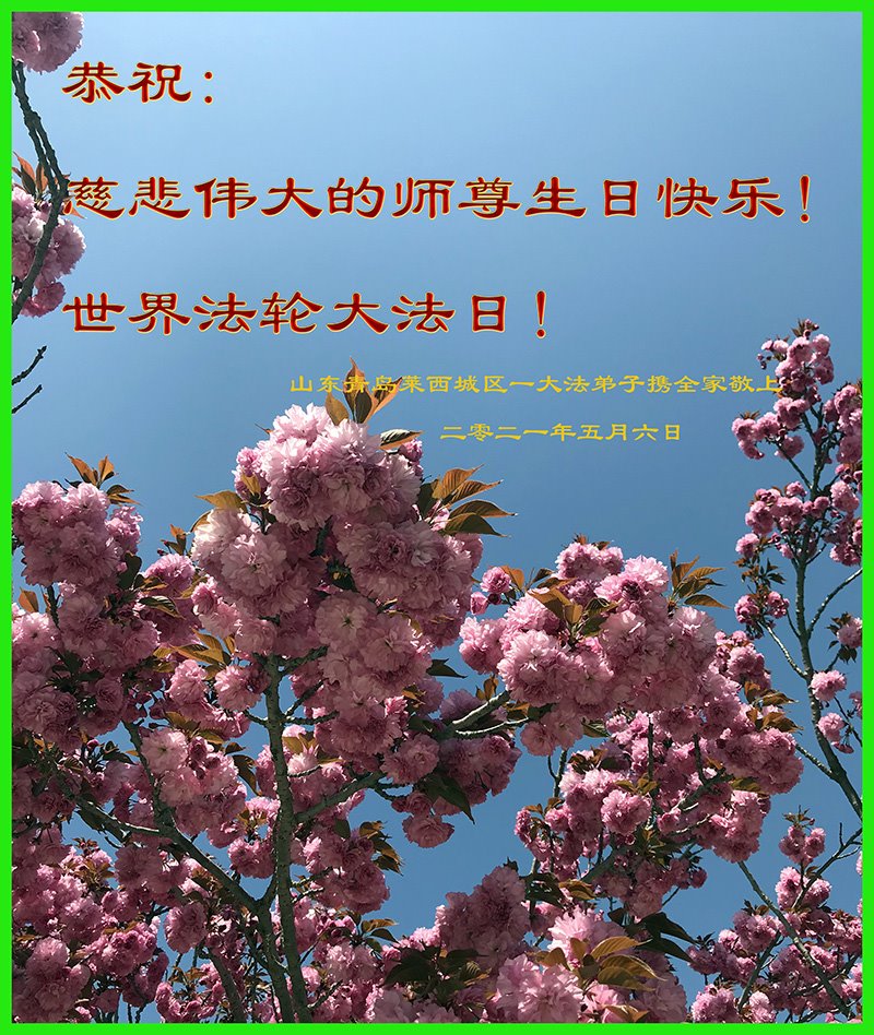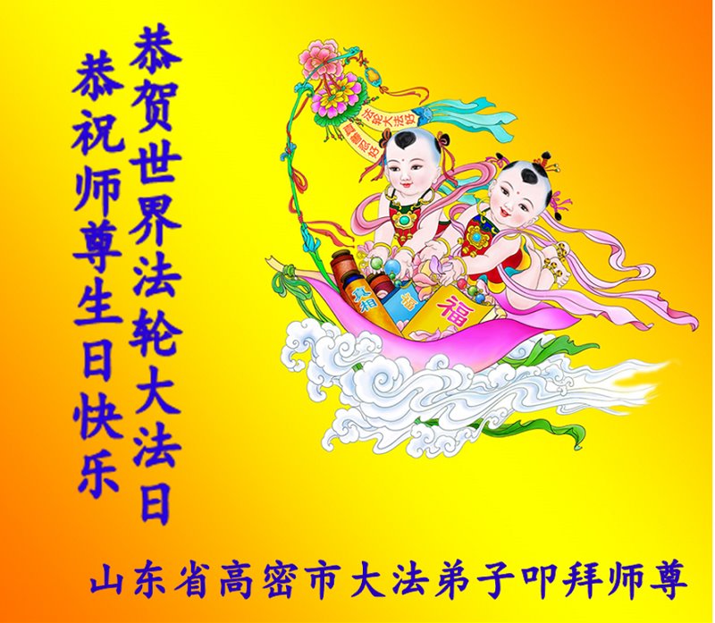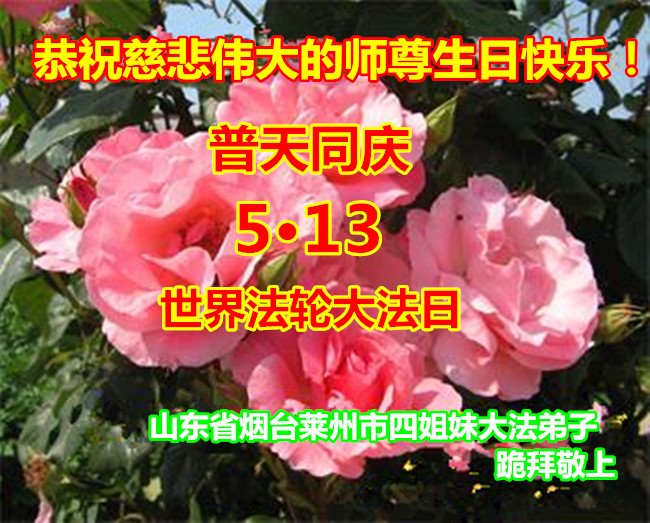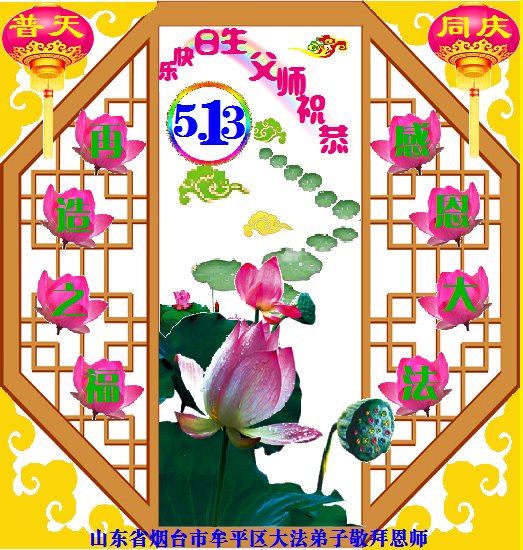 师尊您好!弟子恭祝师尊华诞!恭贺世界法轮大法日!在这普天同庆的日子里,弟子同歌同颂师尊之无量慈悲:感恩师尊把大法传给弟子,指引我们走上返本归真的大道;感恩师尊教导弟子做一个为他的生命,危难中不忘救度众生。弟子一定不忘使命,学好法,多救人,带领众生圆满随师还!弟子叩谢师恩!