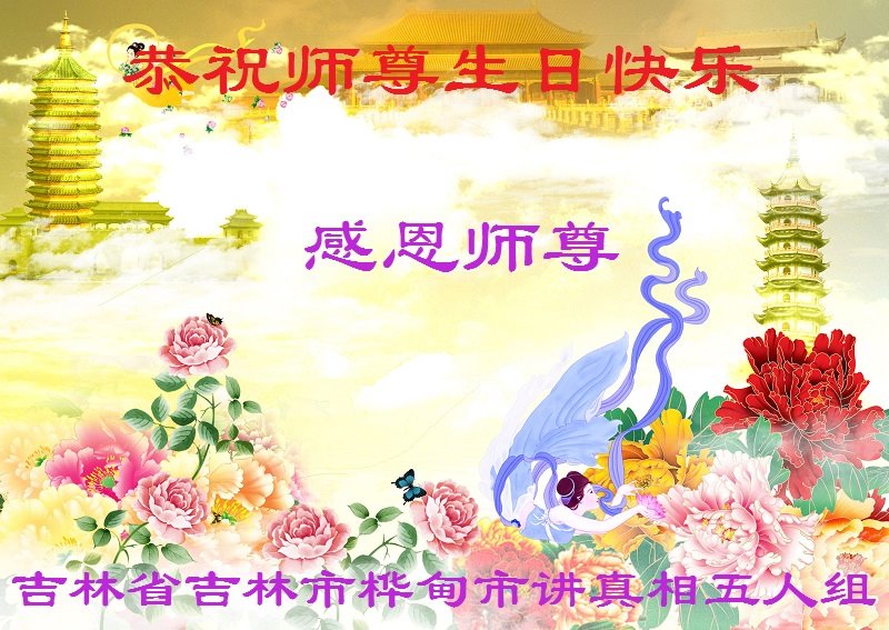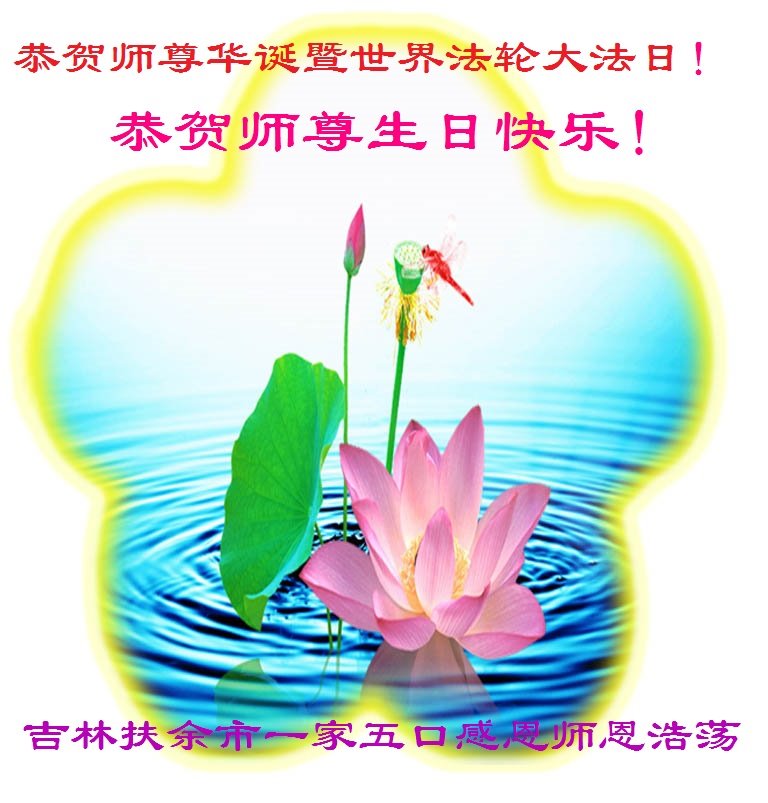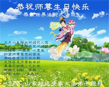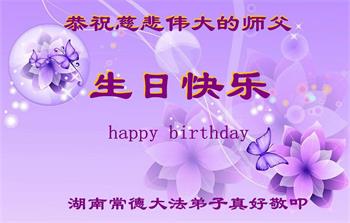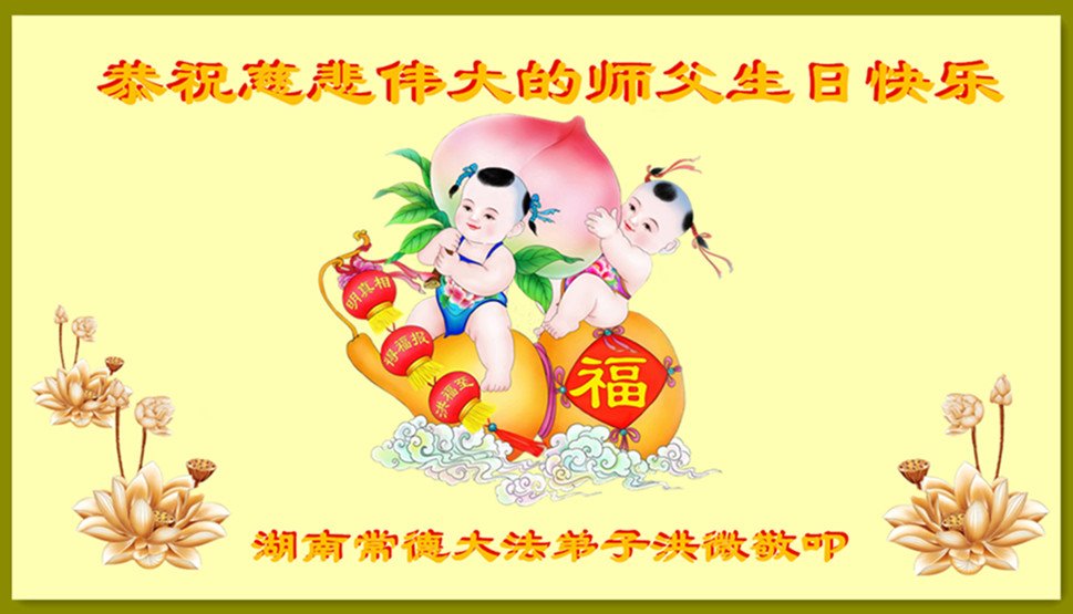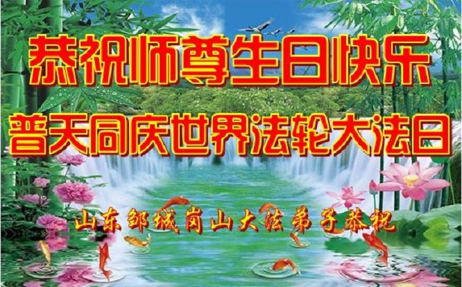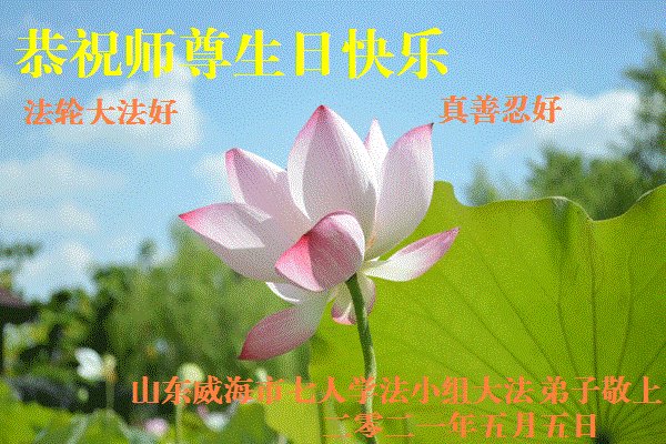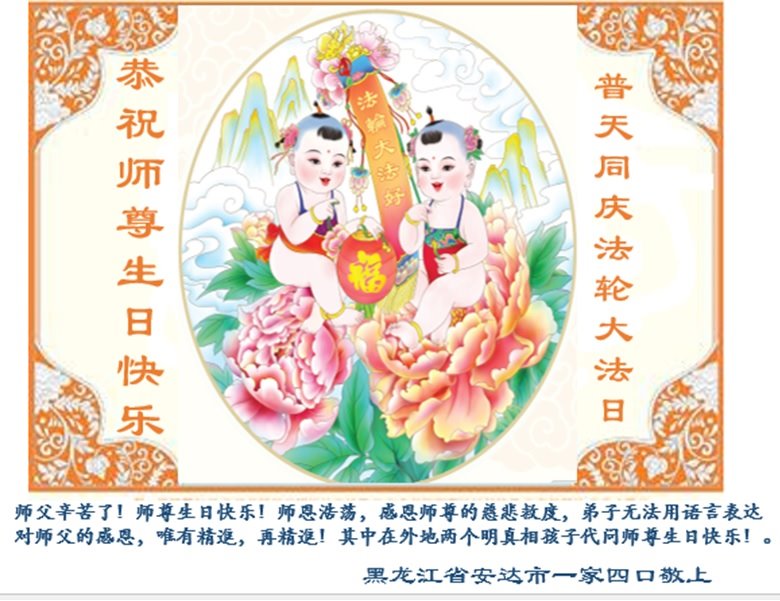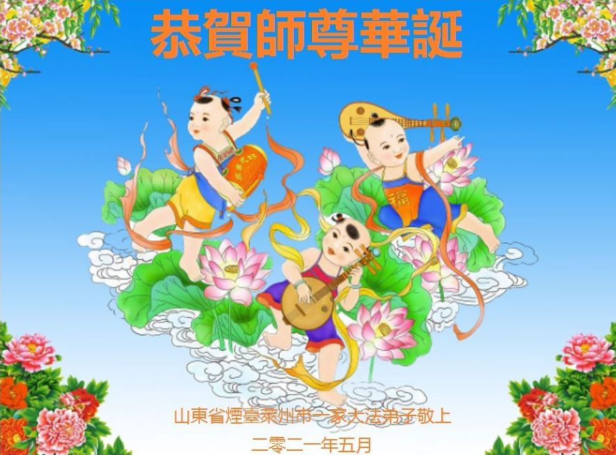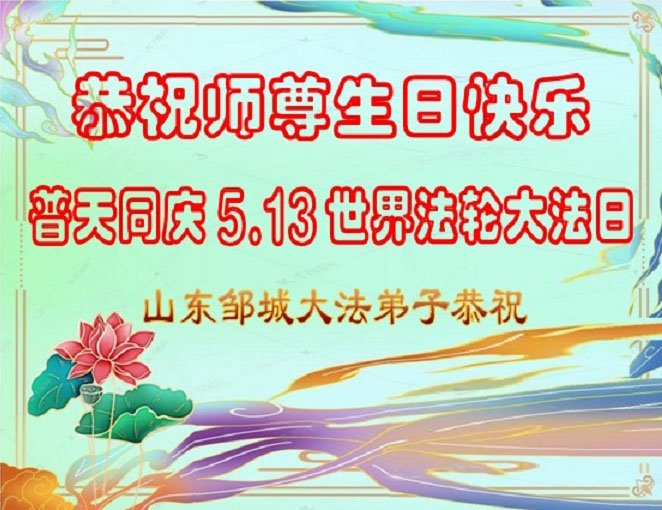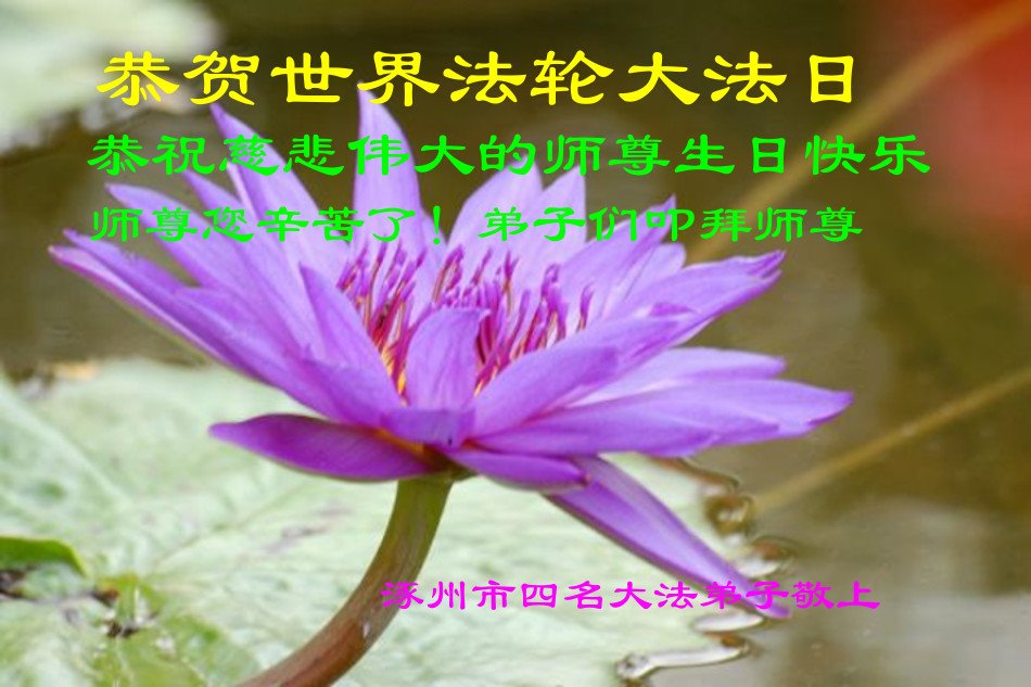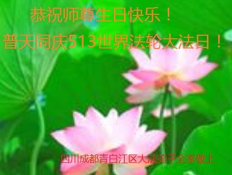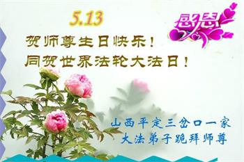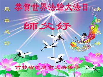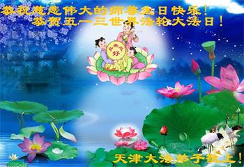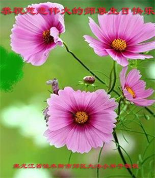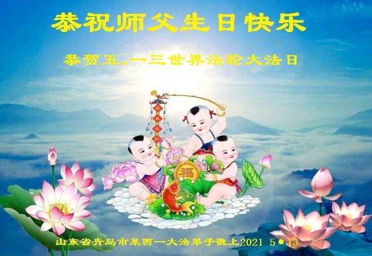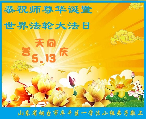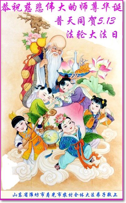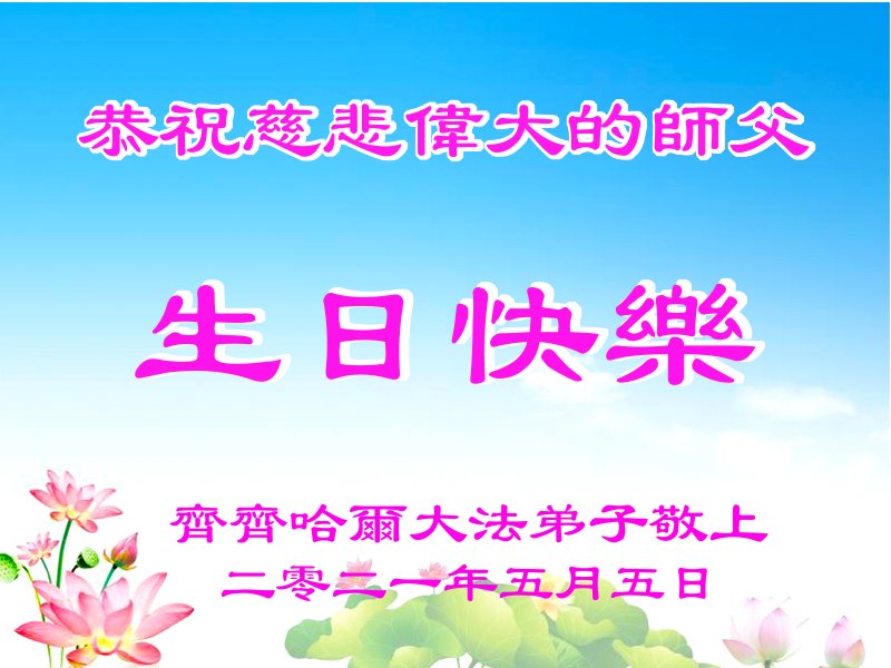 师尊您好!弟子恭祝师尊华诞!恭贺世界法轮大法日!在这普天同庆的日子里,弟子同歌同颂师尊之无量慈悲:感恩师尊把大法传给弟子,指引我们走上返本归真的大道;感恩师尊教导弟子做一个为他的生命,危难中不忘救度众生。弟子一定不忘使命,学好法,多救人,带领众生圆满随师还!弟子叩谢师恩!
