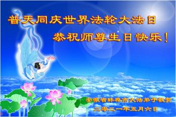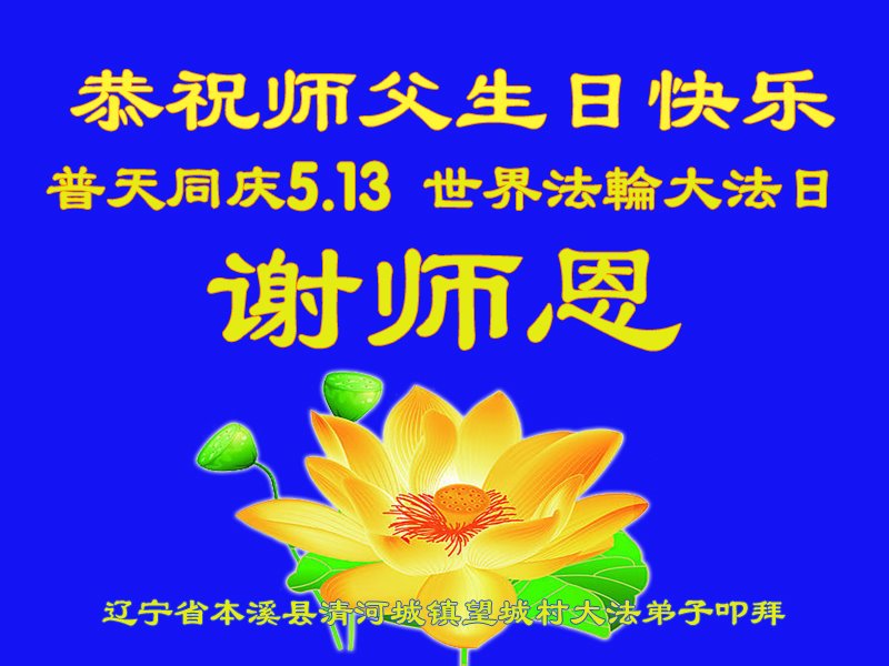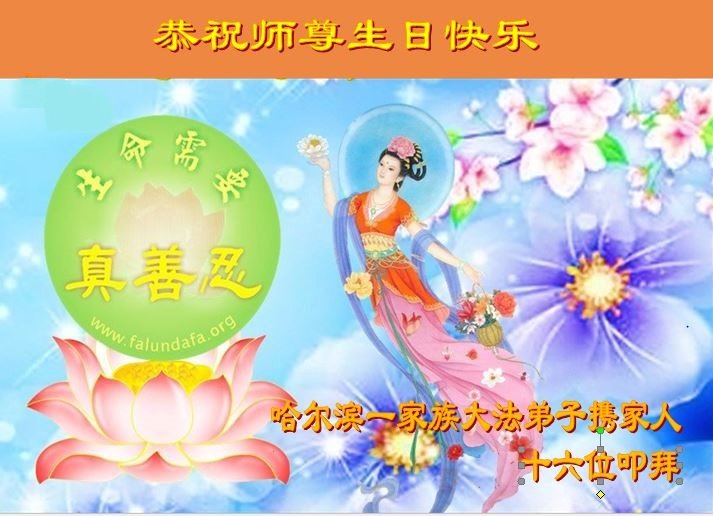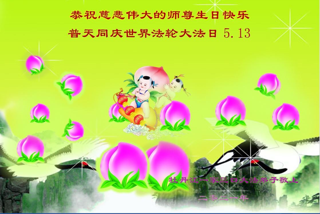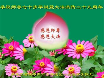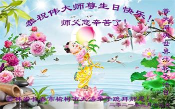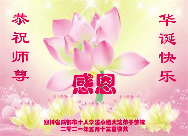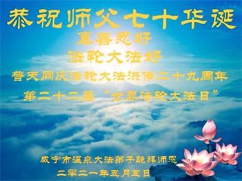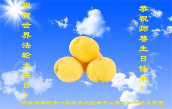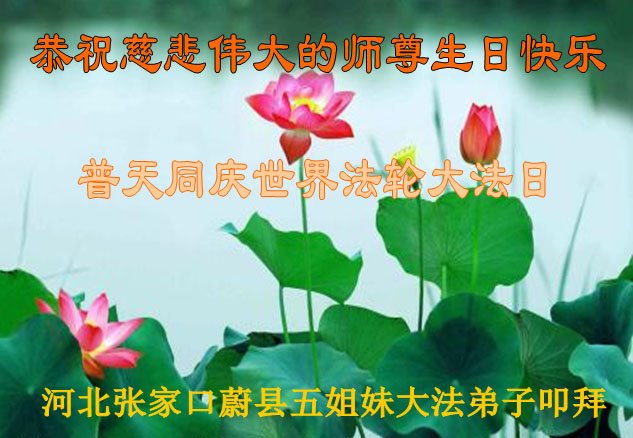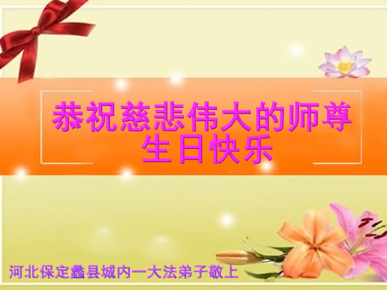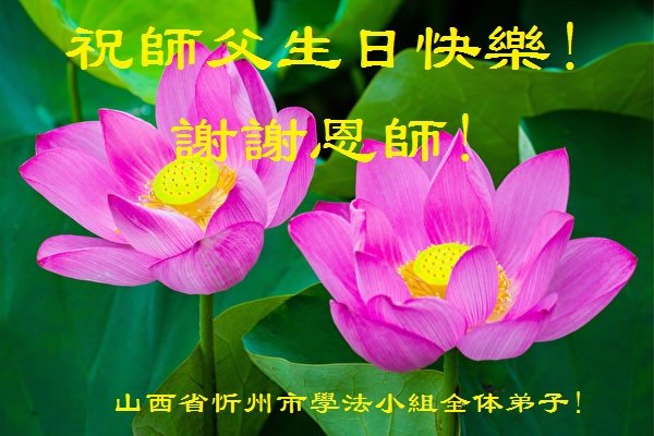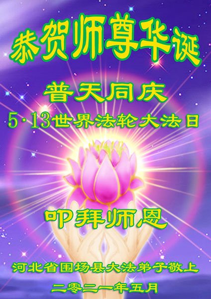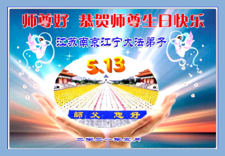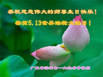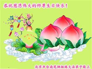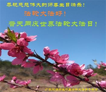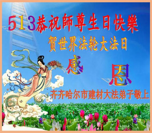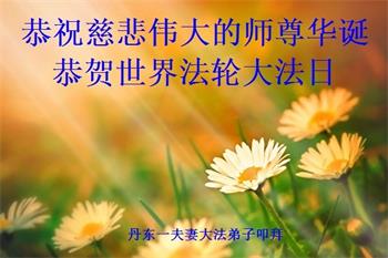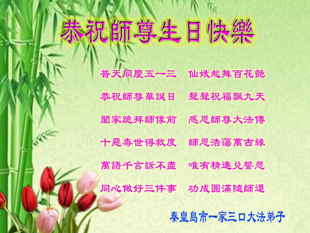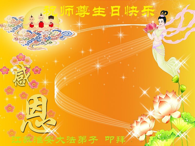 师尊您好!弟子恭祝师尊华诞!恭贺世界法轮大法日!在这普天同庆的日子里,弟子同歌同颂师尊之无量慈悲:感恩师尊把大法传给弟子,指引我们走上返本归真的大道;感恩师尊教导弟子做一个为他的生命,危难中不忘救度众生。弟子一定不忘使命,学好法,多救人,带领众生圆满随师还!弟子叩谢师恩!