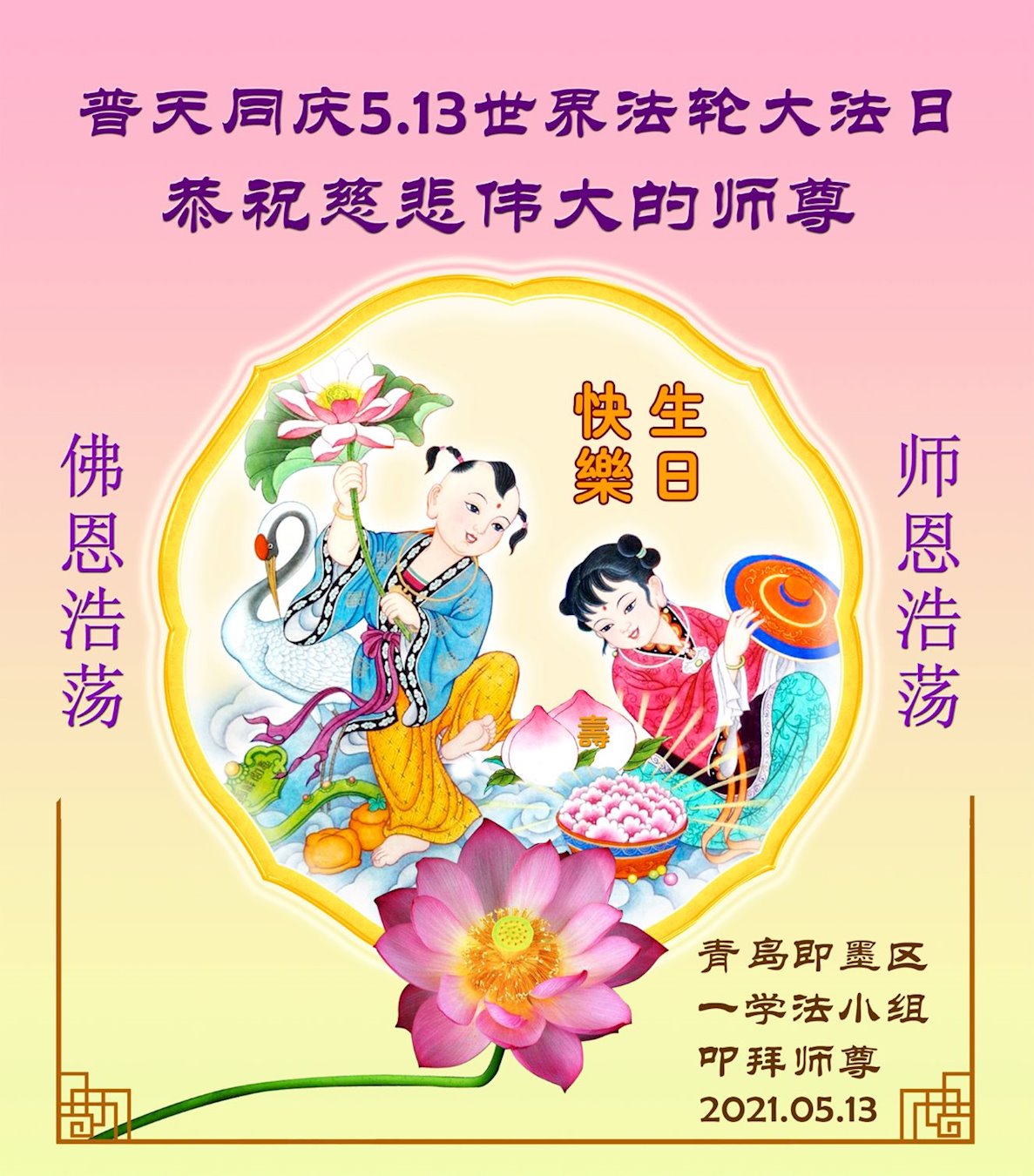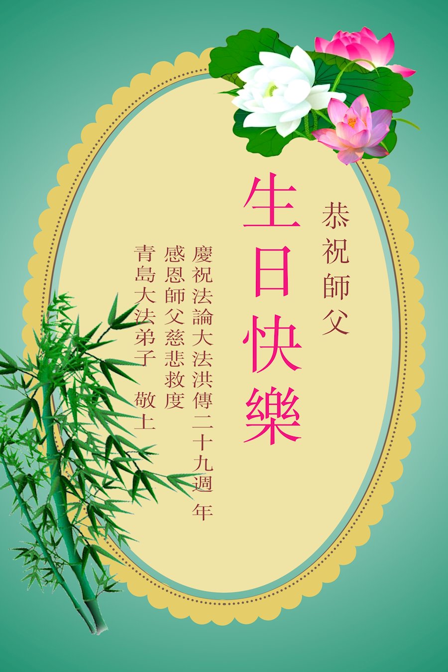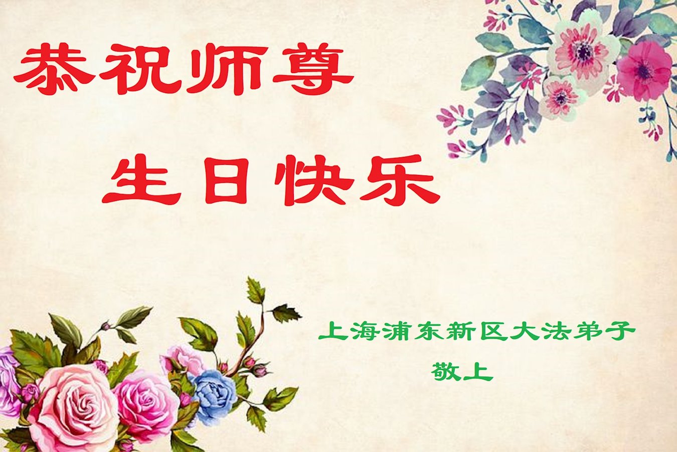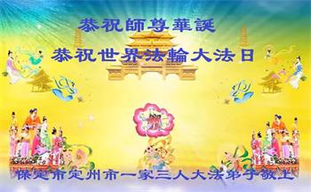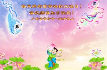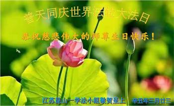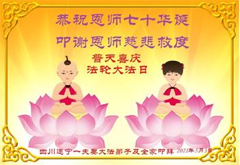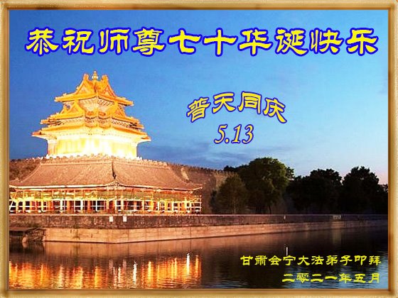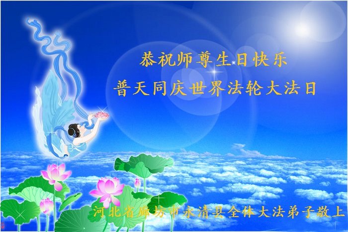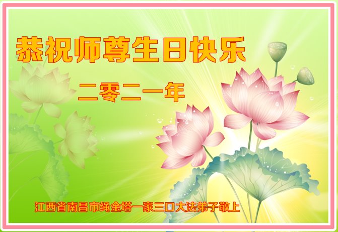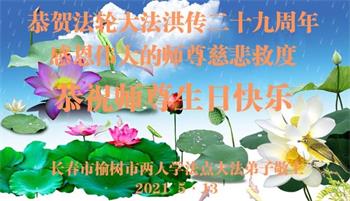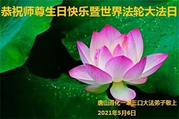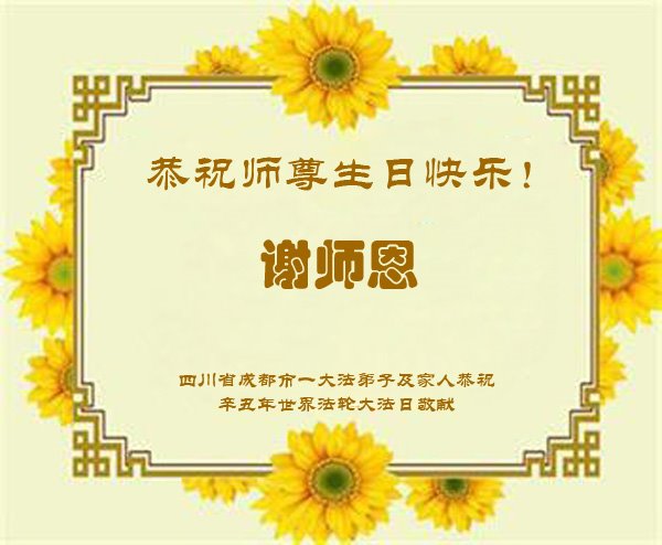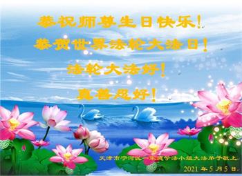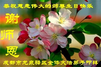 师尊您好!弟子恭祝师尊华诞!恭贺世界法轮大法日!在这普天同庆的日子里,弟子同歌同颂师尊之无量慈悲:感恩师尊把大法传给弟子,指引我们走上返本归真的大道;感恩师尊教导弟子做一个为他的生命,危难中不忘救度众生。弟子一定不忘使命,学好法,多救人,带领众生圆满随师还!弟子叩谢师恩!