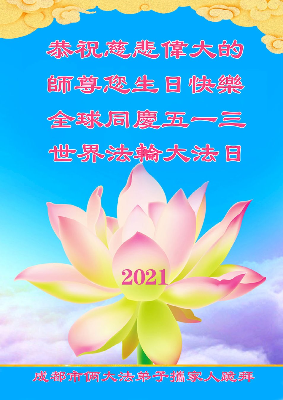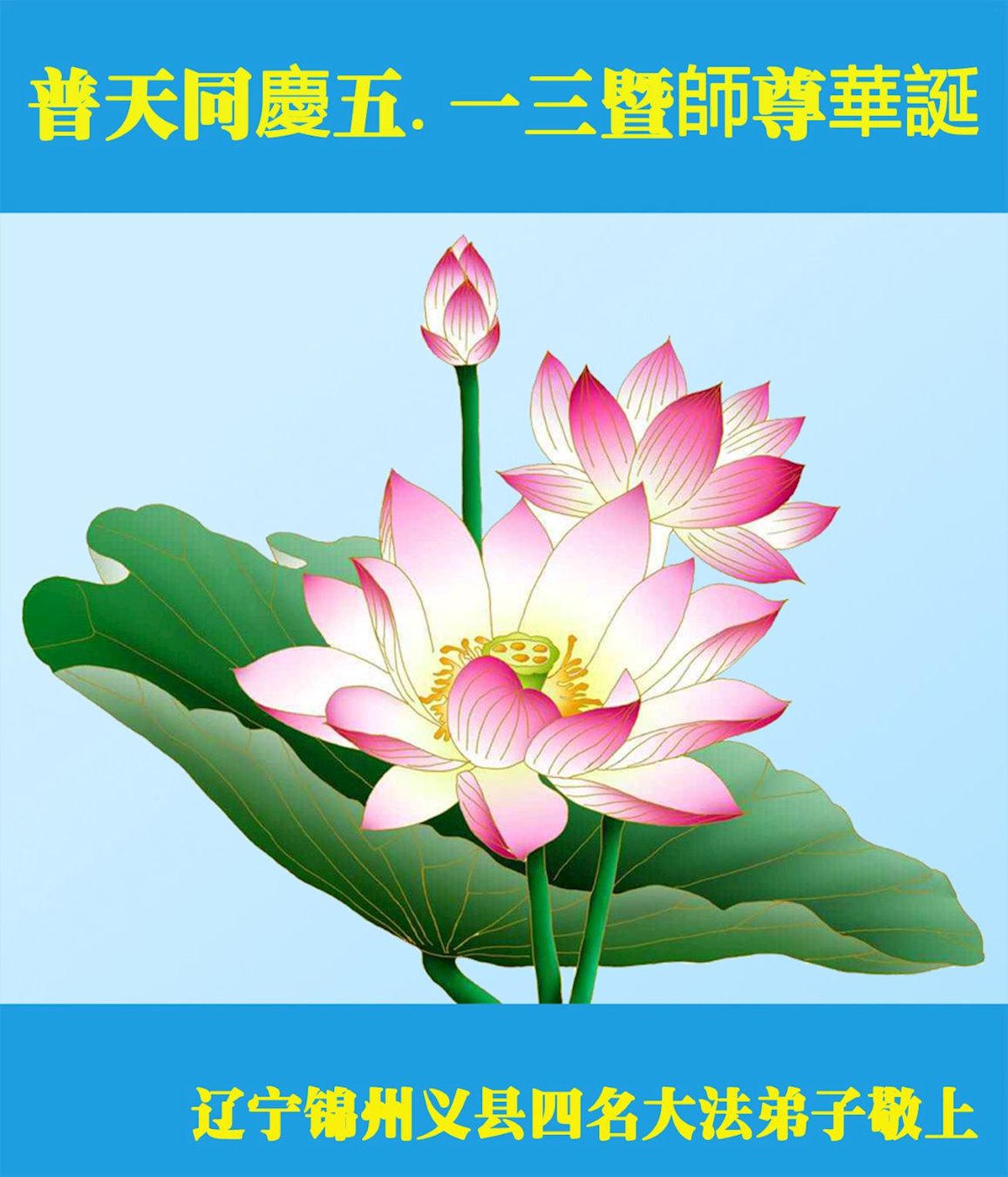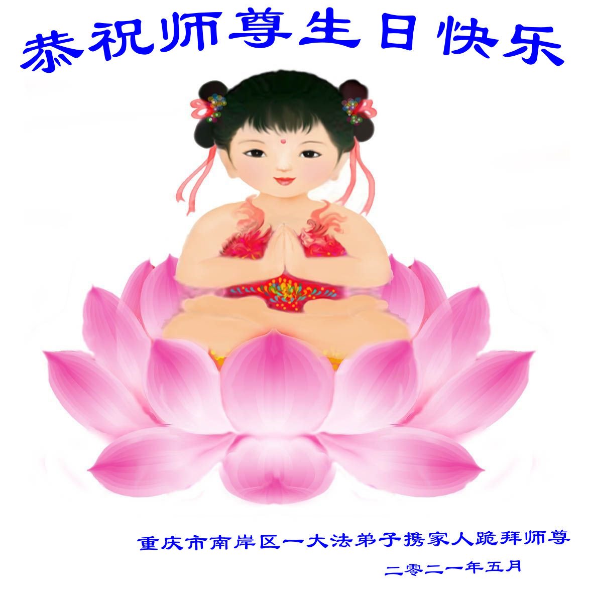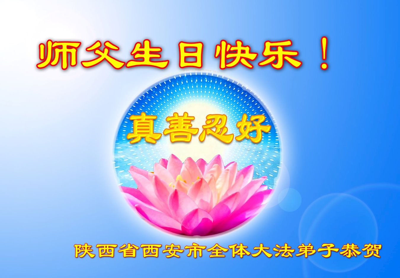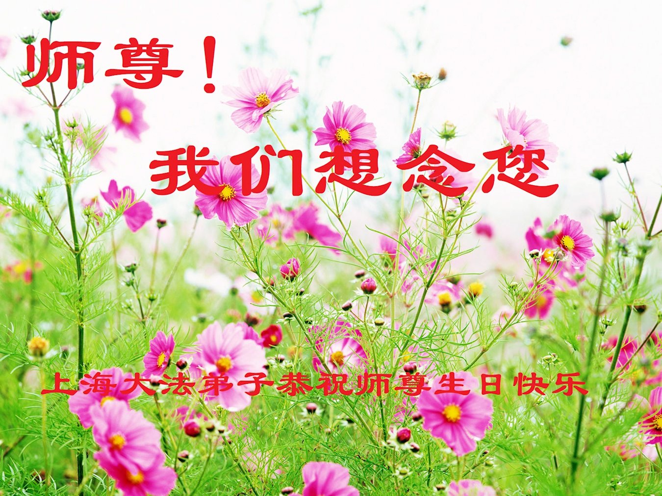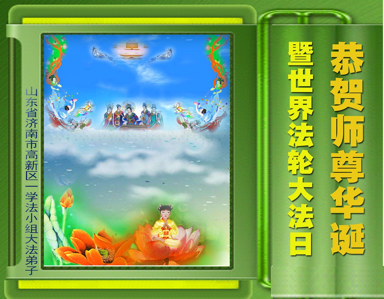 师尊您好!弟子恭祝师尊华诞!恭贺世界法轮大法日!在这普天同庆的日子里,弟子同歌同颂师尊之无量慈悲:感恩师尊把大法传给弟子,指引我们走上返本归真的大道;感恩师尊教导弟子做一个为他的生命,危难中不忘救度众生。弟子一定不忘使命,学好法,多救人,带领众生圆满随师还!弟子叩谢师恩!