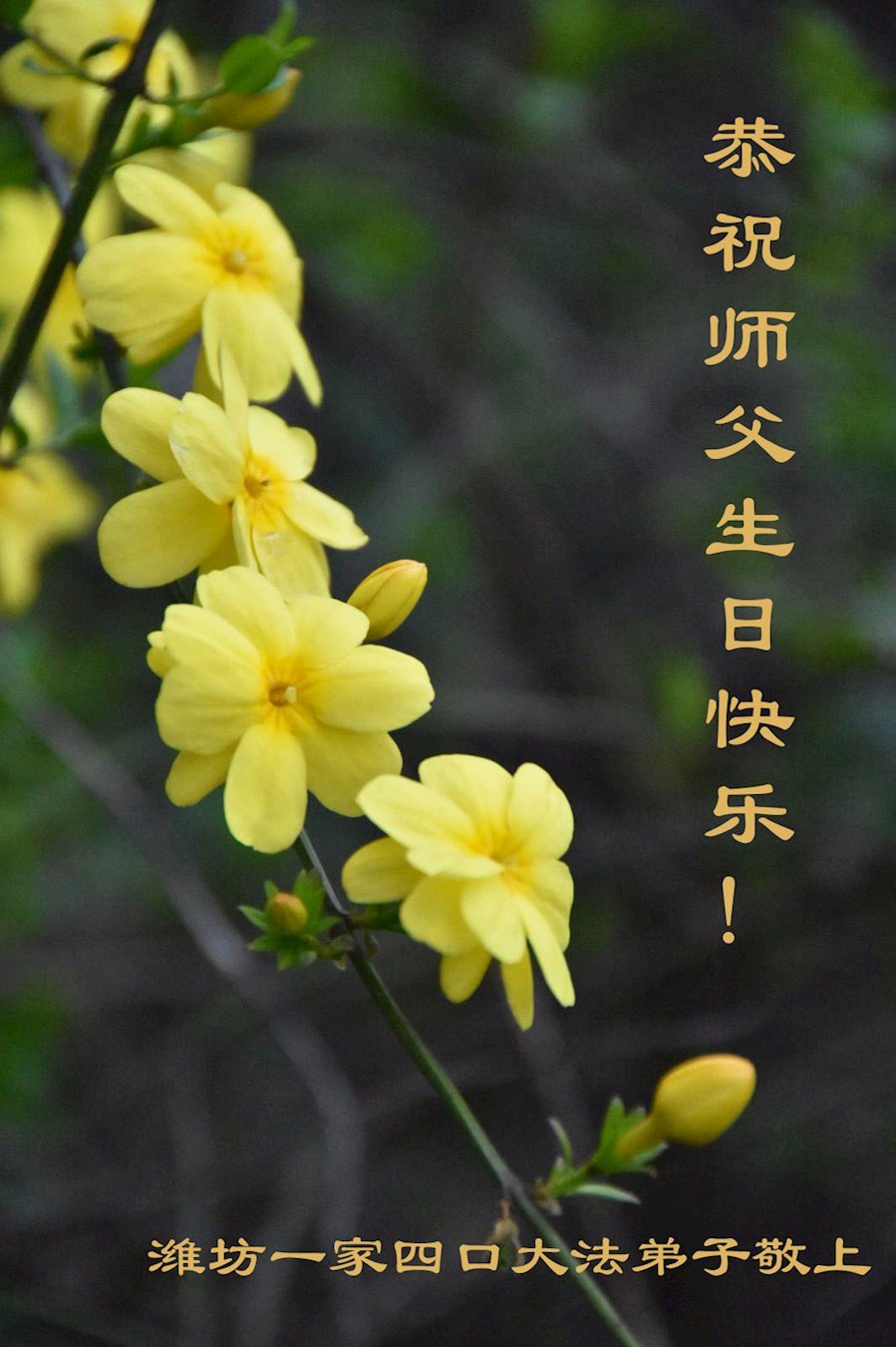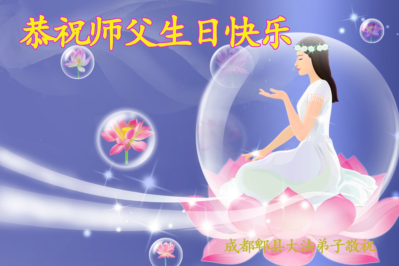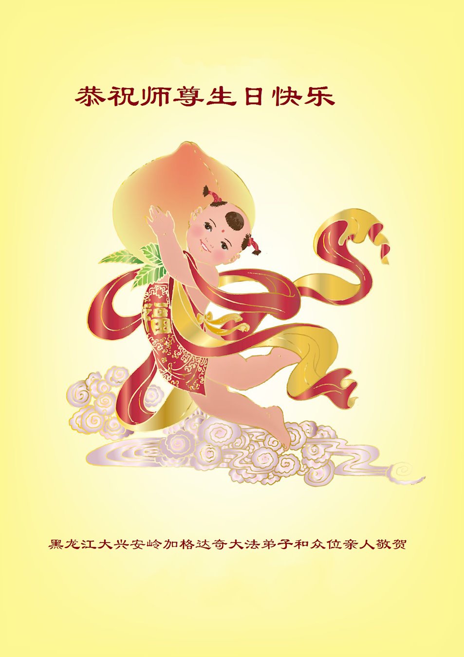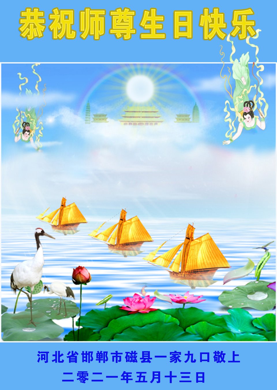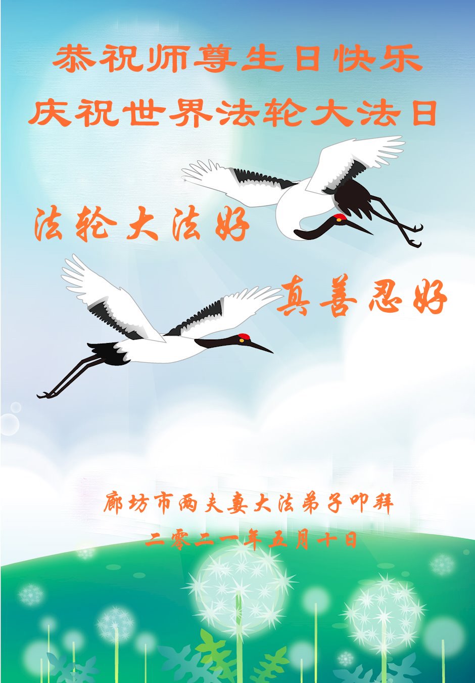 师尊您好!弟子恭祝师尊华诞!恭贺世界法轮大法日!在这普天同庆的日子里,弟子同歌同颂师尊之无量慈悲:感恩师尊把大法传给弟子,指引我们走上返本归真的大道;感恩师尊教导弟子做一个为他的生命,危难中不忘救度众生。弟子一定不忘使命,学好法,多救人,带领众生圆满随师还!弟子叩谢师恩!