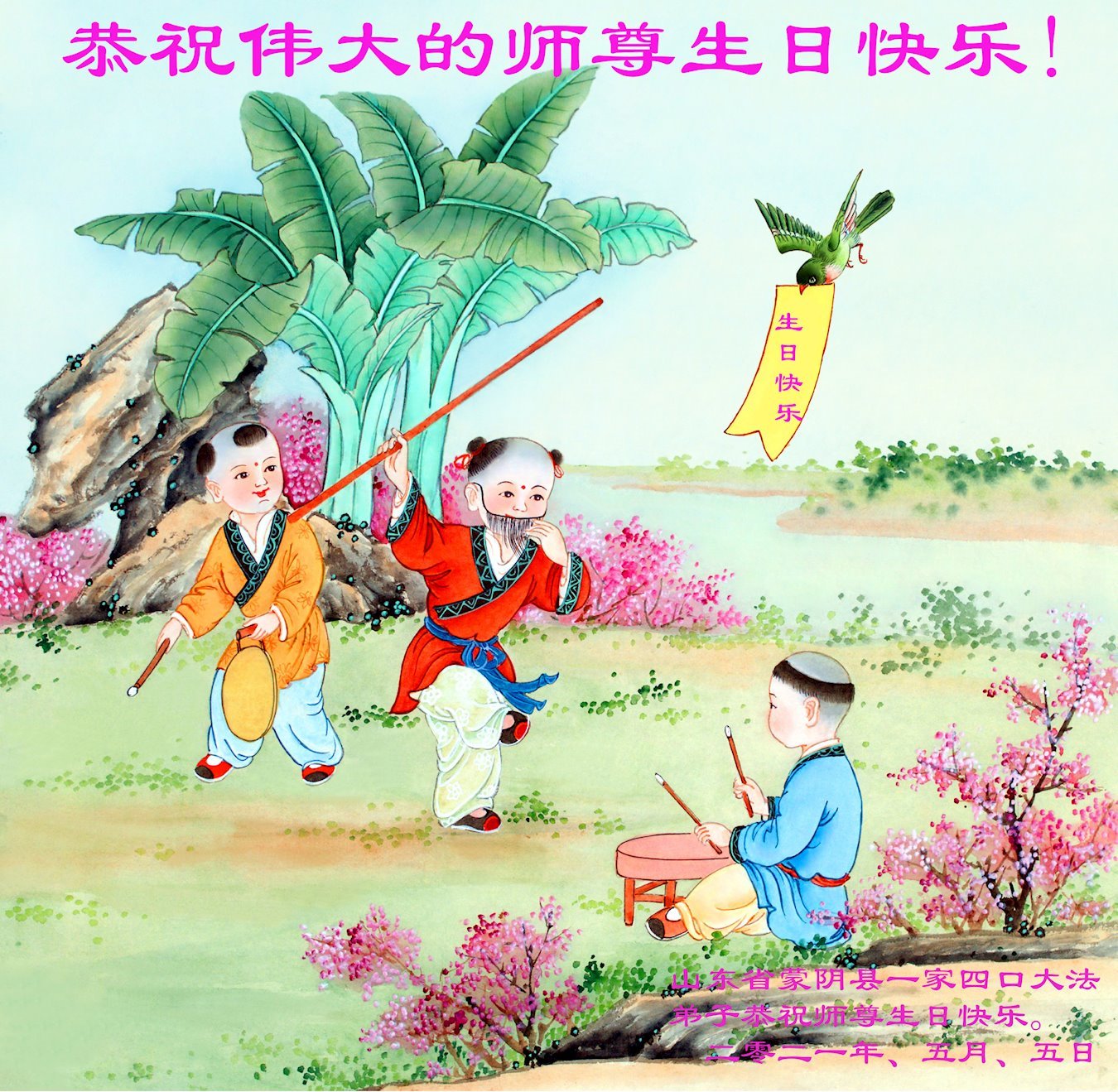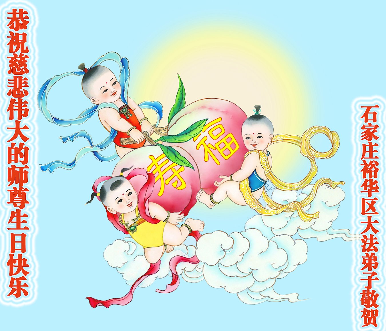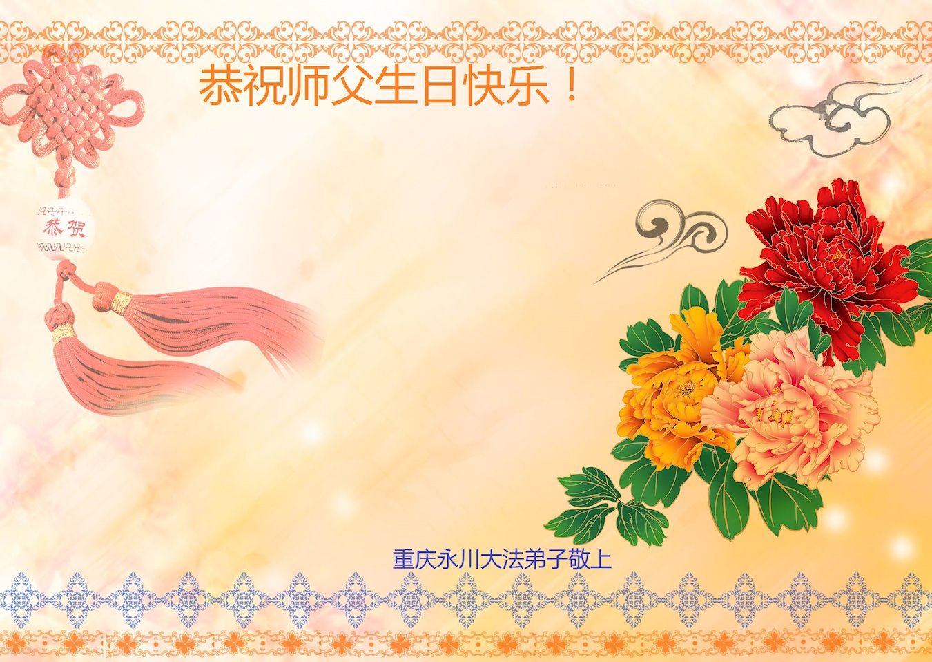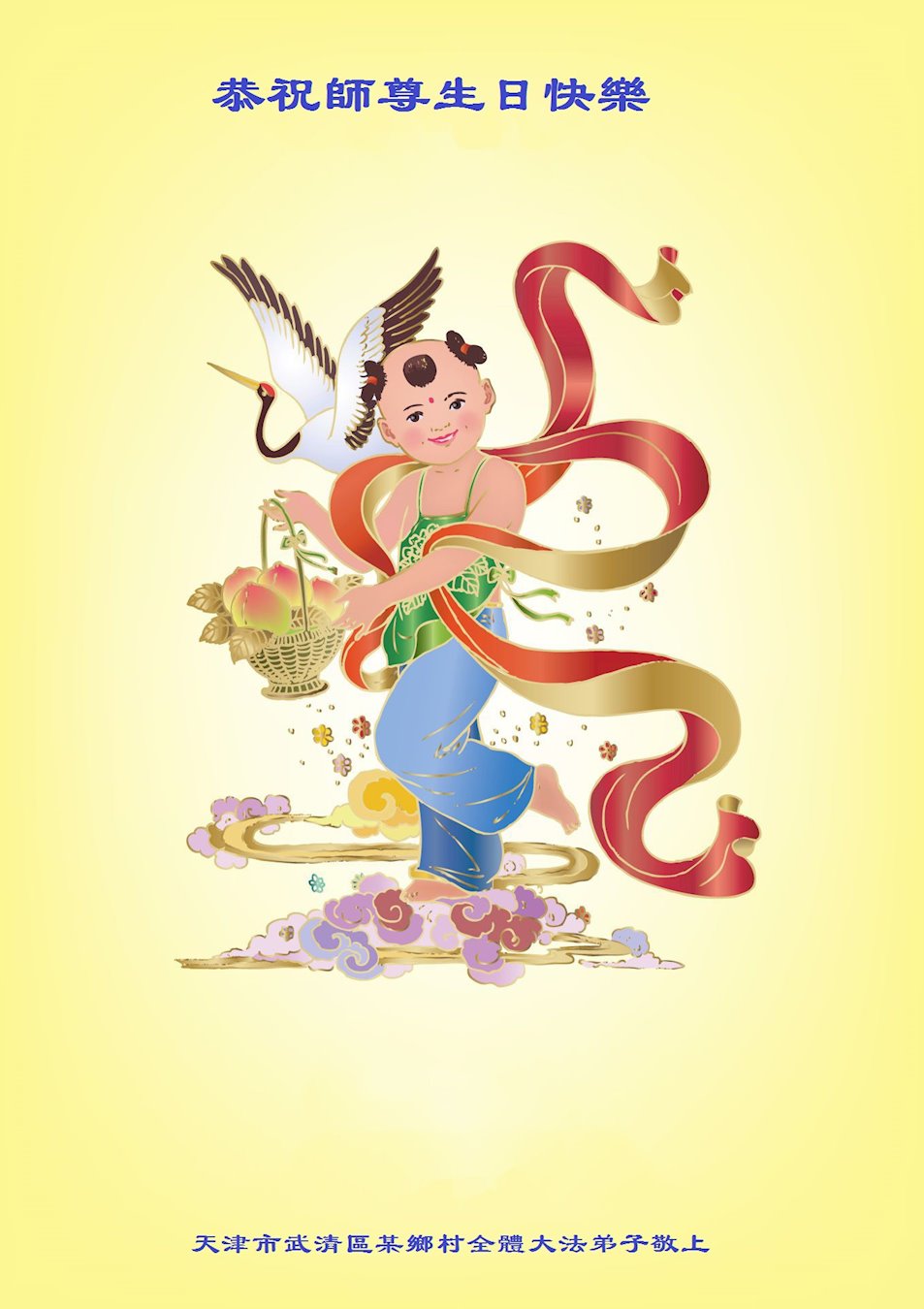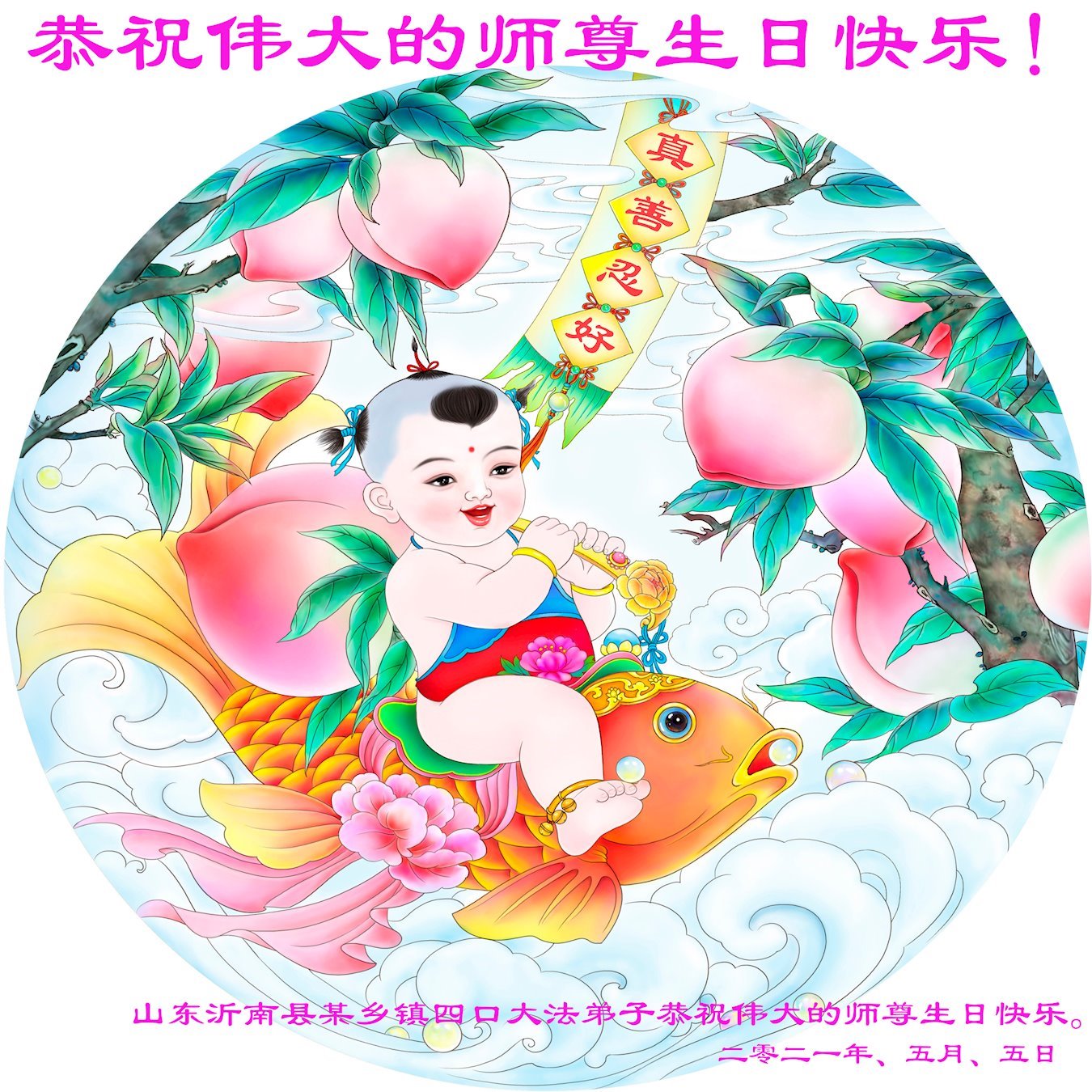 师尊您好!弟子恭祝师尊华诞!恭贺世界法轮大法日!在这普天同庆的日子里,弟子同歌同颂师尊之无量慈悲:感恩师尊把大法传给弟子,指引我们走上返本归真的大道;感恩师尊教导弟子做一个为他的生命,危难中不忘救度众生。弟子一定不忘使命,学好法,多救人,带领众生圆满随师还!弟子叩谢师恩!