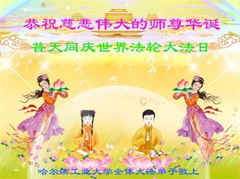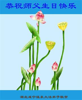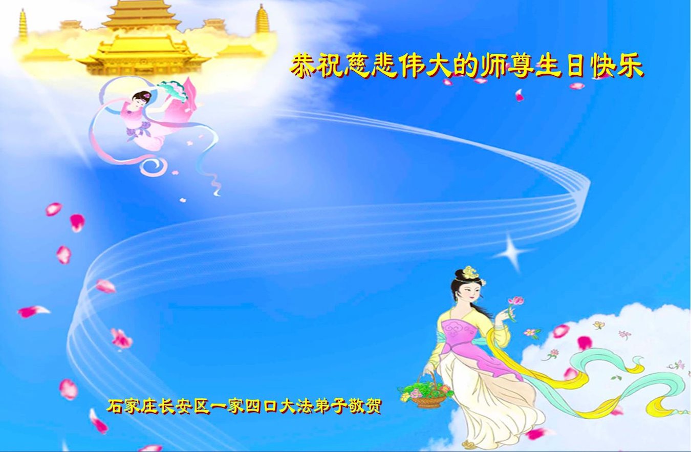 师父您好!我们能成为您的弟子真是太幸运了!我们非常的自豪和感动。师父您把我们从地狱捞上来,把我们很脏的身体洗净,又给了我们太多太多,在我们身边一直看护着我们。我们做的好时,您鼓励我们,做的不好时,您也不嫌弃我们,不断的点悟我们,使我们在非常艰难的环境中能一步步的走到了今天。您的洪恩,弟子们无法报答,我们只有遵照您的教导,好好修好自己,抓紧时间能多救人,完成我们下世的使命,跟着师父回家。谢谢慈悲伟大的师父!