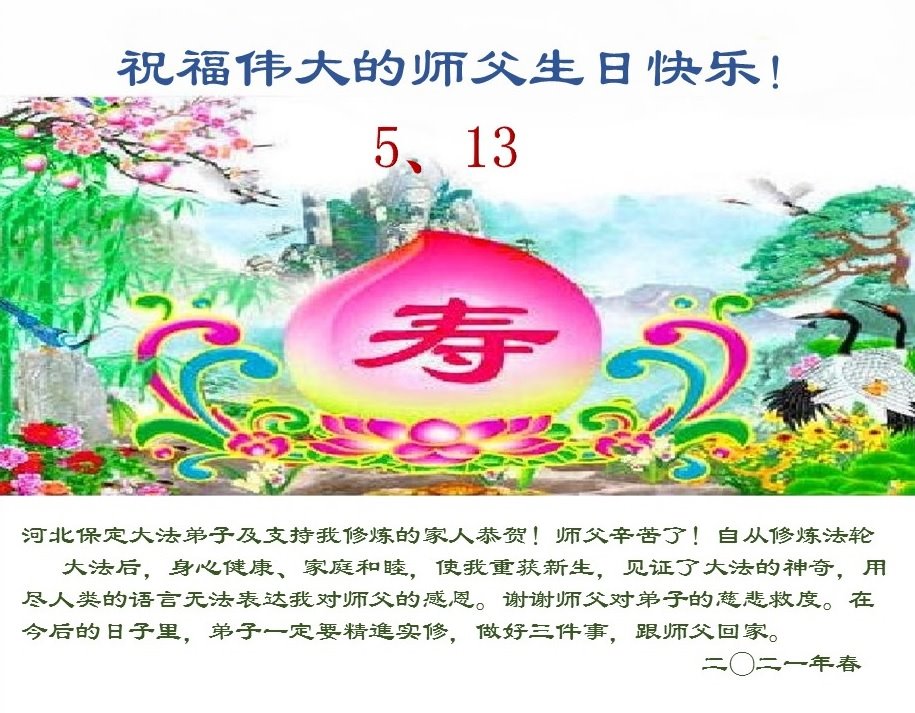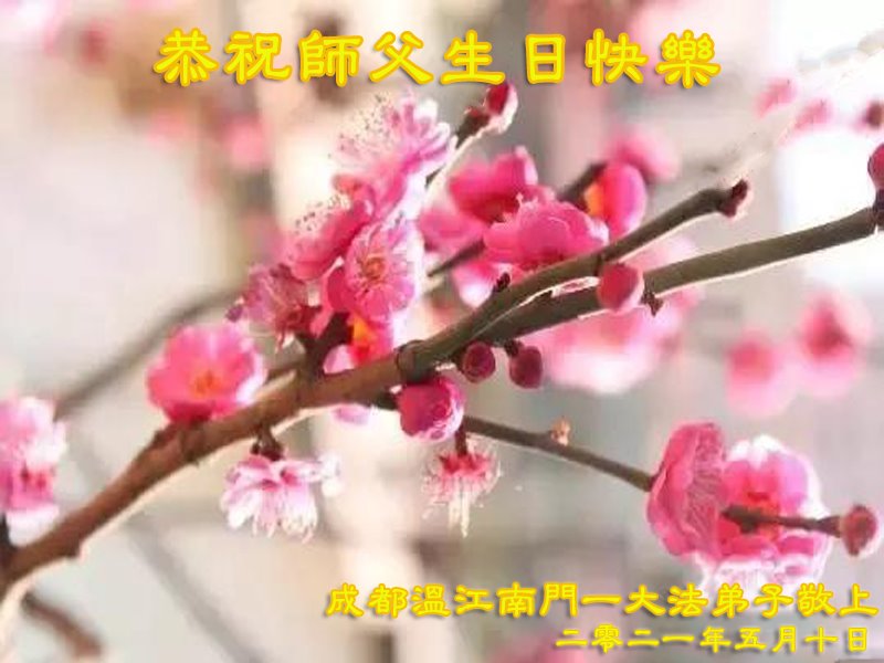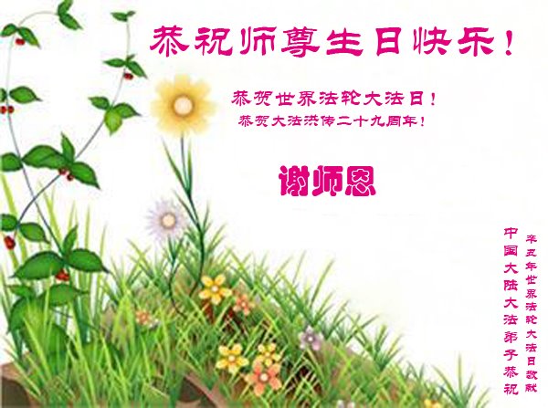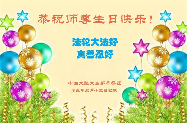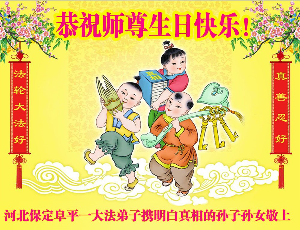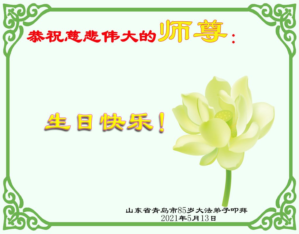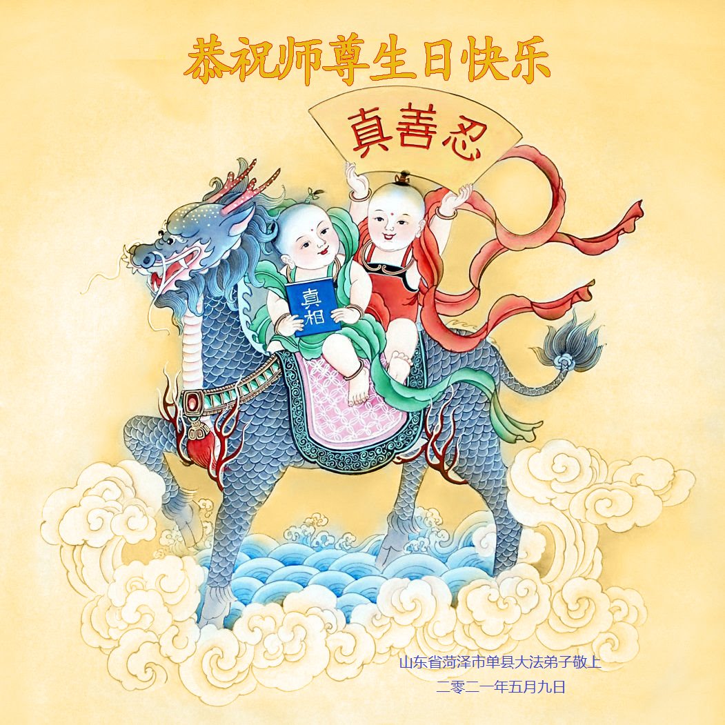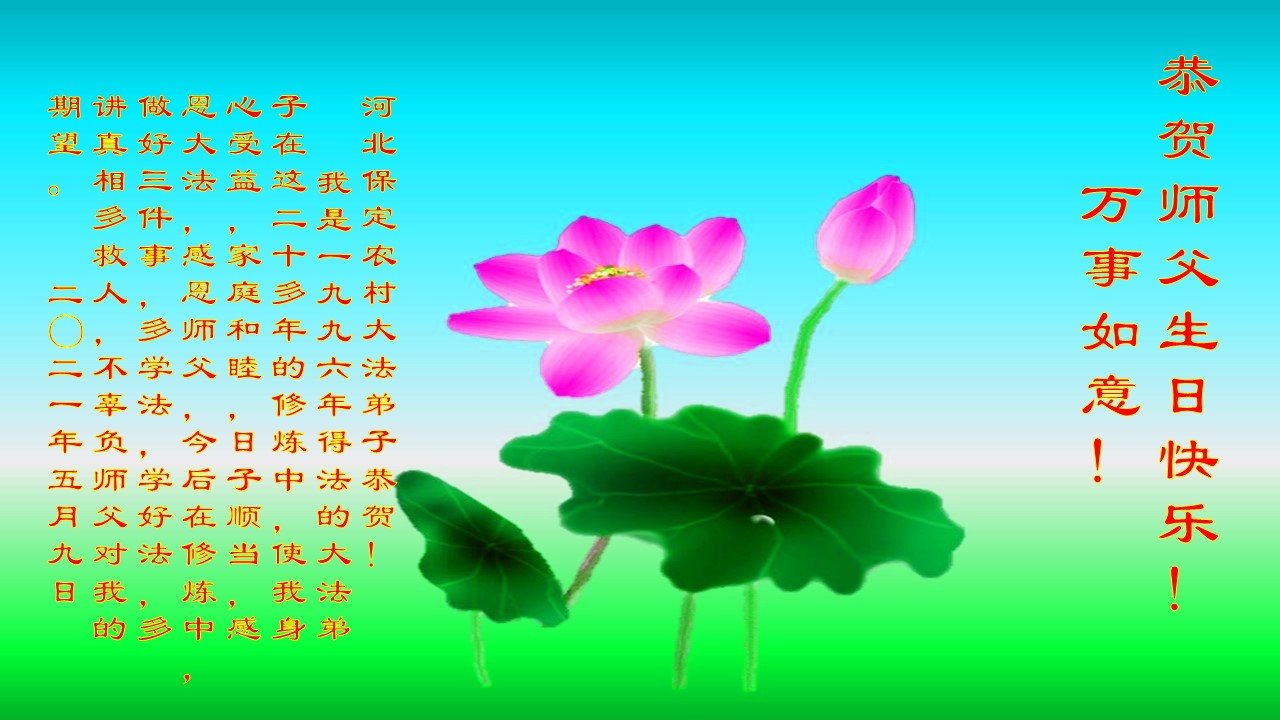 尊敬的师父:您好!您辛苦了!在“五·一三”到来之前,弟子心情好内疚,又一年了,自己提高了多少?回想起来好惭愧,时时事事要师父操心了。弟子有一个心愿:恭祝师父生日快乐!法轮大法好!真善忍好!
