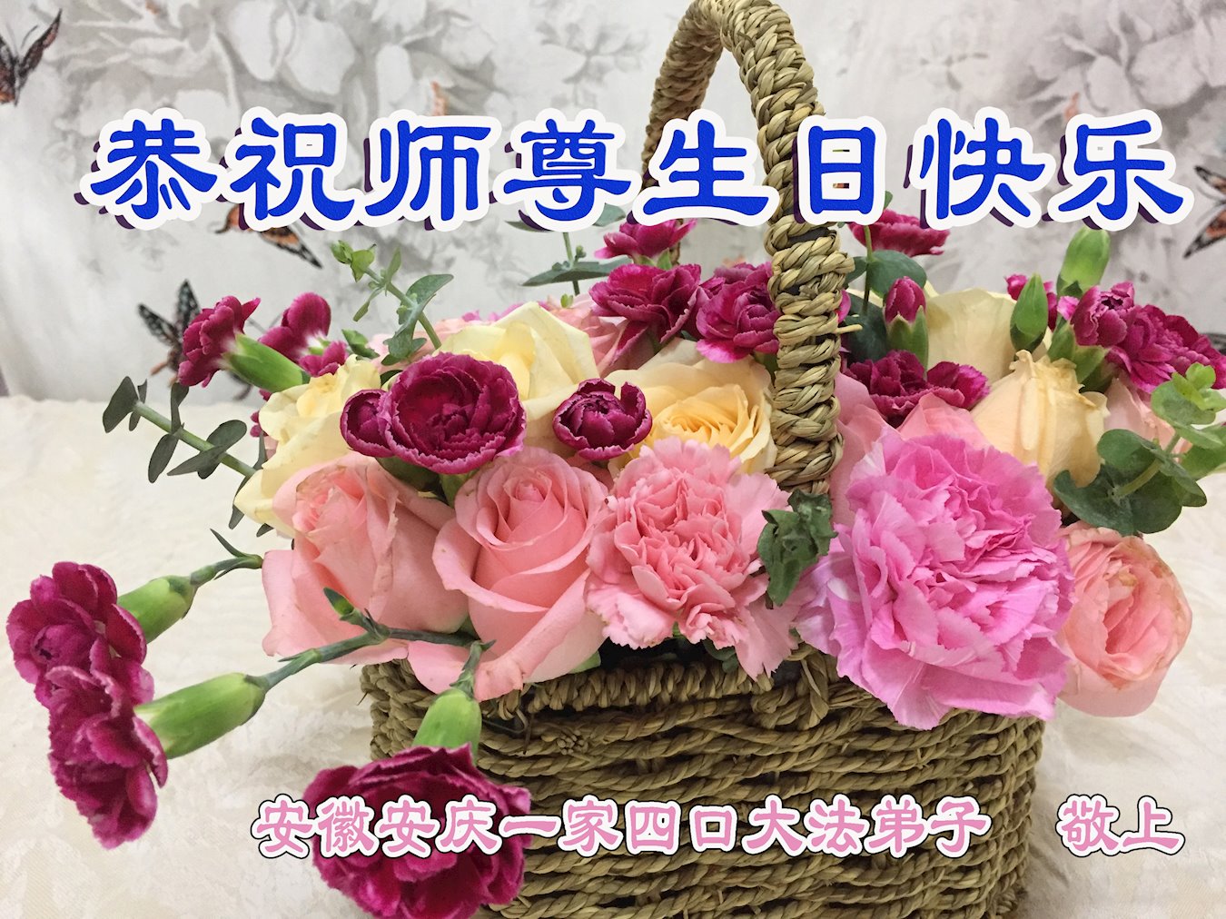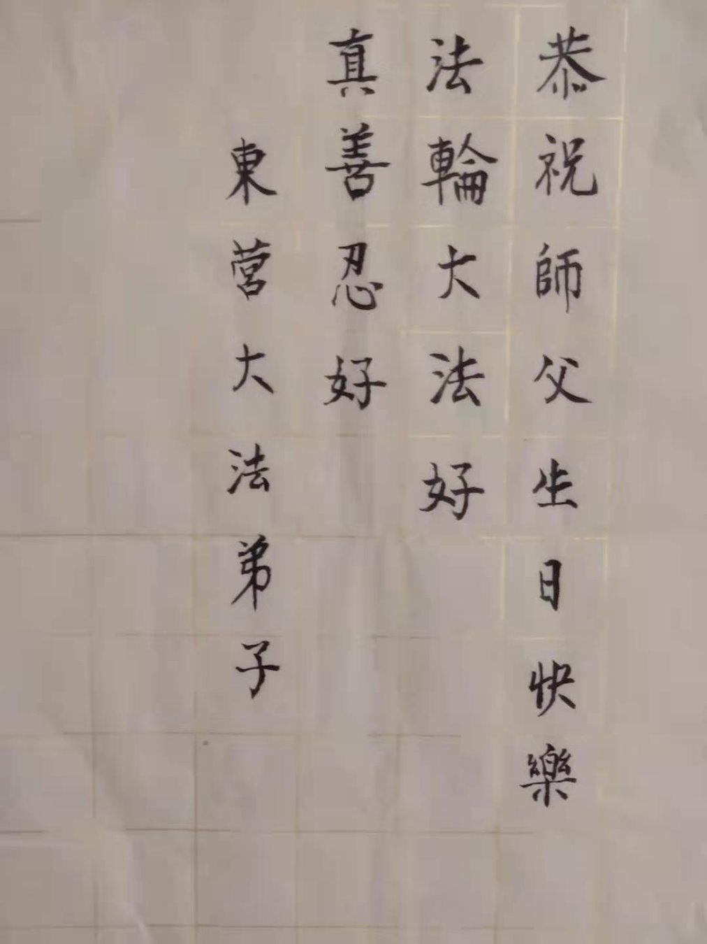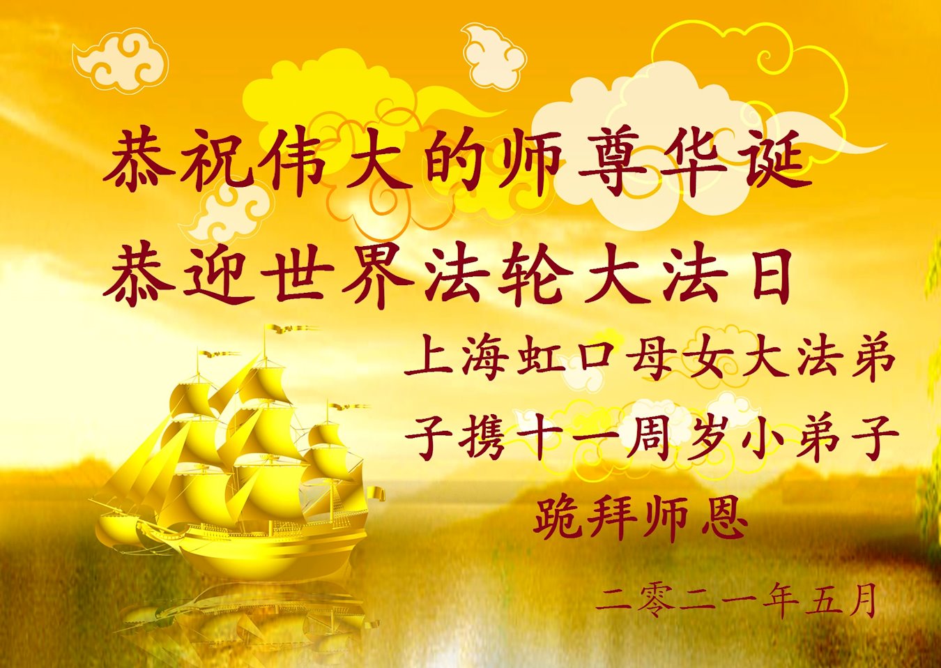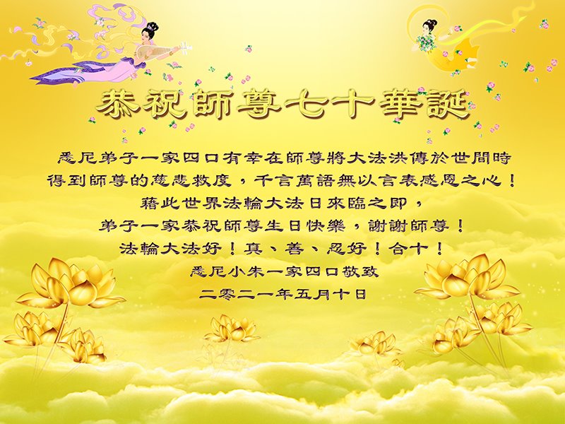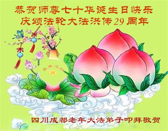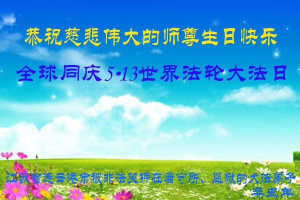 尊敬的师父:您好!您辛苦了!在“五·一三”到来之前,弟子心情好内疚,又一年了,自己提高了多少?回想起来好惭愧,时时事事要师父操心了。弟子有一个心愿:恭祝师父生日快乐!法轮大法好!真善忍好!