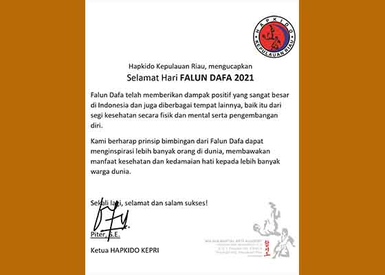 印度尼西亚巴淡岛(廖内群岛)合气道主席皮特先生也发来贺词,祝贺二零二一年法轮大法日的到来。