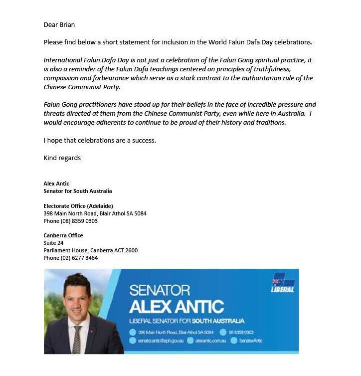 ![]() 图3:澳洲联邦参议员安蒂克(Senator Alex Antic)先生的贺信。 |