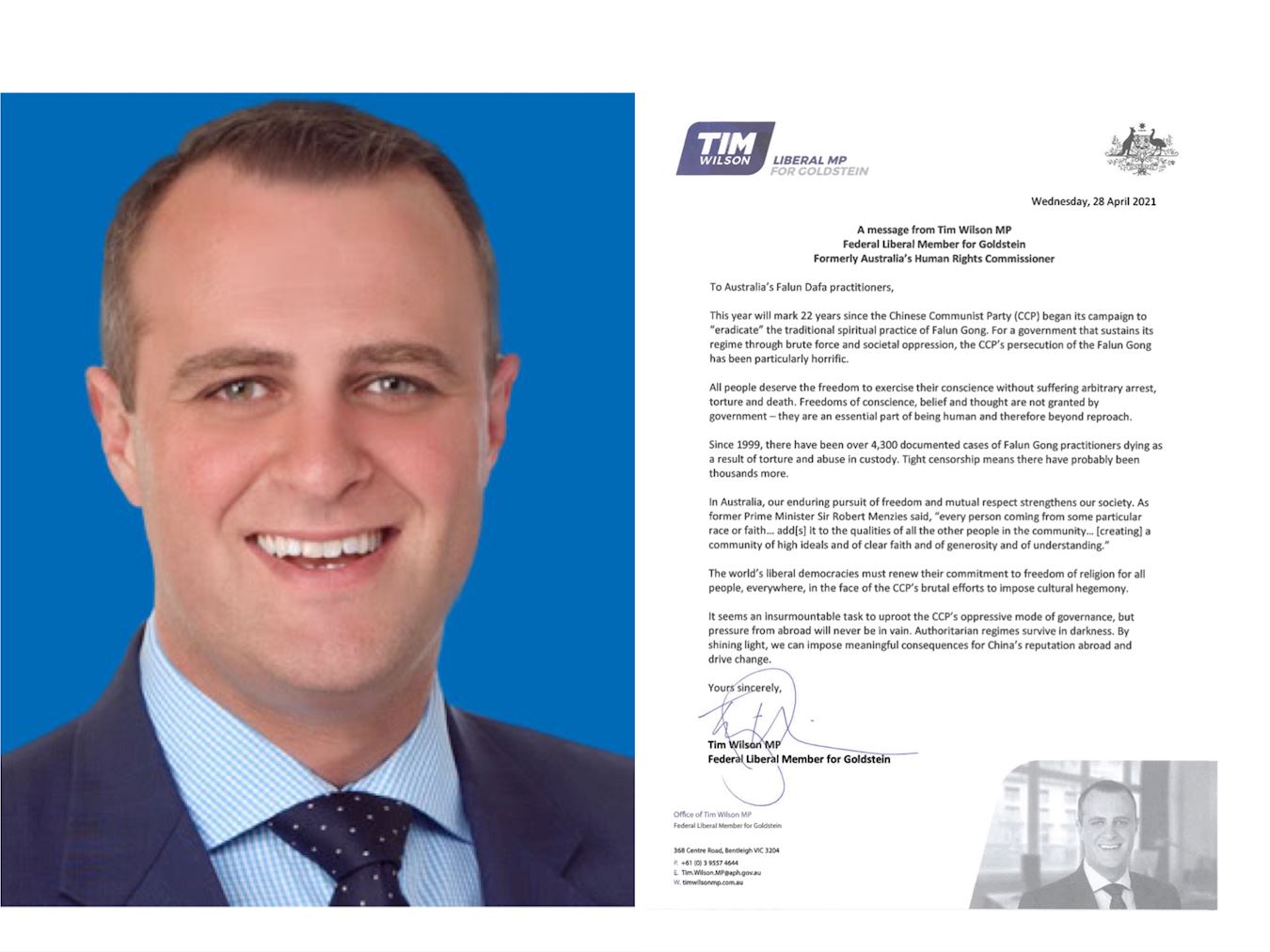 来自维州的自由党联邦议员、前澳洲人权专员威尔森(Tim Wilson MP)先生在支持信中表示: