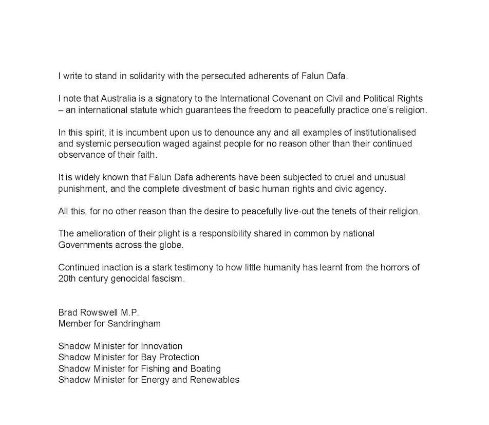 维州州议员罗斯韦尔(Brad Rowswell MP)先生也写信表达了对法轮大法弟子的支持。他说:“众所周知,法轮大法弟子(在中国)遭受了残酷和不寻常的迫害,并被完全剥夺了基本人权和公民权”,而法轮功只是为了和平地践行他们的修炼信仰。他说,澳洲是《公民权利和政治权利国际公约》的签署国,该国际法规保障和平的信仰宗教自由。