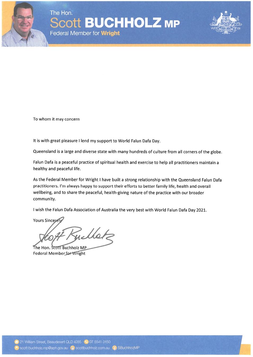 “作为莱特(Wright)选区的联邦议员,我总是乐于支持法轮功为改善家庭生活、健康和整体福祉所做的努力,并与我们更广泛的社区分享和平、健康的修炼功法。”