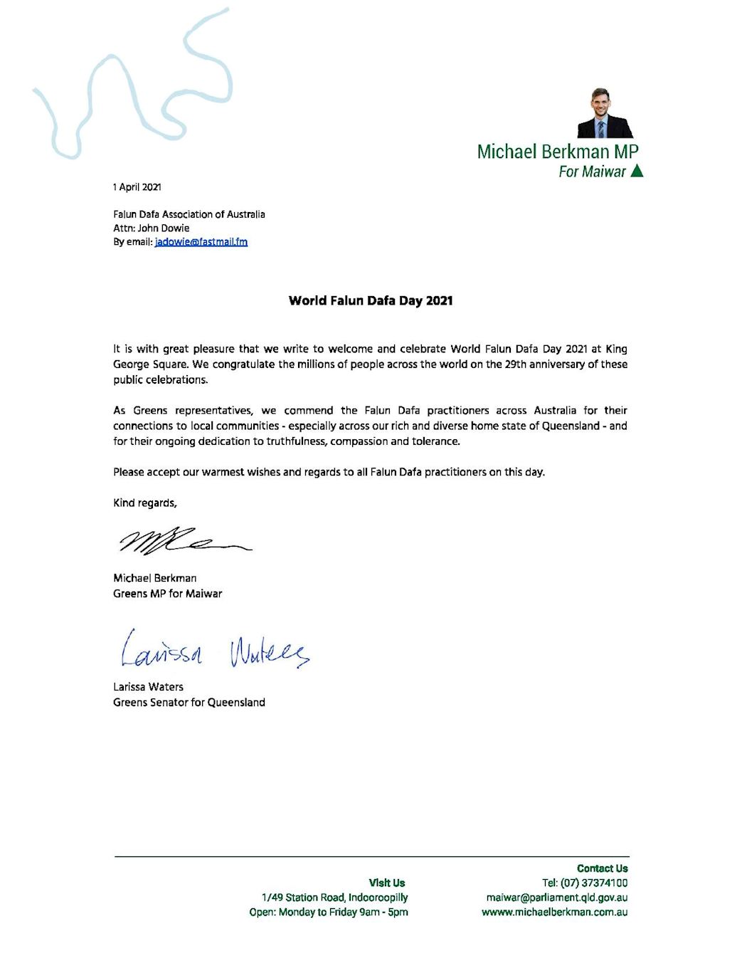 ![]() 图8:联邦参议员沃特斯(Senator Larissa Waters)及昆州迈瓦尔(Maiwar)选区绿党州议员伯克曼(Michael Berkman)联署的贺信。 |
