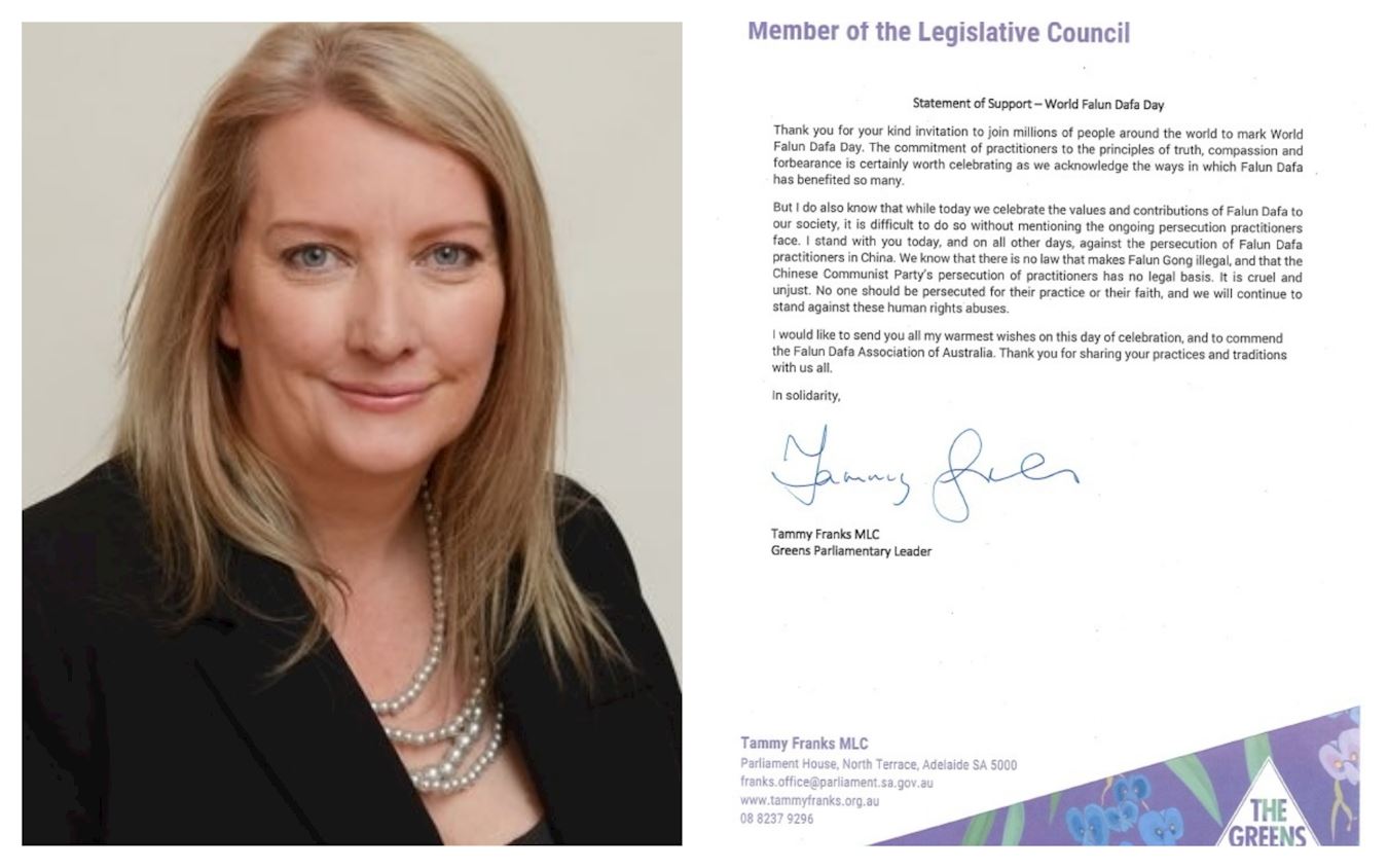 南澳州立法会议员、绿党议会领袖弗兰克斯(Tammy Franks MP)在贺信中说: