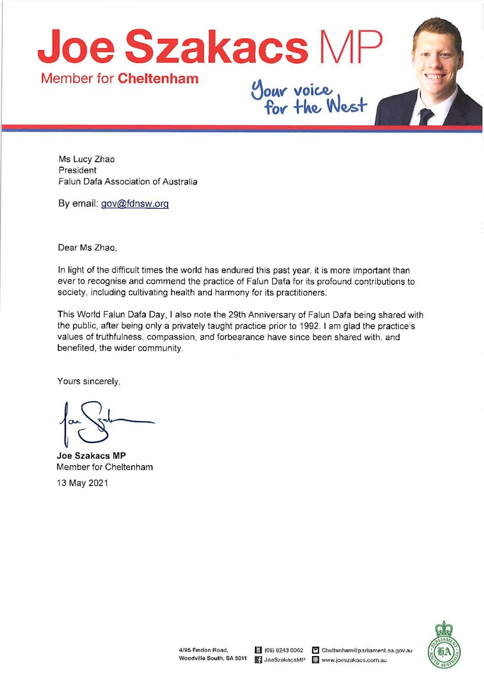 ![]() 图10:南澳州议会议员萨卡奇(Joe Szakacs MP)先生的贺信。 |