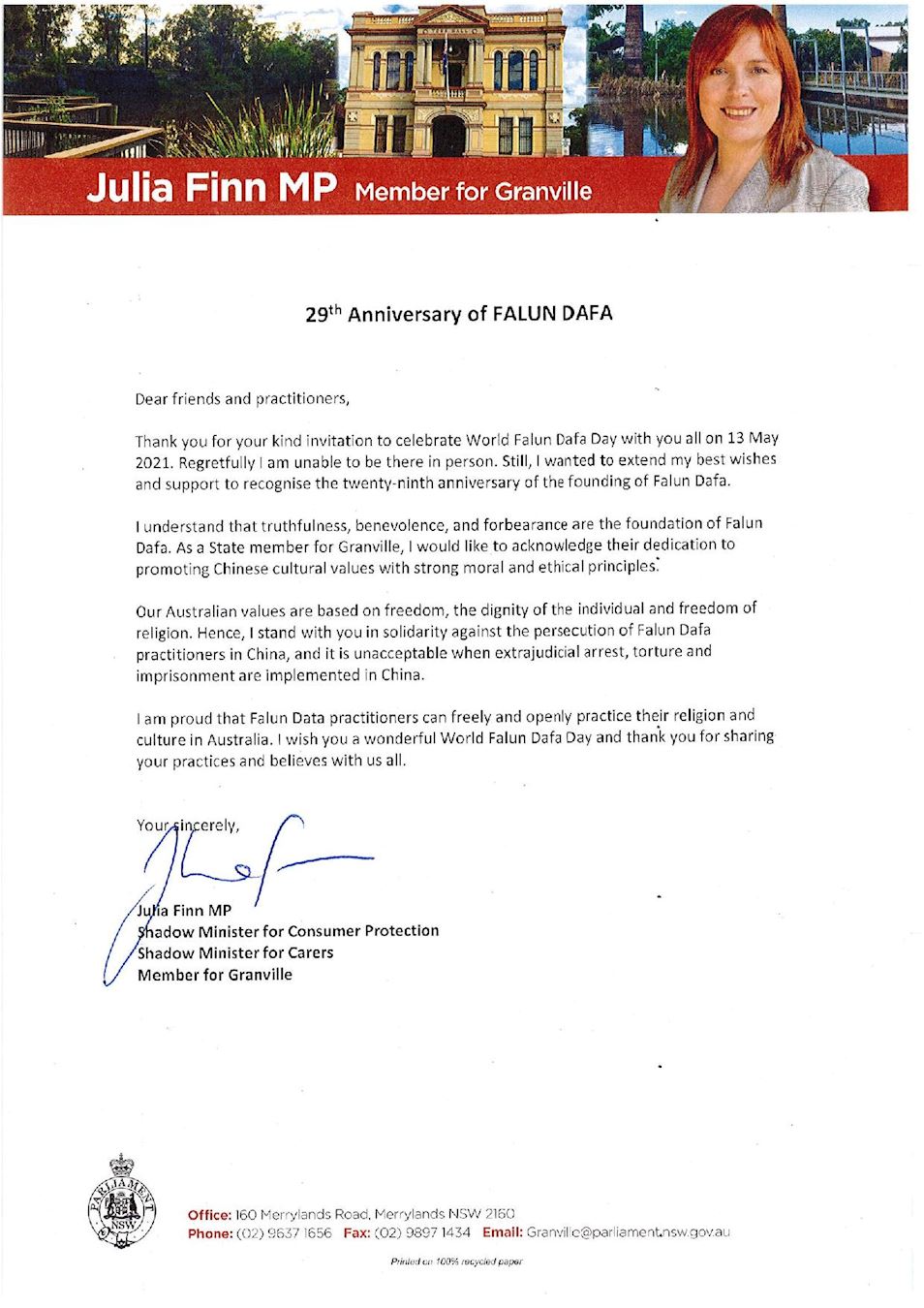 澳洲新州工党州议员、影子消费者权益保护厅长菲恩(Julia Finn MP)女士在贺信中说,“法轮大法洪传二十九周年,对此,我表达最美好的祝愿和支持”。