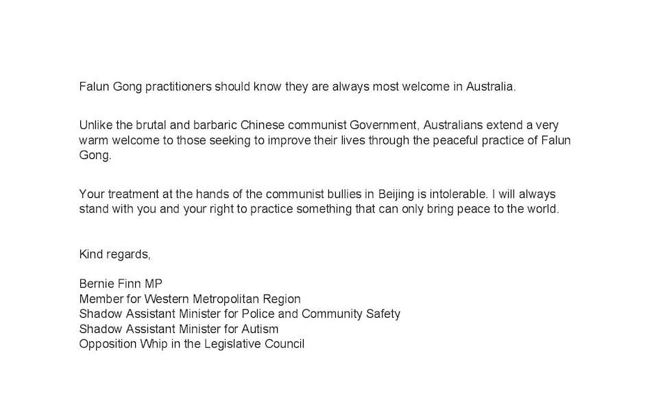 ![]() 图12:维州立法院议员菲恩(Bernie Finn MP)先生的贺信。 |